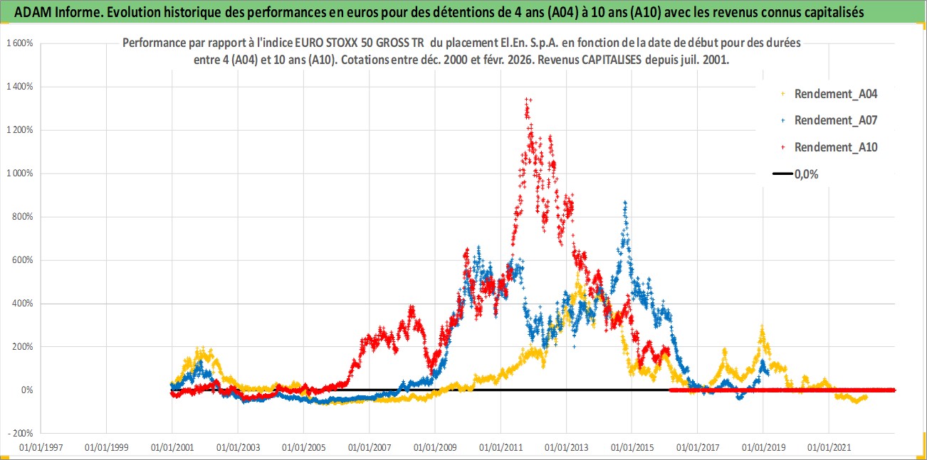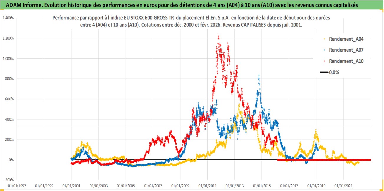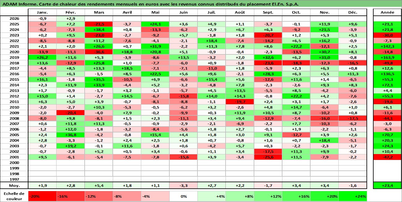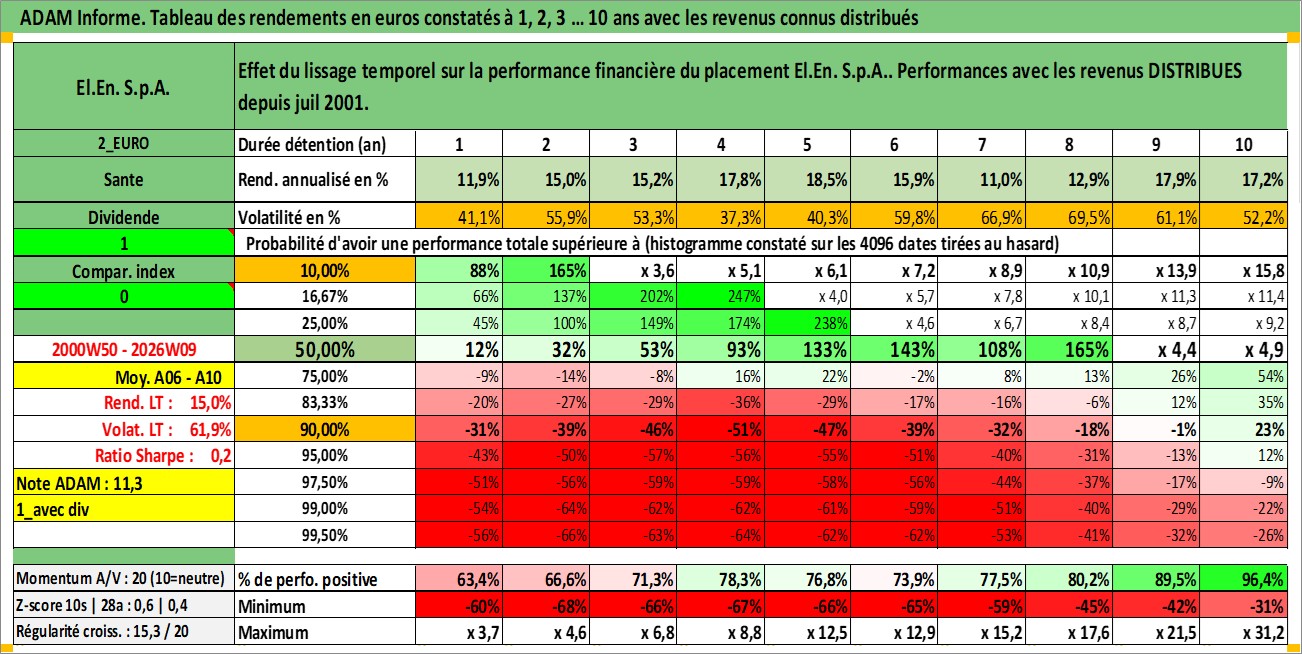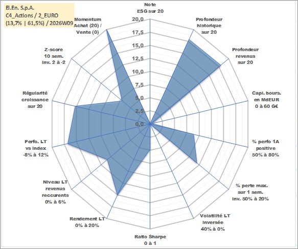 Site dédié aux investisseursPage dédiée sur site financeAnalyse des valorisations hebdomadaires de l'action El.En. S.p.A.. Cet actif est cote en EUR. Les valorisations couvrent les semaines 2000W50 a 2026W09. Les revenus de cet actif financier sont pris en compte depuis la semaine 2001W30. La note ESG de cet actif n'est pas connue.
