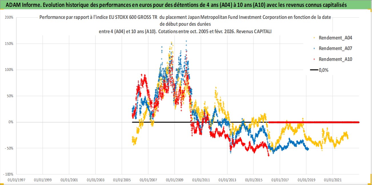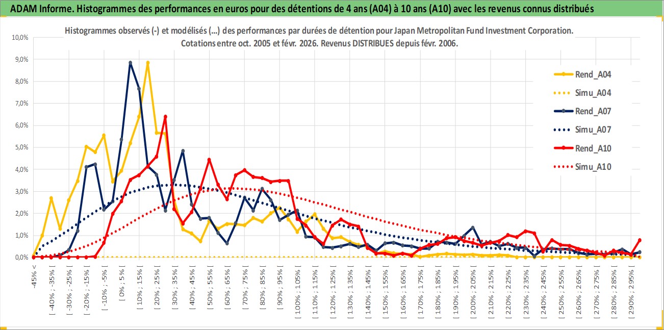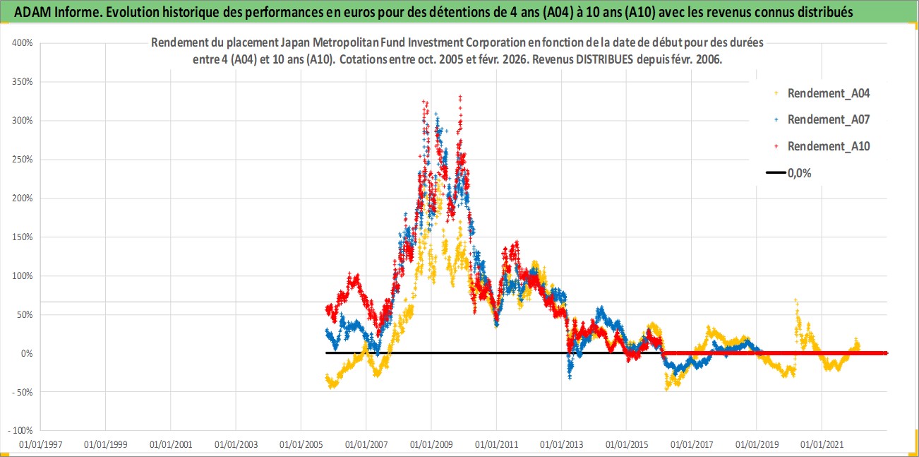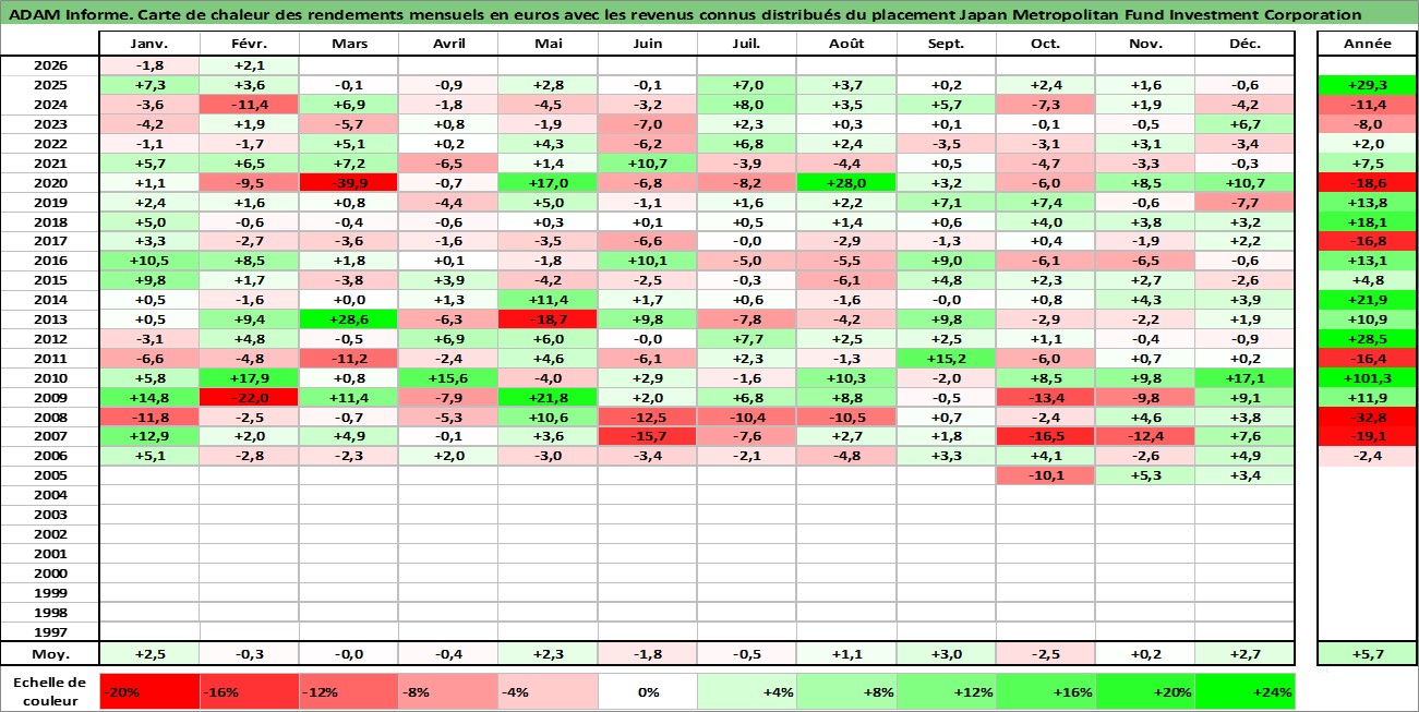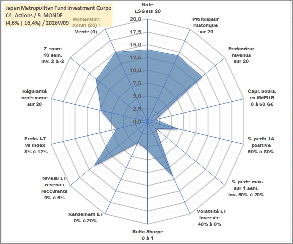Site dédié aux investisseursPage dédiée sur site financeAnalyse des valorisations hebdomadaires de l'action Japan Metropolitan Fund Investment Corporation. Cet actif est cote en JPY. Les valorisations sont en contrevaleur EURO et couvrent les semaines 2005W40 a 2026W09. Les revenus de cet actif financier sont pris en compte depuis la semaine 2006W08. La note globale ESG de cet actif est estimee a 14.0 (apres rebasage entre 0 et 20).