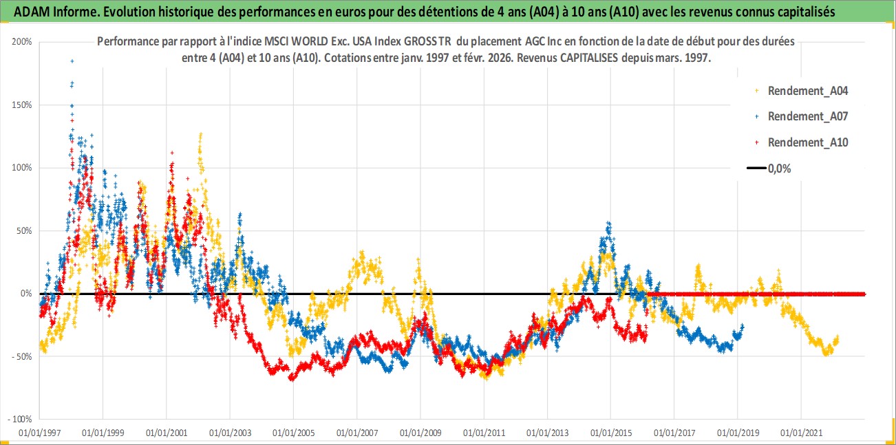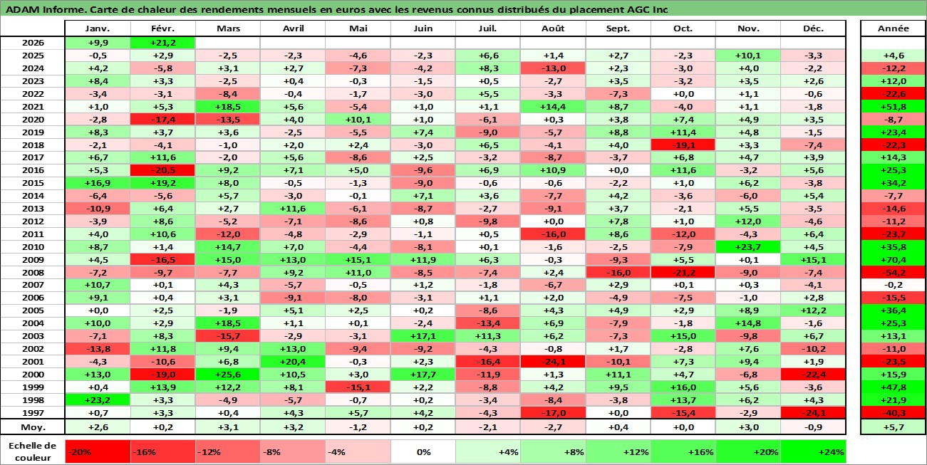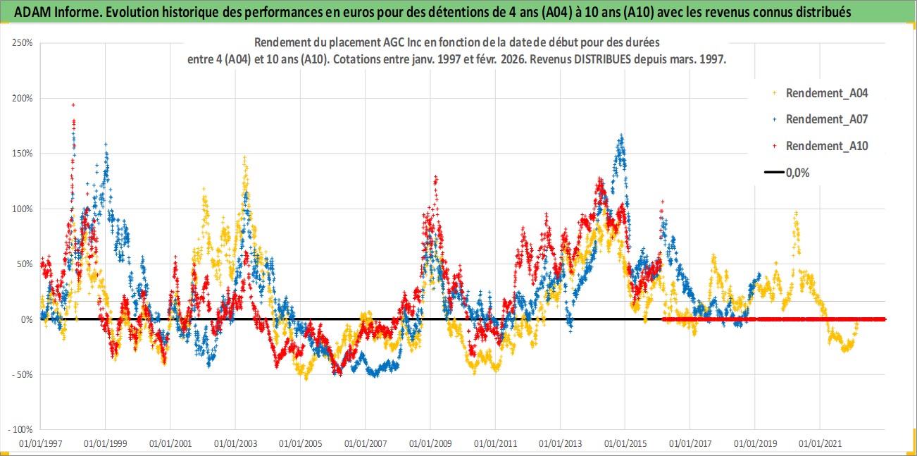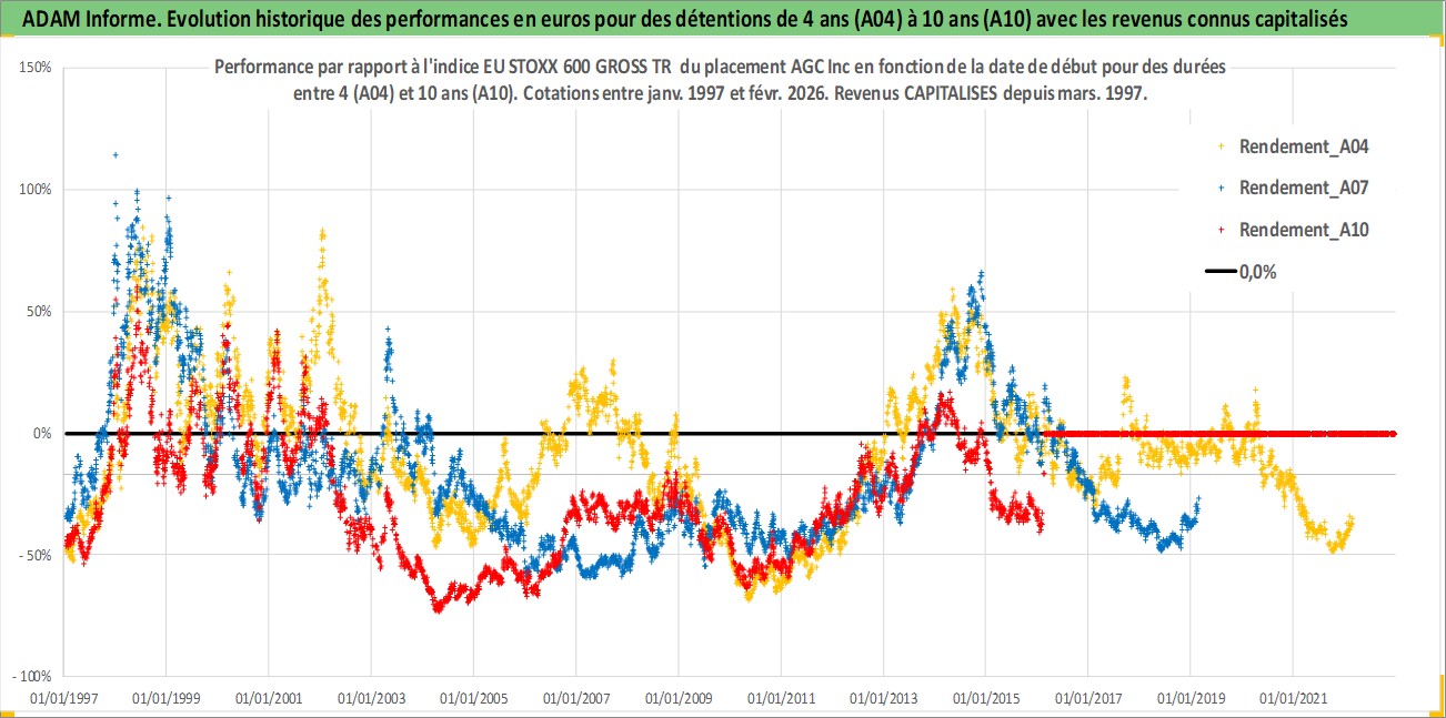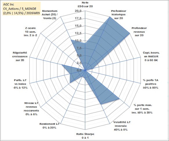 Site dédié aux investisseursPage dédiée sur site financeAnalyse des valorisations hebdomadaires de l'action AGC Inc. Cet actif est cote en JPY. Les valorisations sont en contrevaleur EURO et couvrent les semaines 1997W01 a 2026W09. Les revenus de cet actif financier sont pris en compte depuis la semaine 1997W13. La note globale ESG de cet actif est estimee a 9.0 (apres rebasage entre 0 et 20).