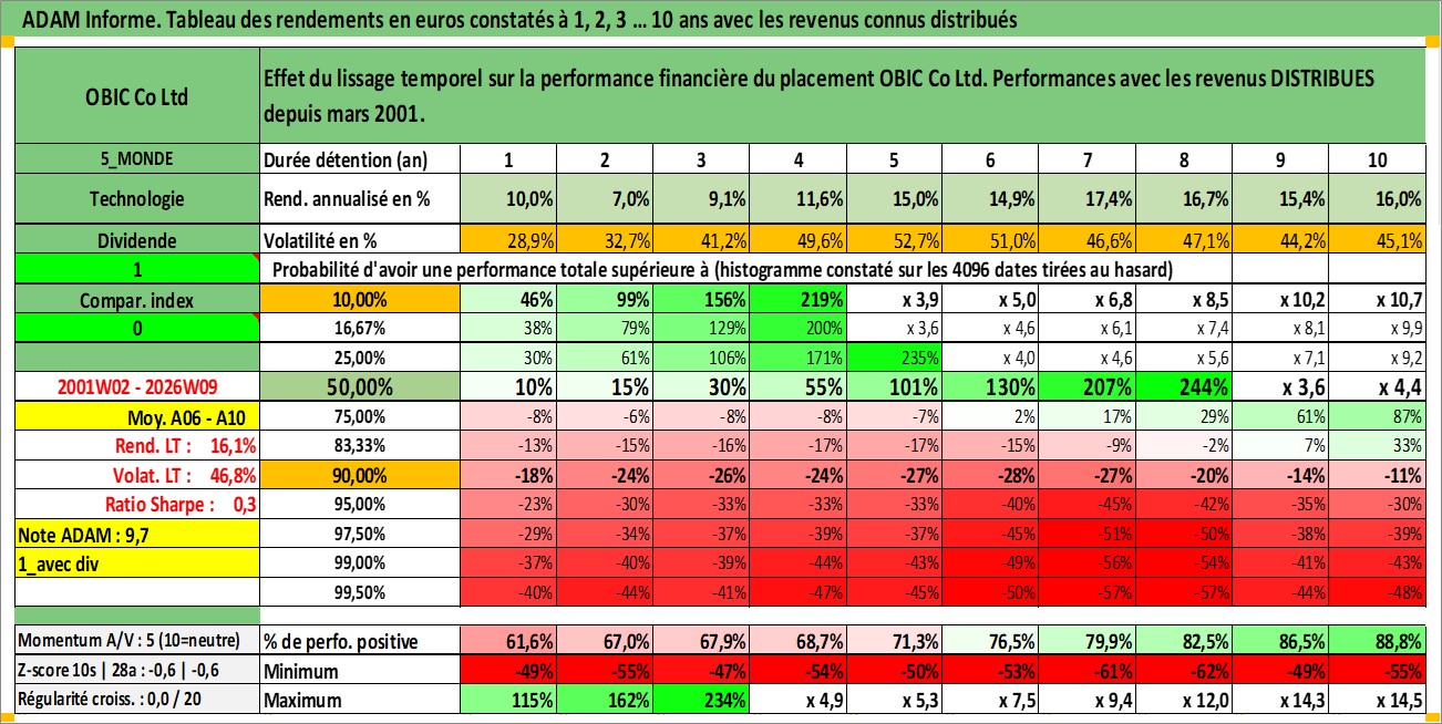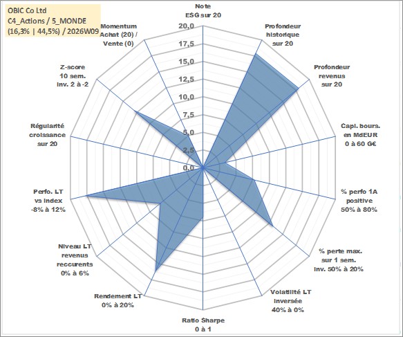 Site dédié aux investisseursPage dédiée sur site financeAnalyse des valorisations hebdomadaires de l'action OBIC Co Ltd. Cet actif est cote en JPY. Les valorisations sont en contrevaleur EURO et couvrent les semaines 2001W02 a 2026W09. Les revenus de cet actif financier sont pris en compte depuis la semaine 2001W13. La note ESG de cet actif n'est pas connue.