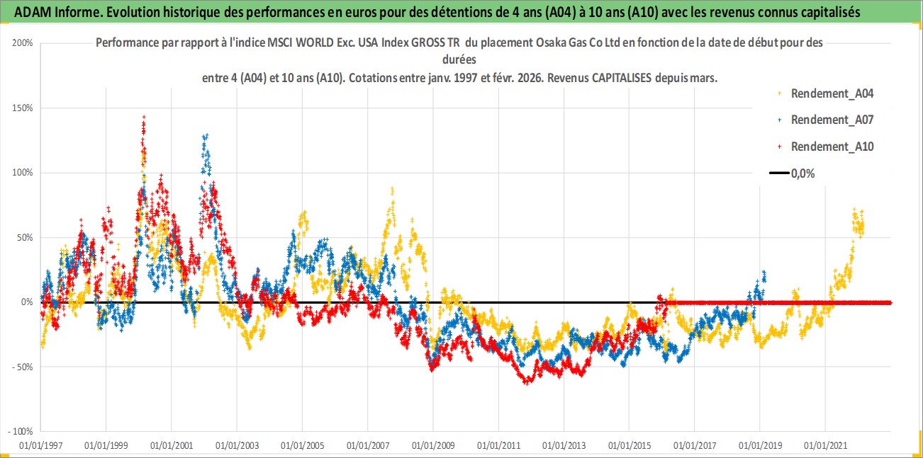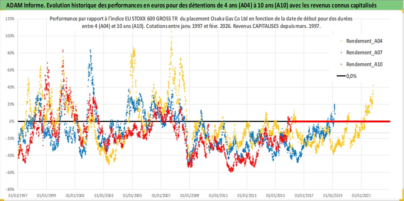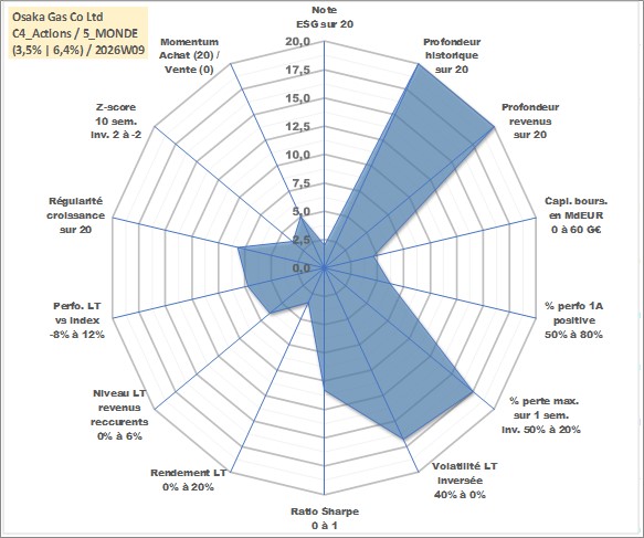 Site dédié aux investisseursPage dédiée sur site financeAnalyse des valorisations hebdomadaires de l'action Osaka Gas Co Ltd. Cet actif est cote en JPY. Les valorisations sont en contrevaleur EURO et couvrent les semaines 1997W01 a 2026W09. Les revenus de cet actif financier sont pris en compte depuis la semaine 1997W13. La note globale ESG de cet actif est estimee a 2.0 (apres rebasage entre 0 et 20).