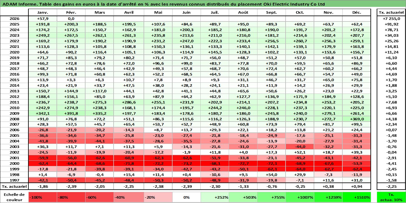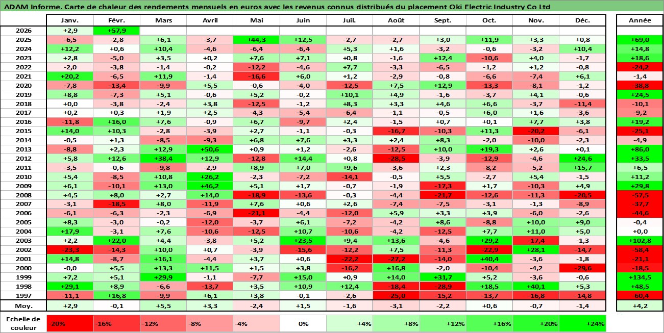 Site dédié aux investisseursPage dédiée sur site financeAnalyse des valorisations hebdomadaires de l'action Oki Electric Industry Co Ltd. Cet actif est cote en JPY. Les valorisations sont en contrevaleur EURO et couvrent les semaines 1997W01 a 2026W09. Les revenus de cet actif financier sont pris en compte depuis la semaine 1997W13. La note ESG de cet actif n'est pas connue.