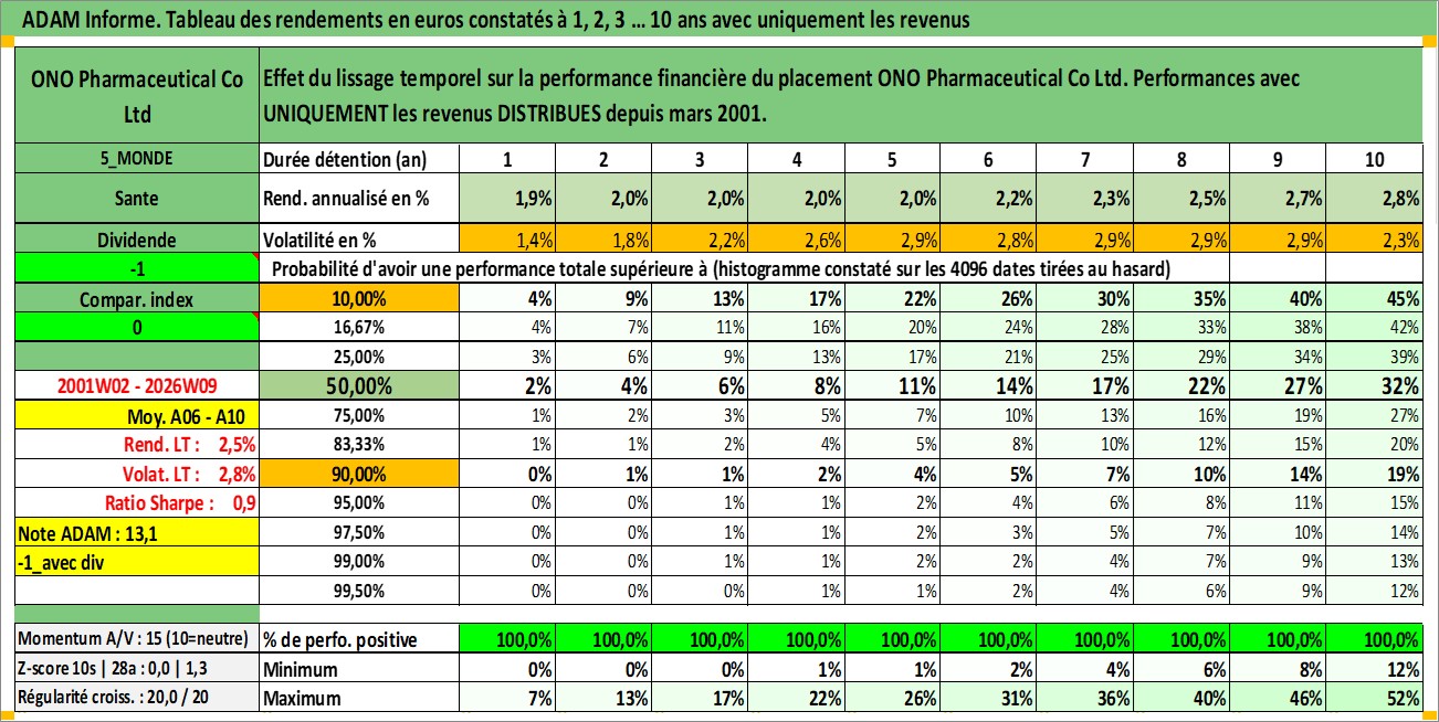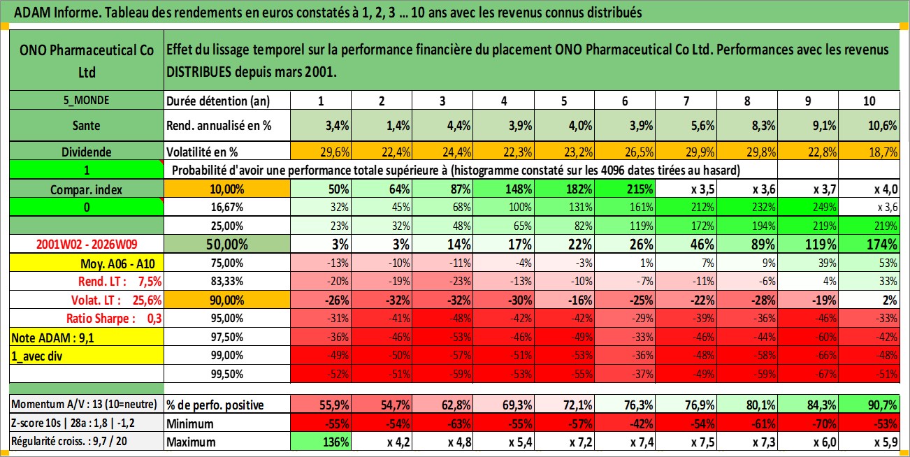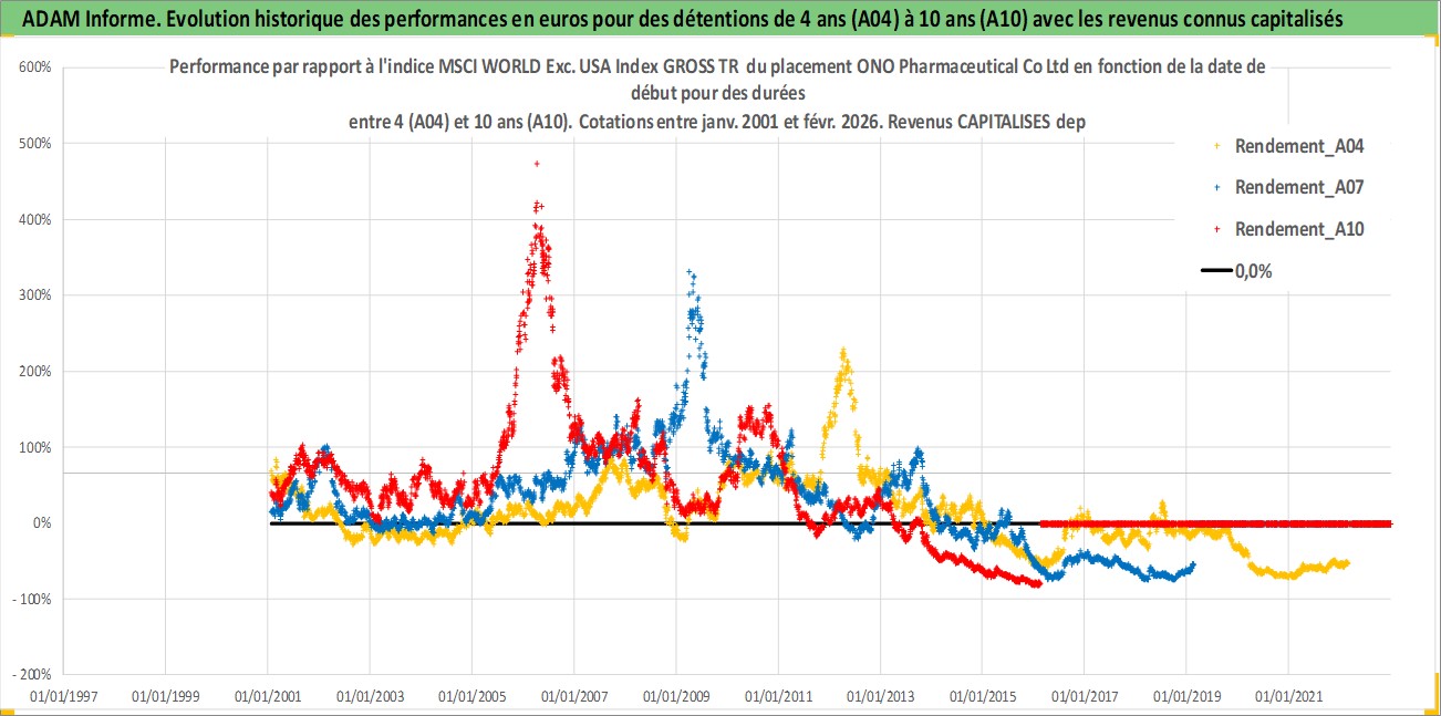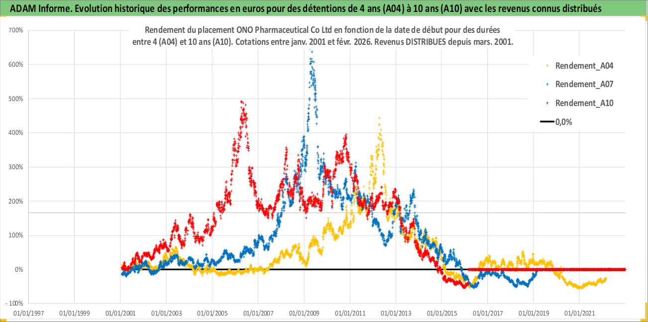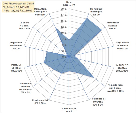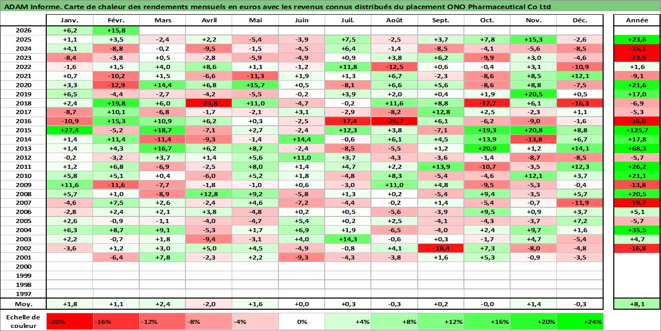 Site dédié aux investisseursPage dédiée sur site financeAnalyse des valorisations hebdomadaires de l'action ONO Pharmaceutical Co Ltd. Cet actif est cote en JPY. Les valorisations sont en contrevaleur EURO et couvrent les semaines 2001W02 a 2026W09. Les revenus de cet actif financier sont pris en compte depuis la semaine 2001W13. La note globale ESG de cet actif est estimee a 7.0 (apres rebasage entre 0 et 20).