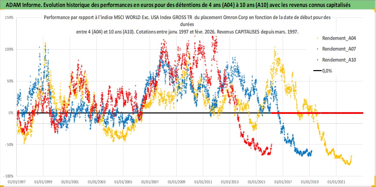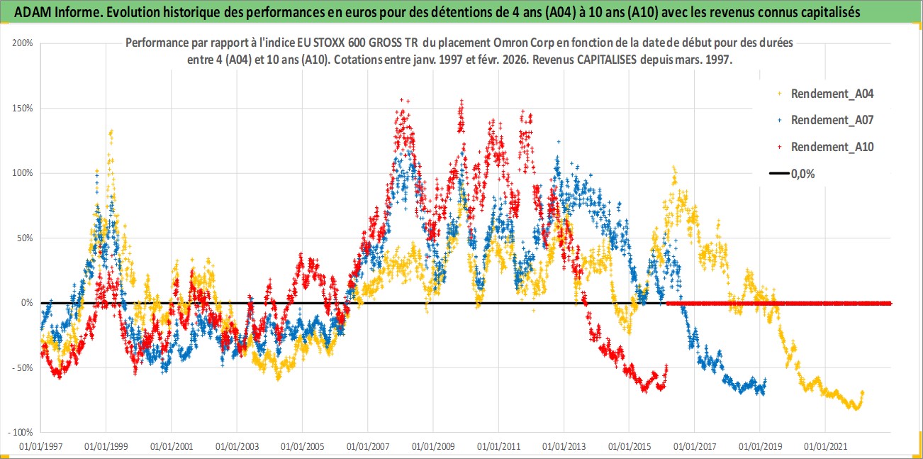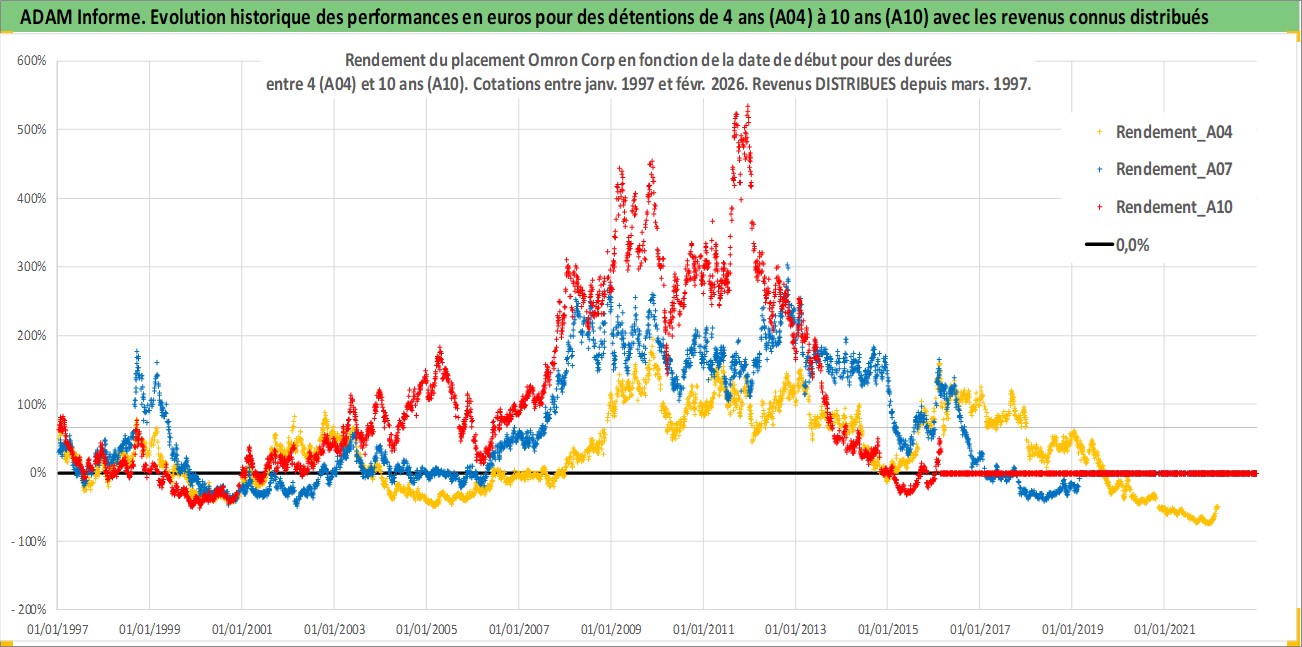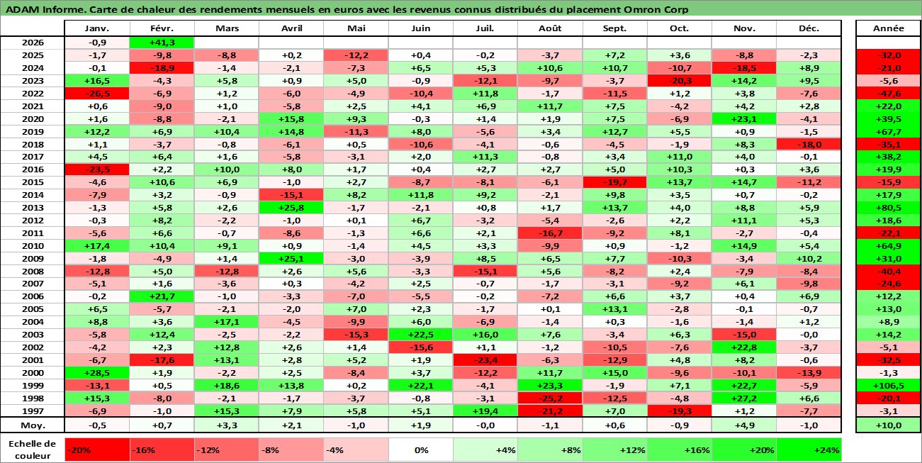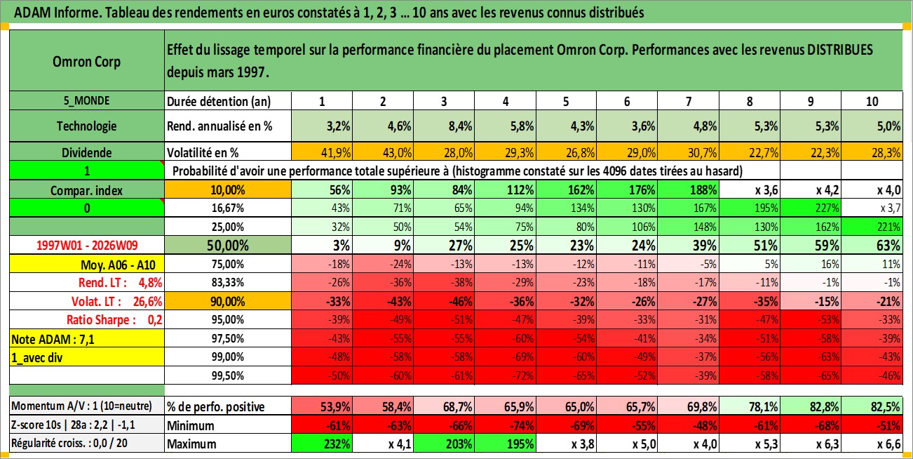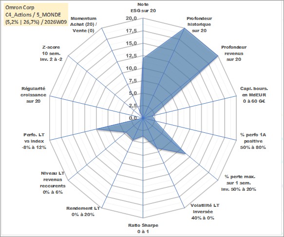 Site dédié aux investisseursPage dédiée sur site financeAnalyse des valorisations hebdomadaires de l'action Omron Corp. Cet actif est cote en JPY. Les valorisations sont en contrevaleur EURO et couvrent les semaines 1997W01 a 2026W09. Les revenus de cet actif financier sont pris en compte depuis la semaine 1997W13. La note globale ESG de cet actif est estimee a 12.0 (apres rebasage entre 0 et 20).