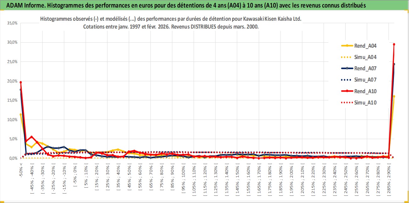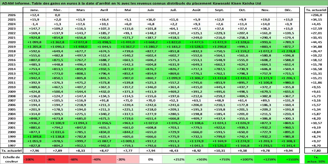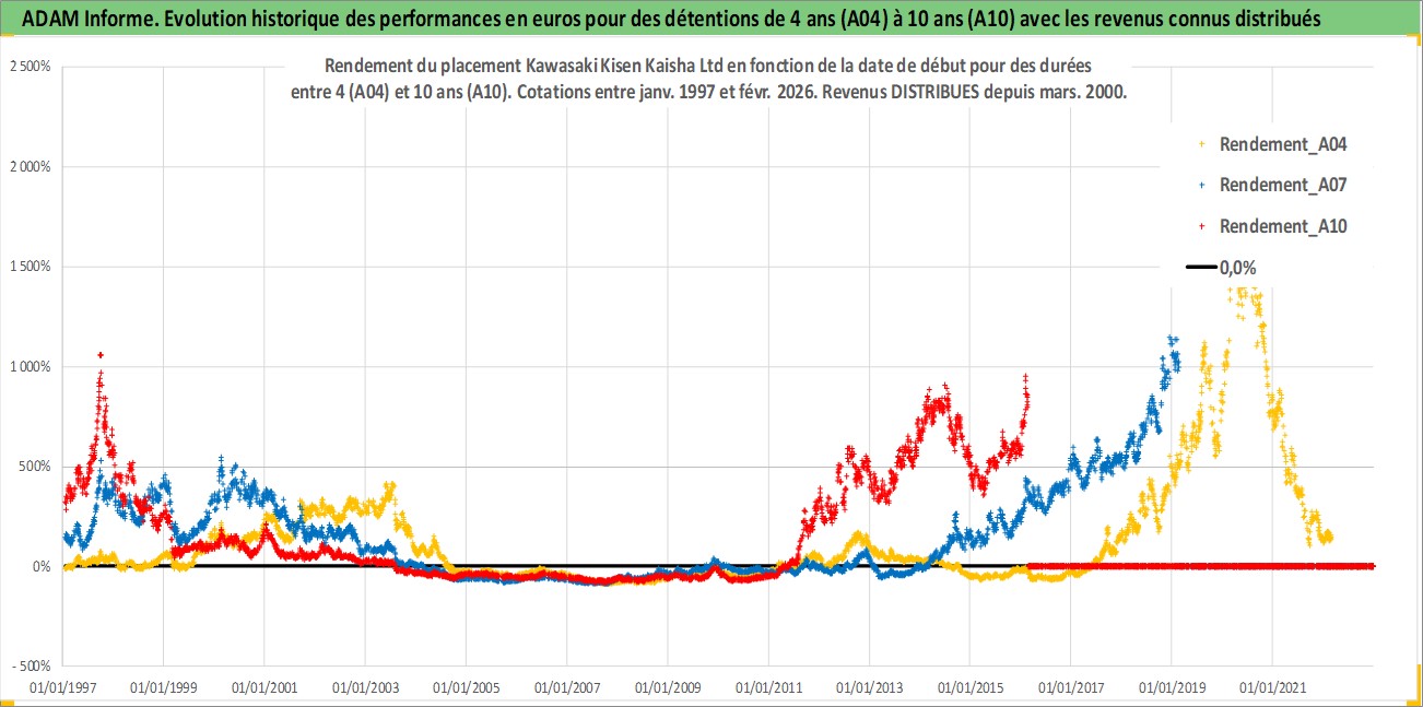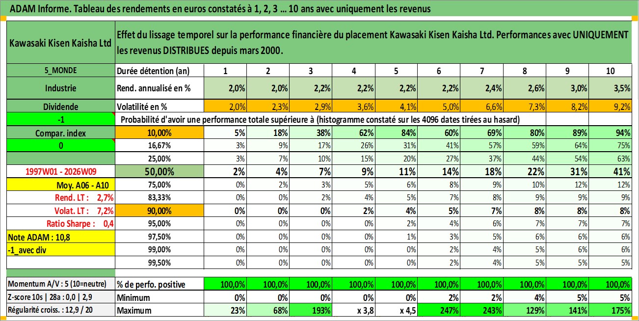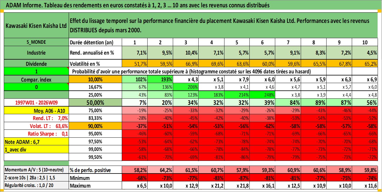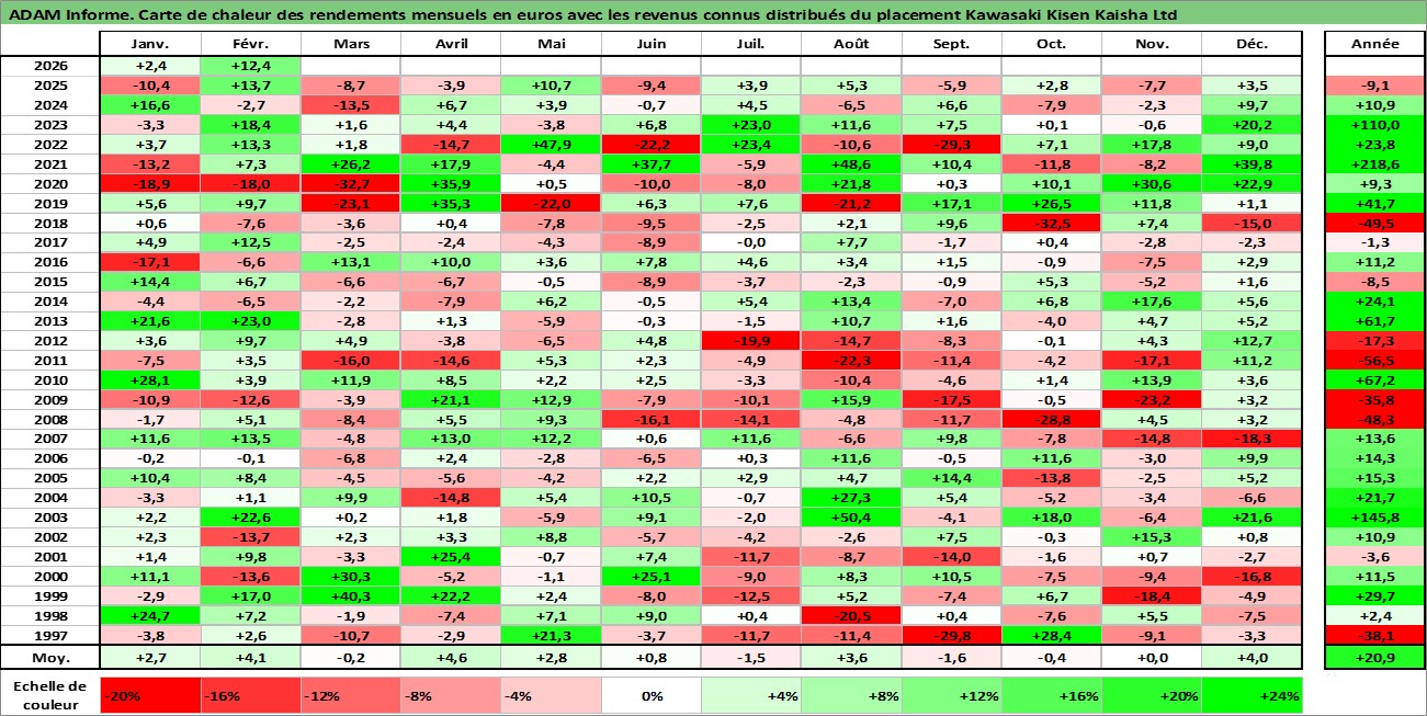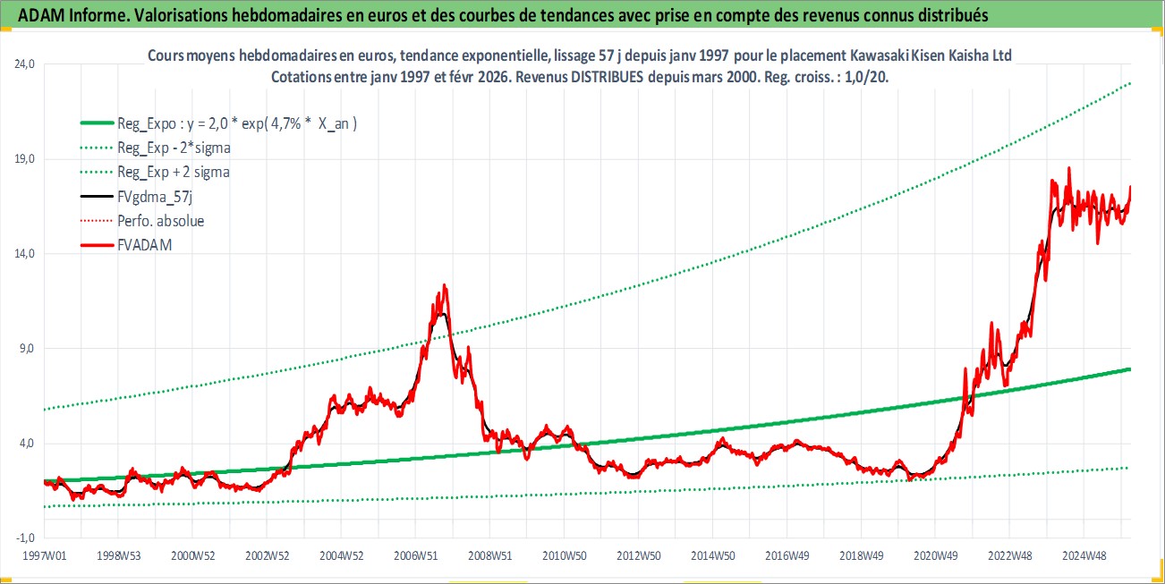 Site dédié aux investisseursPage dédiée sur site financeAnalyse des valorisations hebdomadaires de l'action Kawasaki Kisen Kaisha Ltd. Cet actif est cote en JPY. Les valorisations sont en contrevaleur EURO et couvrent les semaines 1997W01 a 2026W09. Les revenus de cet actif financier sont pris en compte depuis la semaine 2000W13. La note ESG de cet actif n'est pas connue.