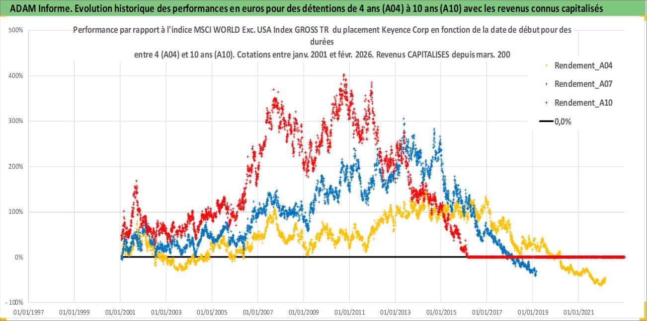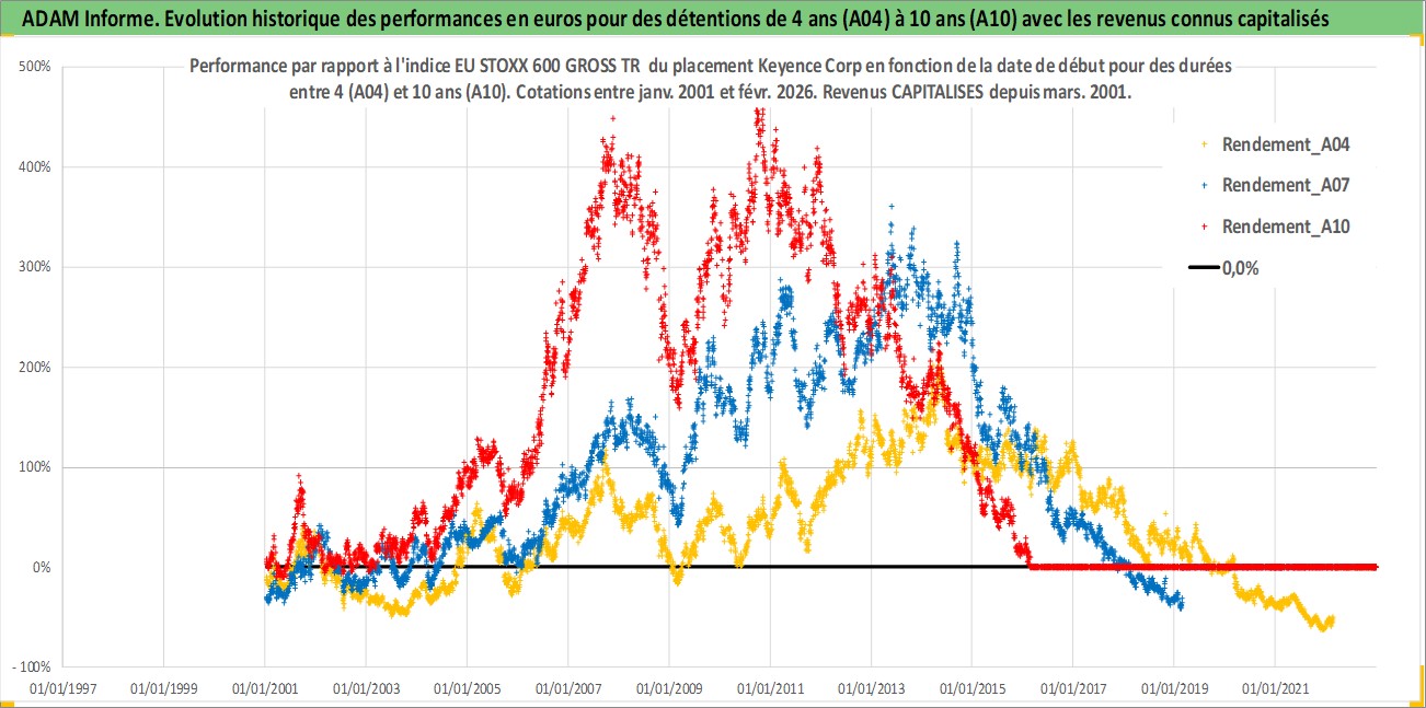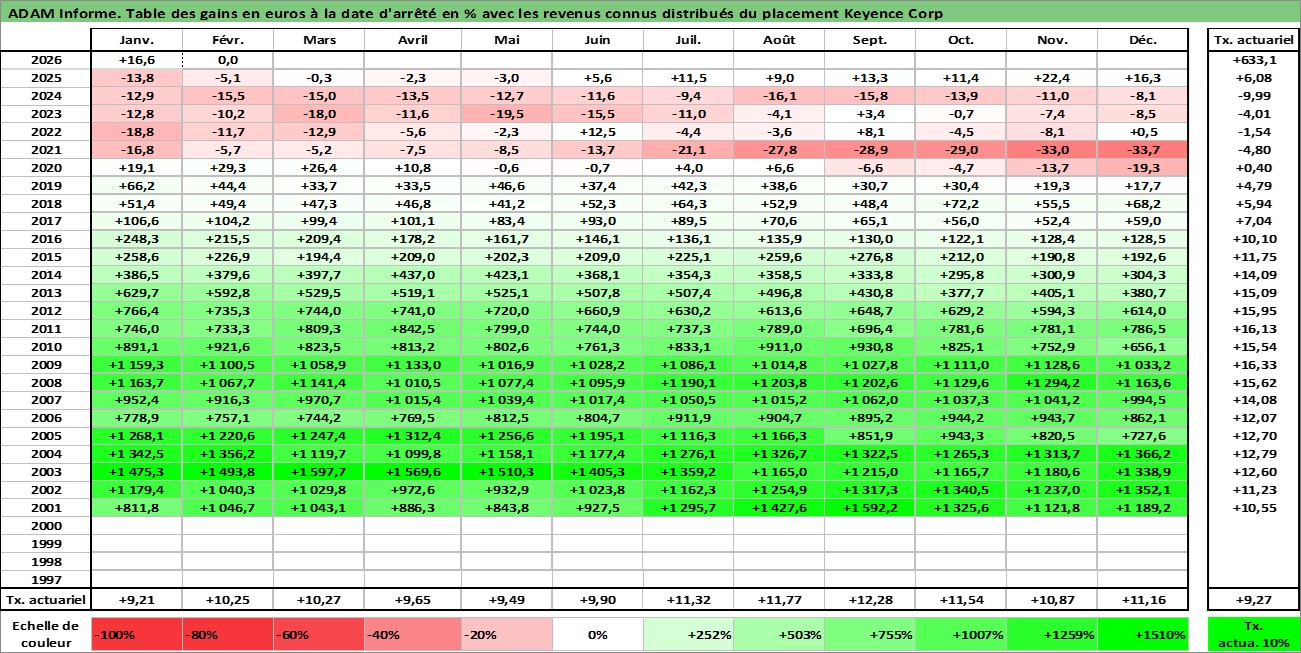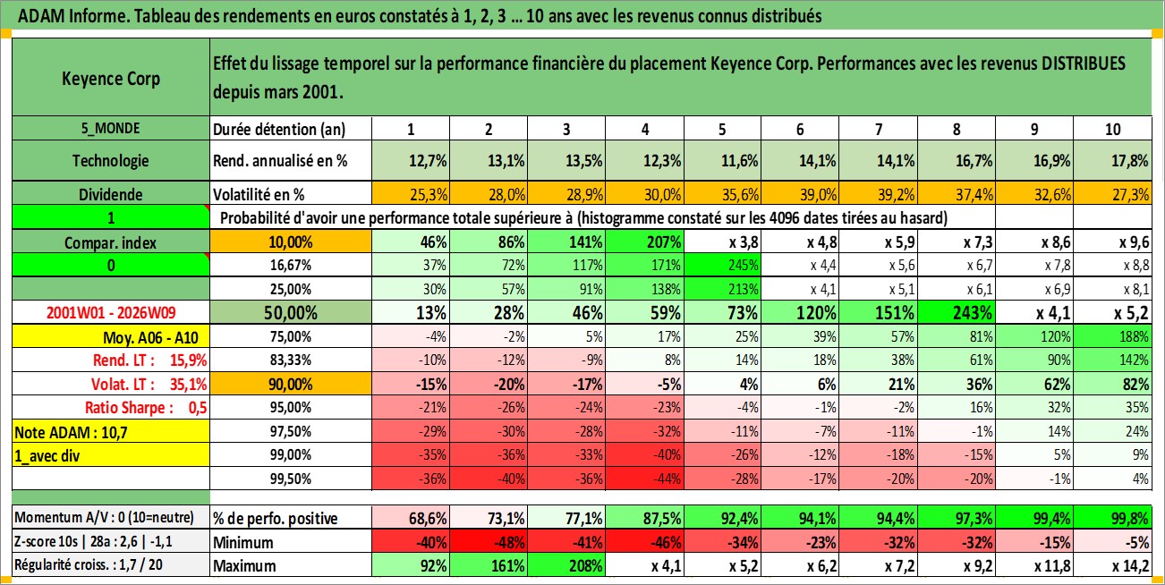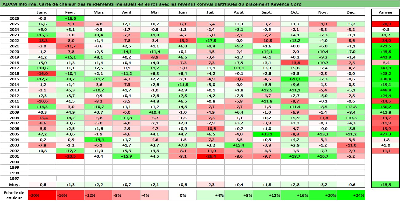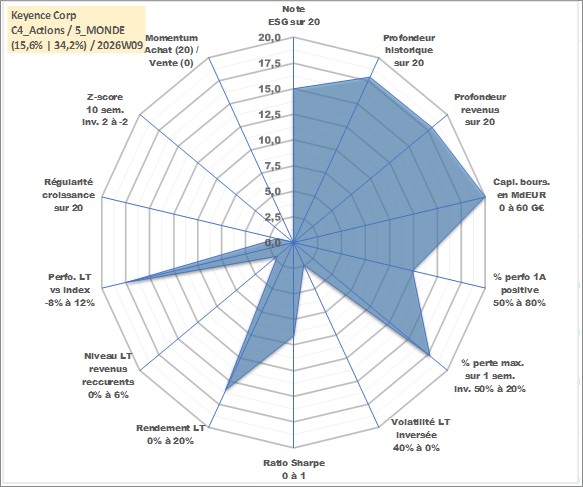 Site dédié aux investisseursPage dédiée sur site financeAnalyse des valorisations hebdomadaires de l'action Keyence Corp. Cet actif est cote en JPY. Les valorisations sont en contrevaleur EURO et couvrent les semaines 2001W01 a 2026W09. Les revenus de cet actif financier sont pris en compte depuis la semaine 2001W11. La note globale ESG de cet actif est estimee a 15.0 (apres rebasage entre 0 et 20).