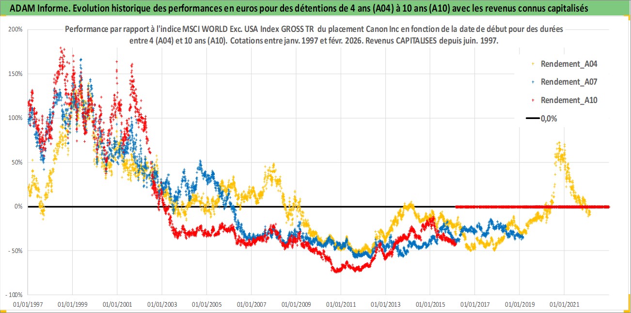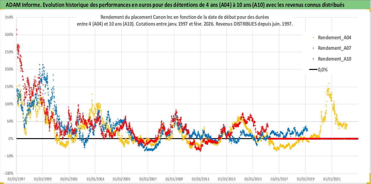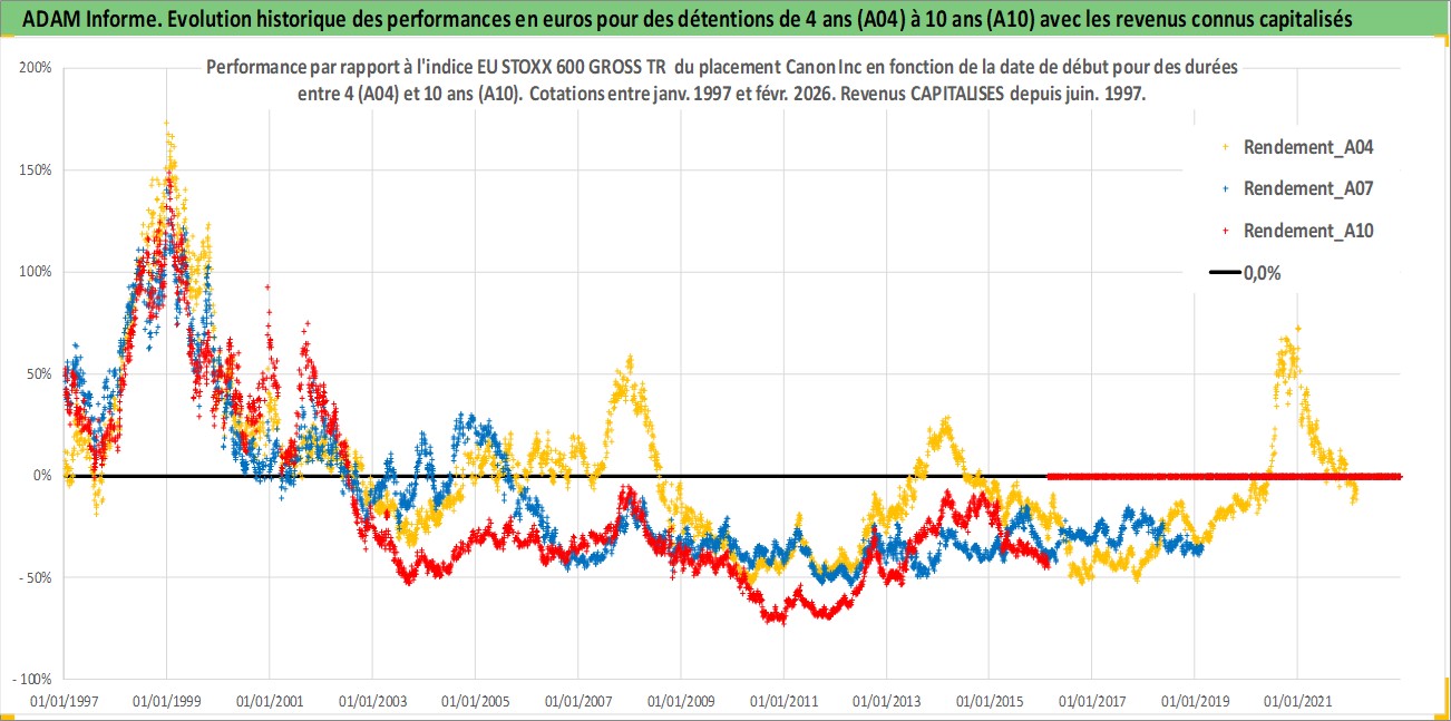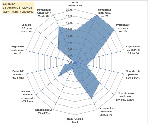 Site dédié aux investisseursPage dédiée sur site financeAnalyse des valorisations hebdomadaires de l'action Canon Inc. Cet actif est cote en JPY. Les valorisations sont en contrevaleur EURO et couvrent les semaines 1997W01 a 2026W09. Les revenus de cet actif financier sont pris en compte depuis la semaine 1997W26. La note globale ESG de cet actif est estimee a 12.0 (apres rebasage entre 0 et 20).