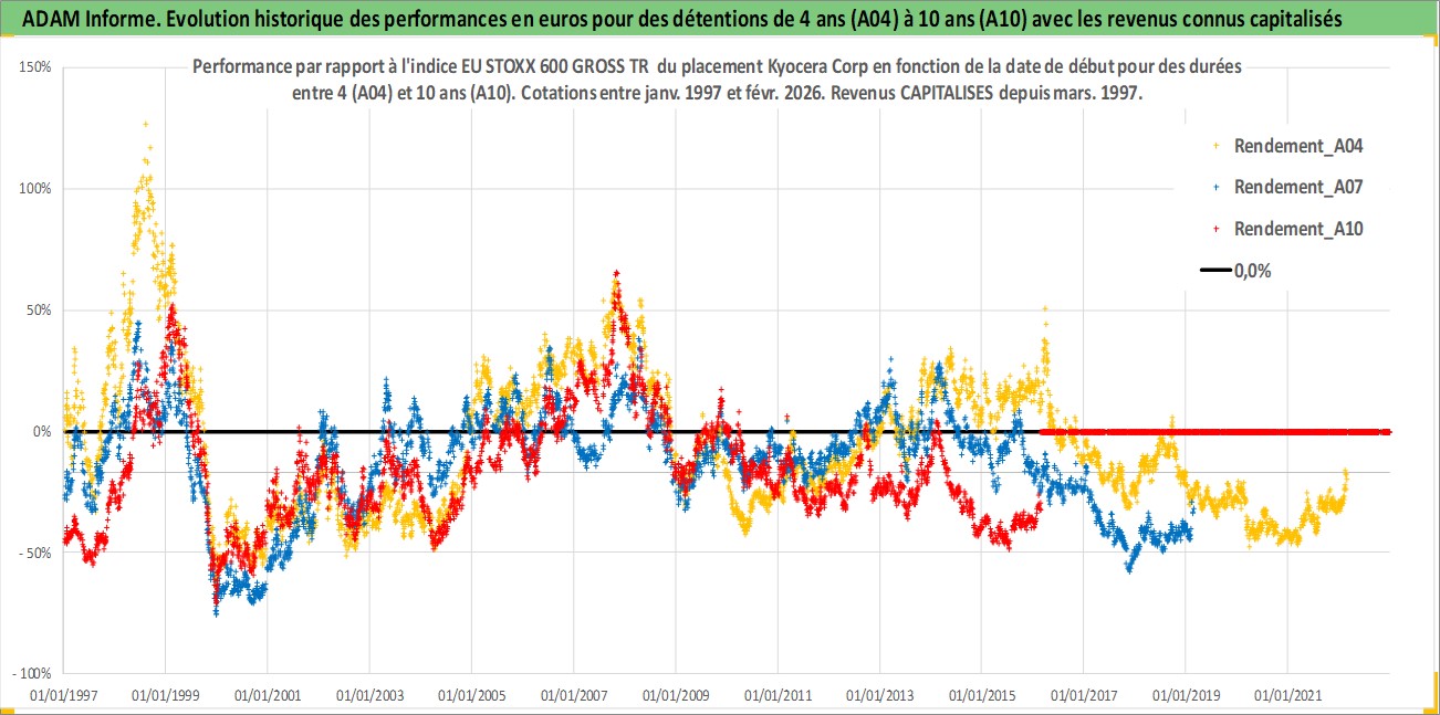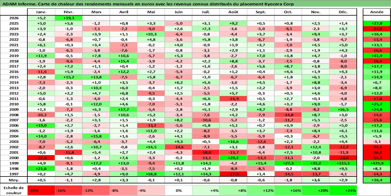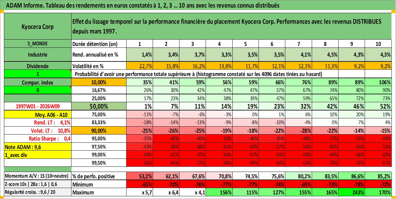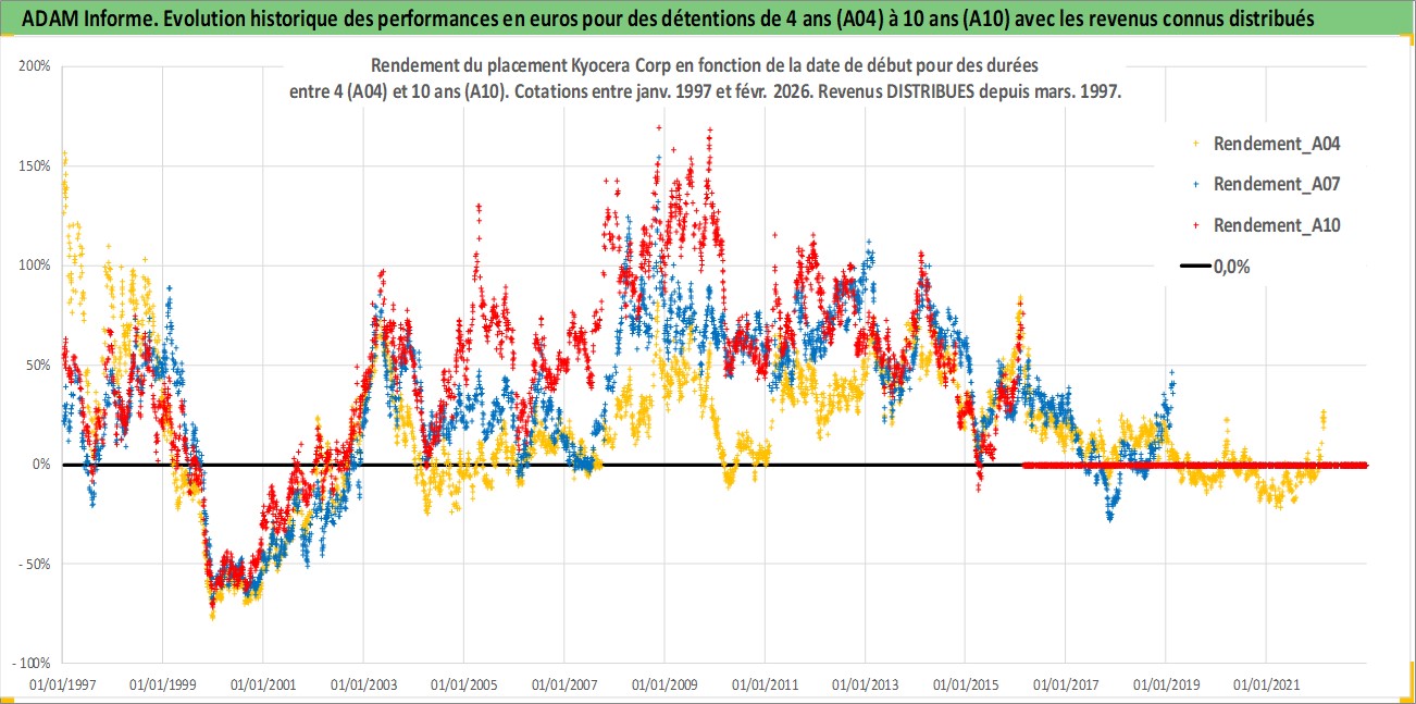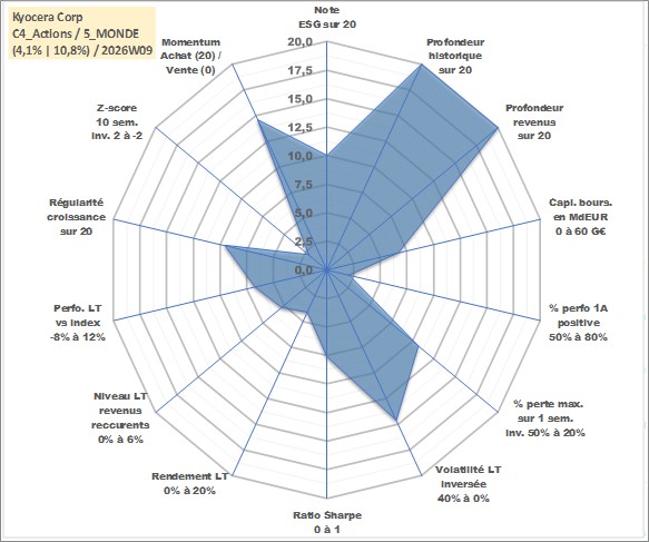 Site dédié aux investisseursPage dédiée sur site financeAnalyse des valorisations hebdomadaires de l'action Kyocera Corp. Cet actif est cote en JPY. Les valorisations sont en contrevaleur EURO et couvrent les semaines 1997W01 a 2026W09. Les revenus de cet actif financier sont pris en compte depuis la semaine 1997W13. La note globale ESG de cet actif est estimee a 10.0 (apres rebasage entre 0 et 20).