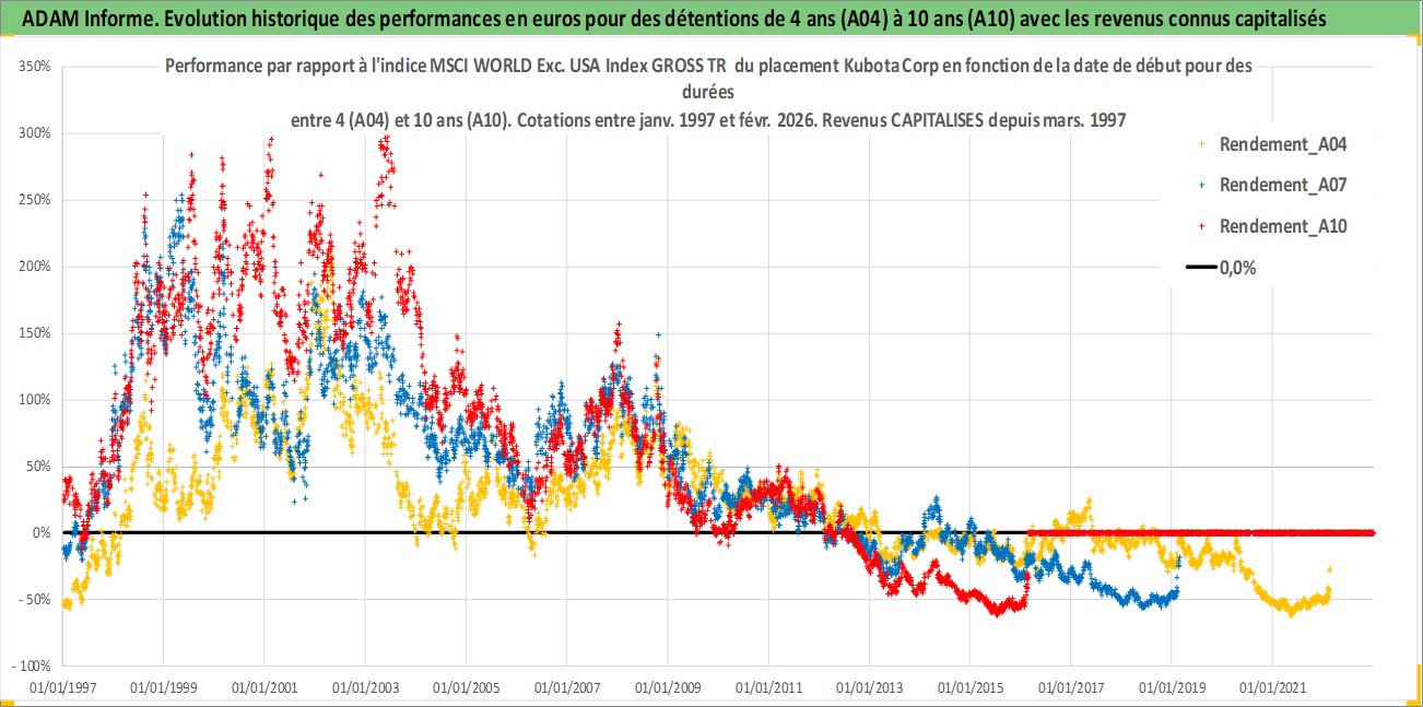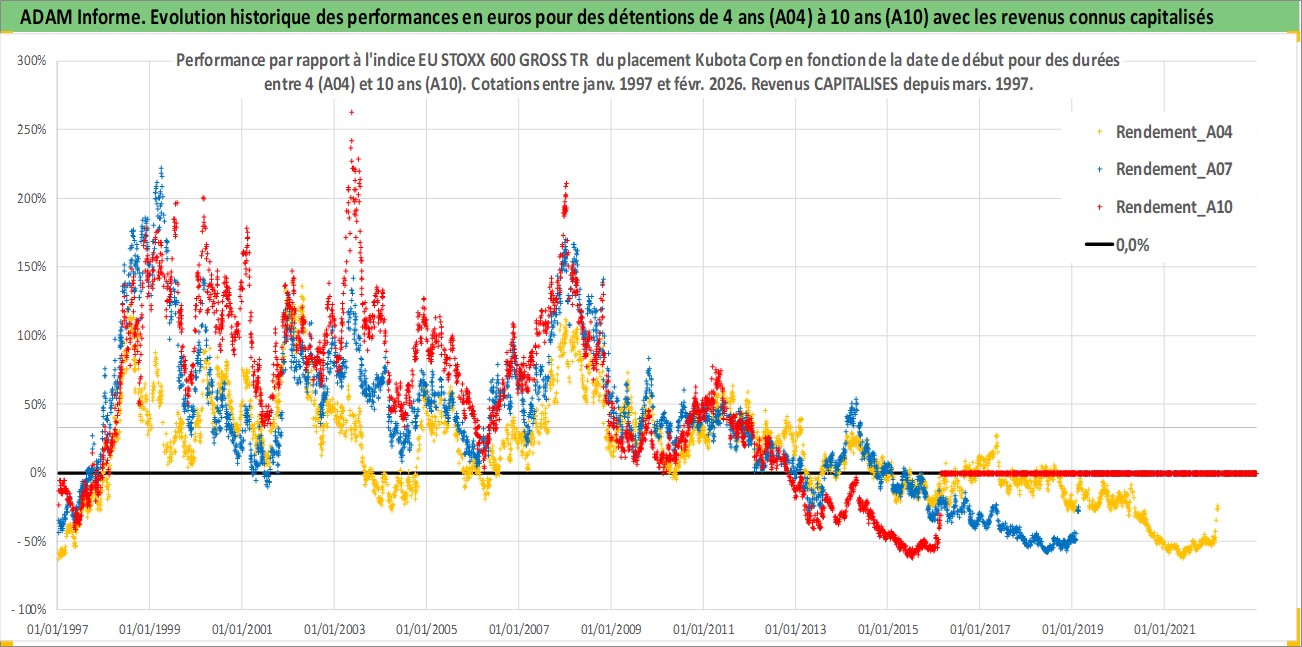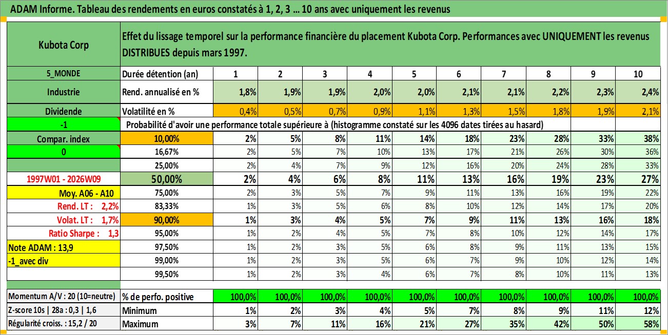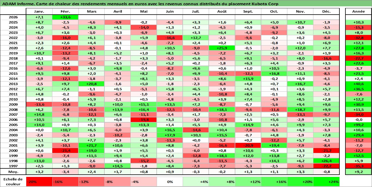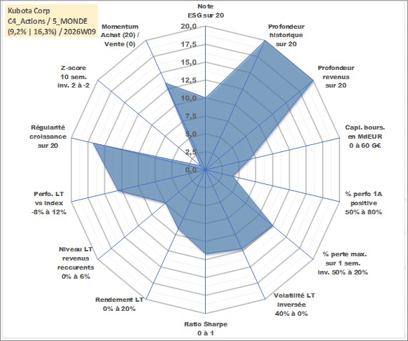 Site dédié aux investisseursPage dédiée sur site financeAnalyse des valorisations hebdomadaires de l'action Kubota Corp. Cet actif est cote en JPY. Les valorisations sont en contrevaleur EURO et couvrent les semaines 1997W01 a 2026W09. Les revenus de cet actif financier sont pris en compte depuis la semaine 1997W13. La note globale ESG de cet actif est estimee a 10.0 (apres rebasage entre 0 et 20).