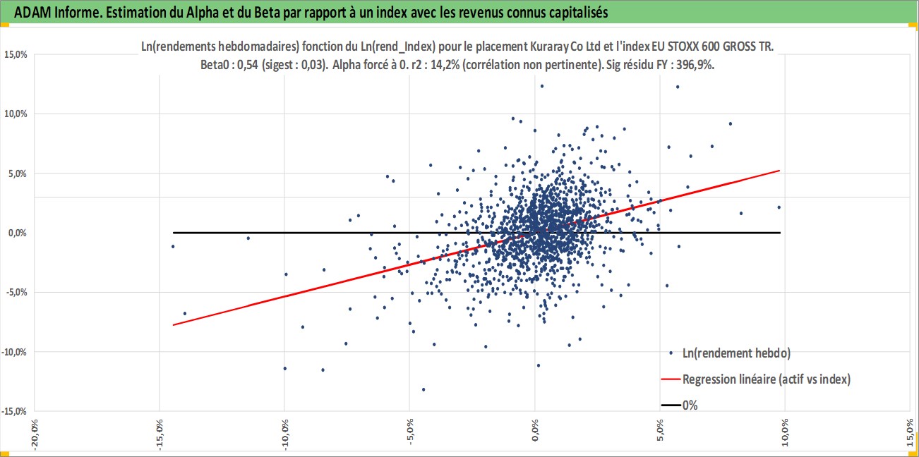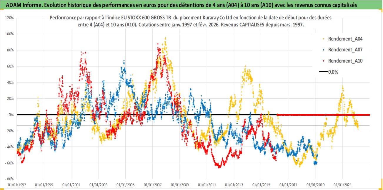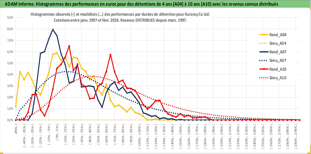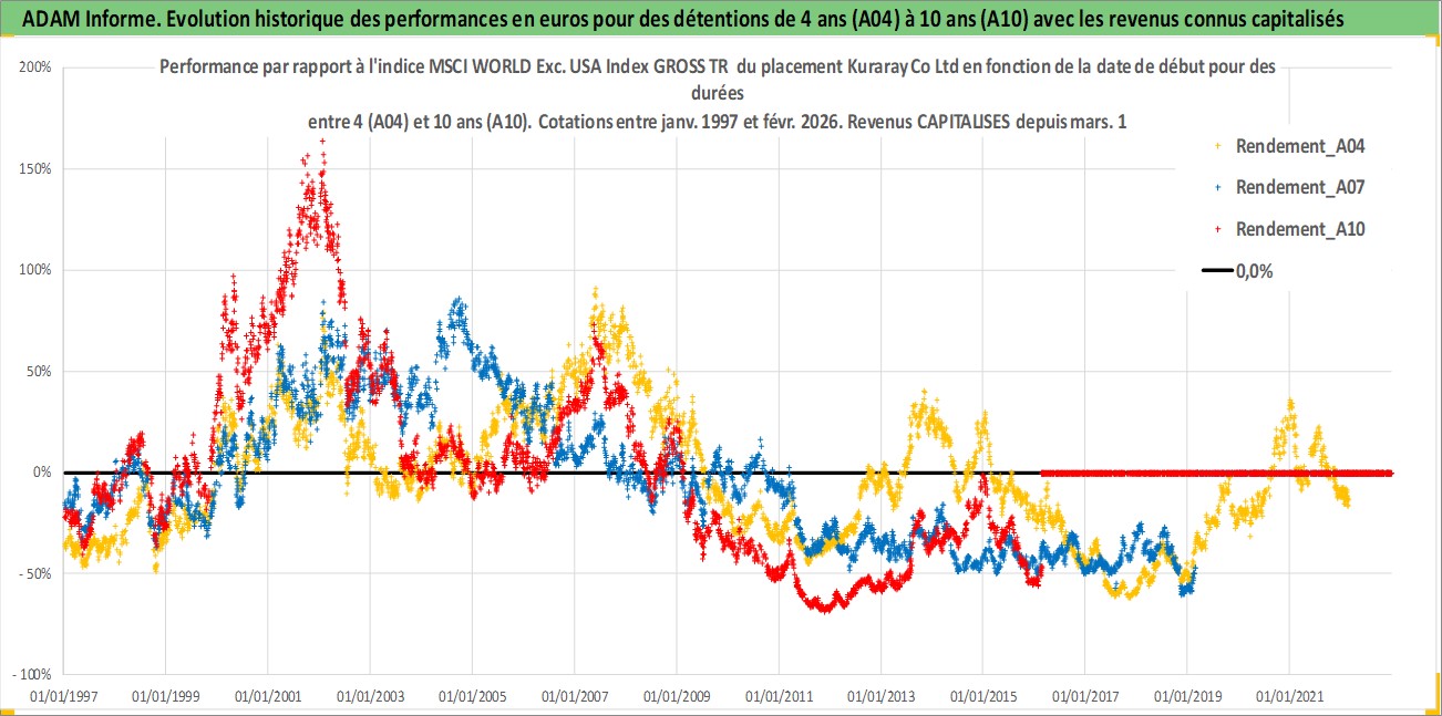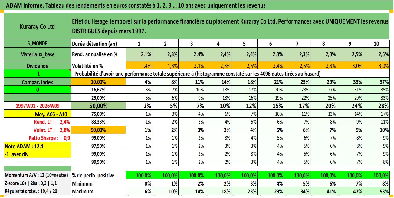 Site dédié aux investisseursPage dédiée sur site financeAnalyse des valorisations hebdomadaires de l'action Kuraray Co Ltd. Cet actif est cote en JPY. Les valorisations sont en contrevaleur EURO et couvrent les semaines 1997W01 a 2026W09. Les revenus de cet actif financier sont pris en compte depuis la semaine 1997W13. La note globale ESG de cet actif est estimee a 6.0 (apres rebasage entre 0 et 20).