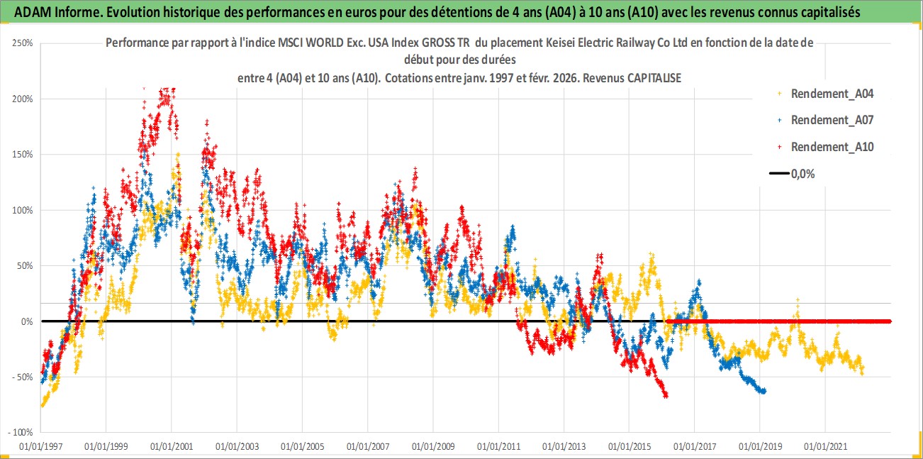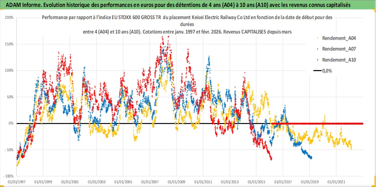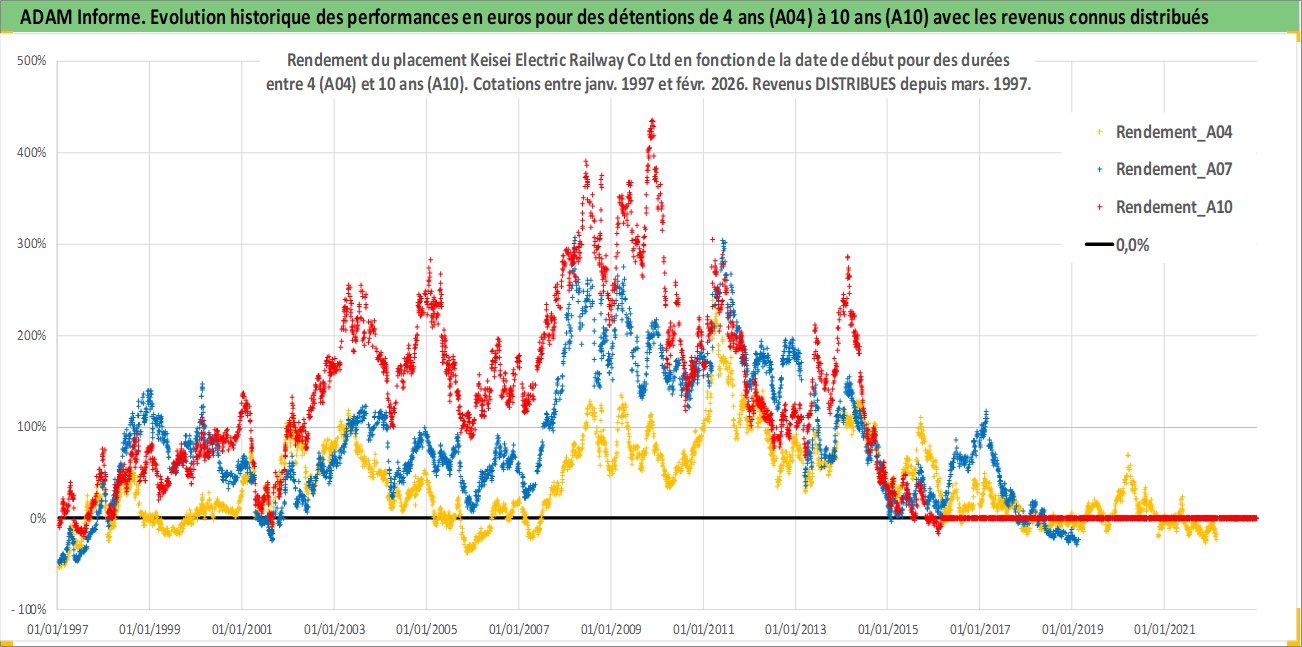 Site dédié aux investisseursPage dédiée sur site financeAnalyse des valorisations hebdomadaires de l'action Keisei Electric Railway Co Ltd. Cet actif est cote en JPY. Les valorisations sont en contrevaleur EURO et couvrent les semaines 1997W01 a 2026W09. Les revenus de cet actif financier sont pris en compte depuis la semaine 1997W13. La note ESG de cet actif n'est pas connue.