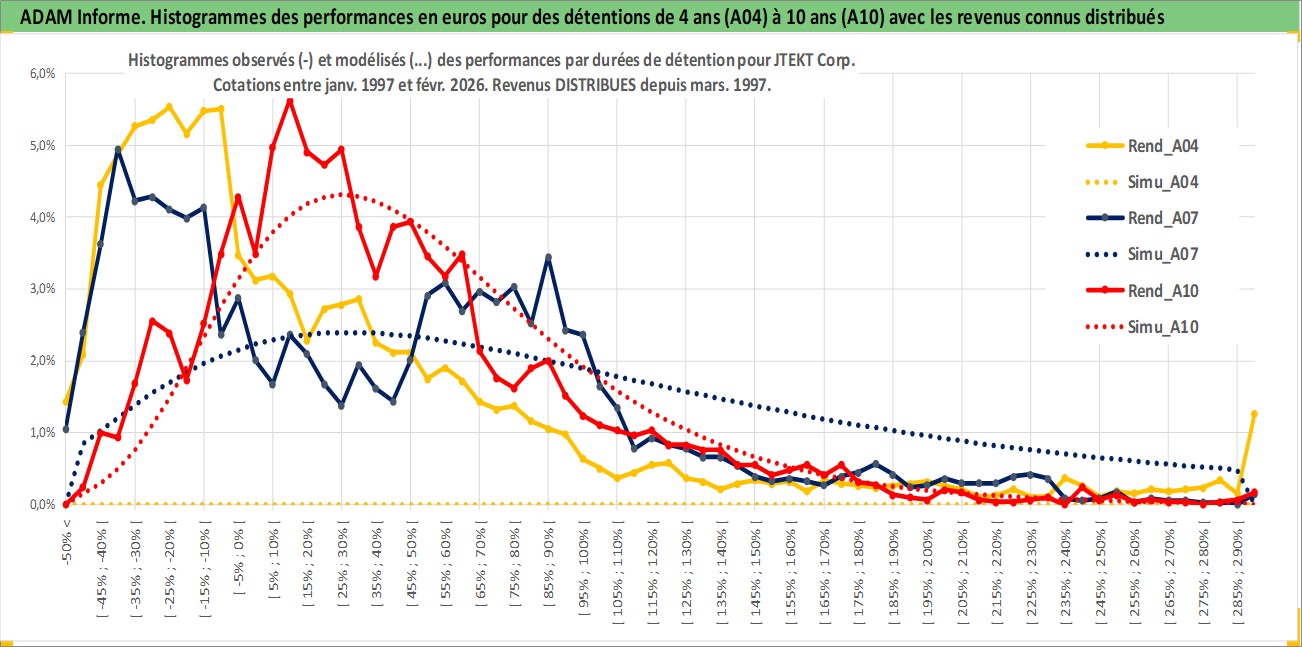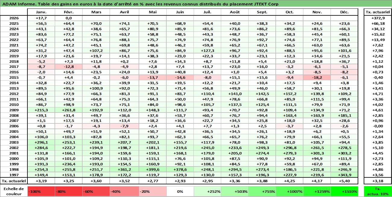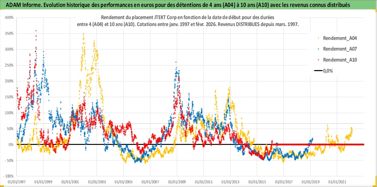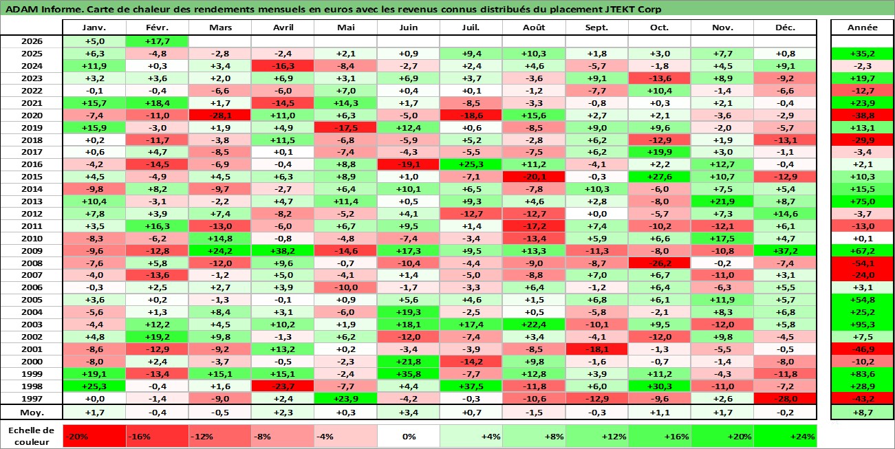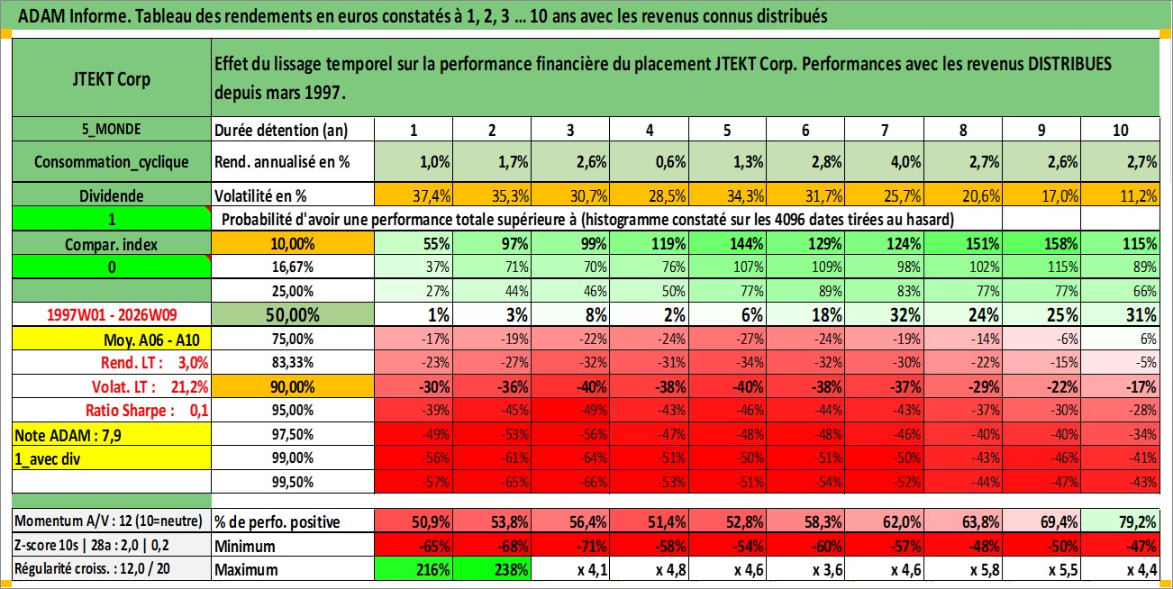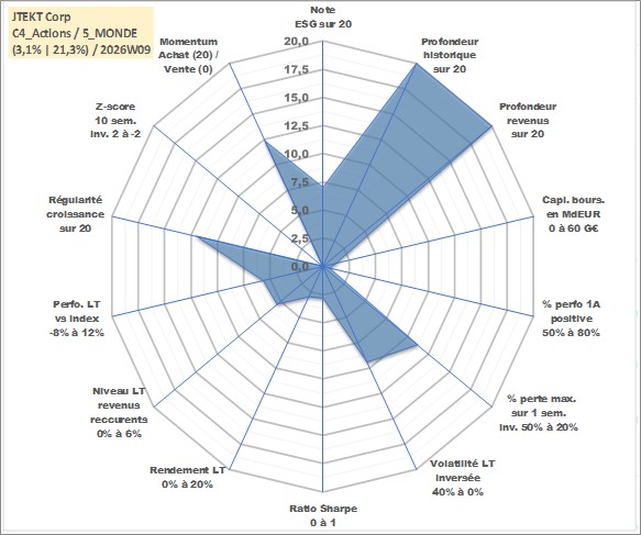 Site dédié aux investisseursPage dédiée sur site financeAnalyse des valorisations hebdomadaires de l'action JTEKT Corp. Cet actif est cote en JPY. Les valorisations sont en contrevaleur EURO et couvrent les semaines 1997W01 a 2026W09. Les revenus de cet actif financier sont pris en compte depuis la semaine 1997W13. La note globale ESG de cet actif est estimee a 7.0 (apres rebasage entre 0 et 20).
