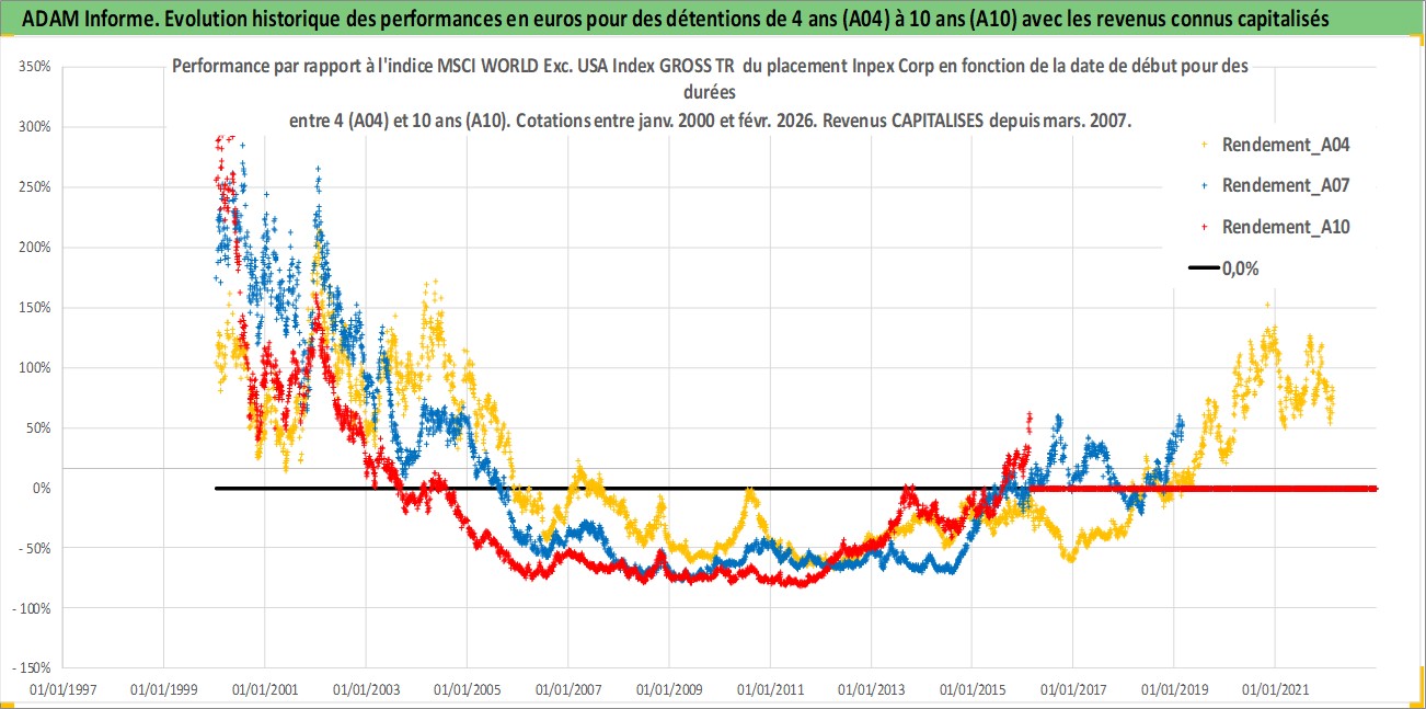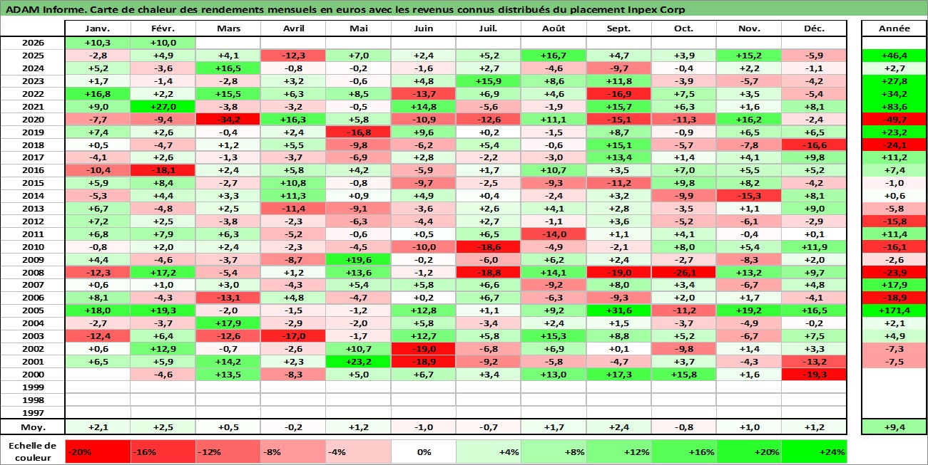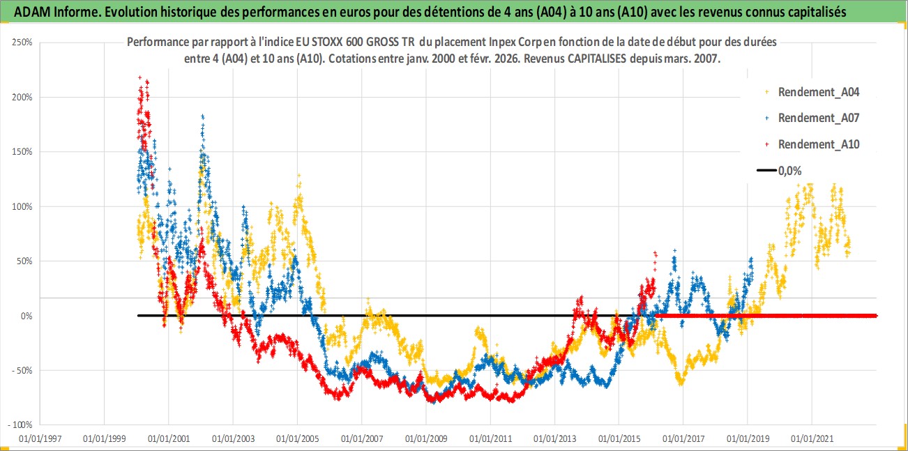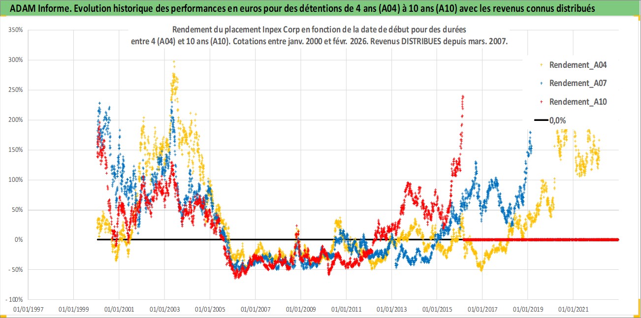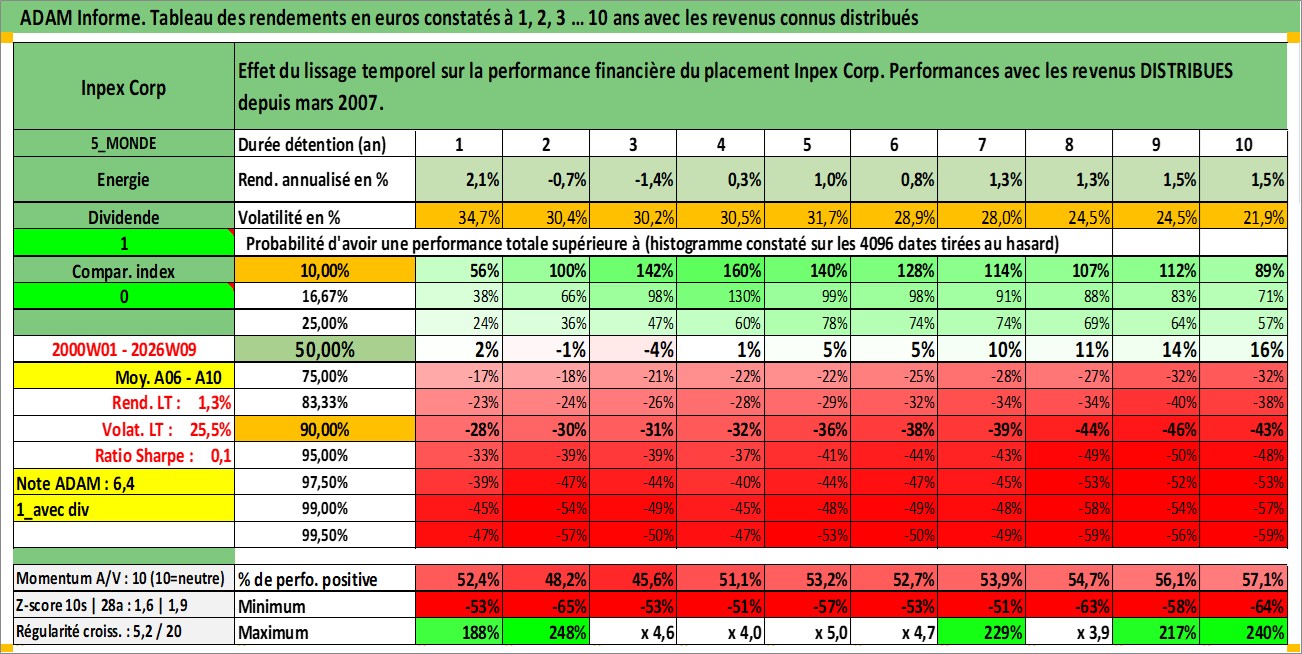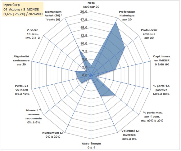 Site dédié aux investisseursPage dédiée sur site financeAnalyse des valorisations hebdomadaires de l'action Inpex Corp. Cet actif est cote en JPY. Les valorisations sont en contrevaleur EURO et couvrent les semaines 2000W01 a 2026W09. Les revenus de cet actif financier sont pris en compte depuis la semaine 2007W13. La note globale ESG de cet actif est estimee a 3.0 (apres rebasage entre 0 et 20).