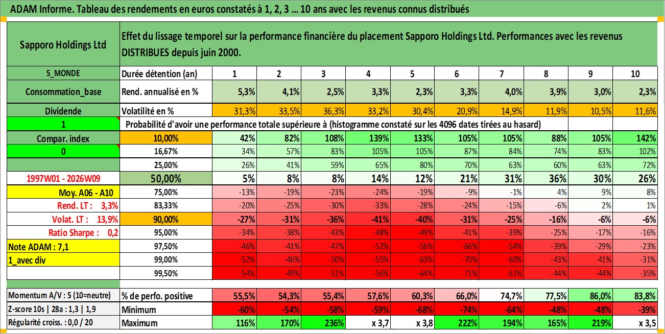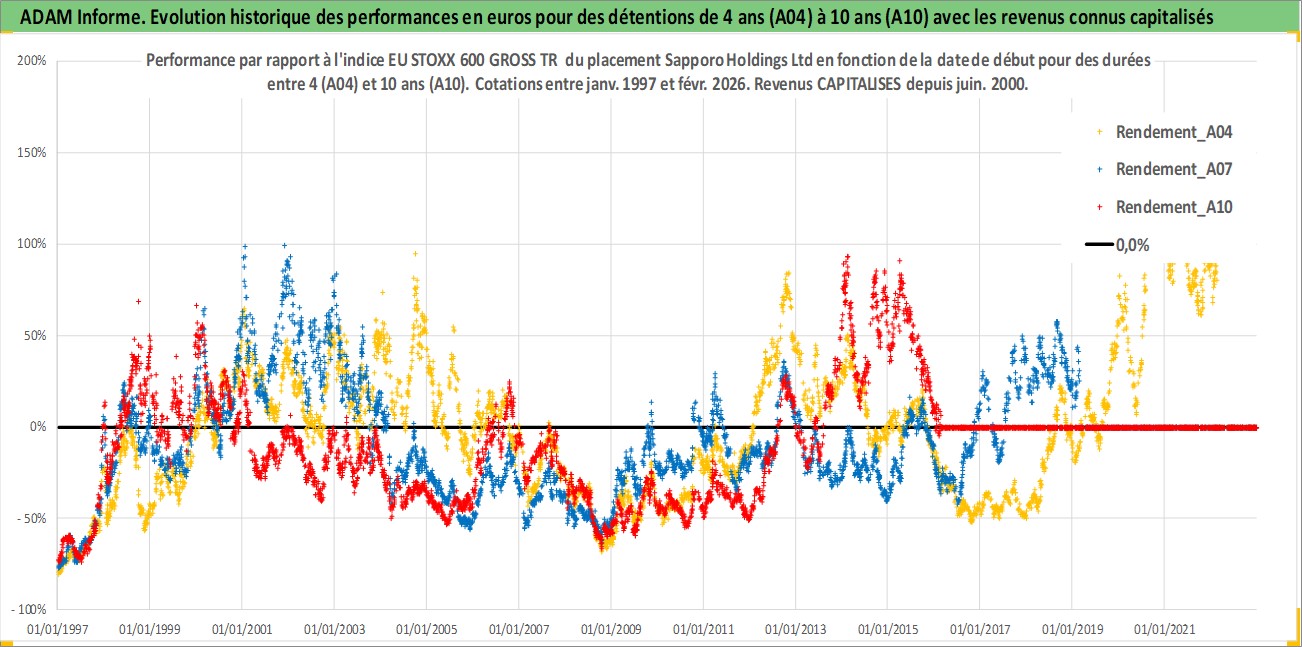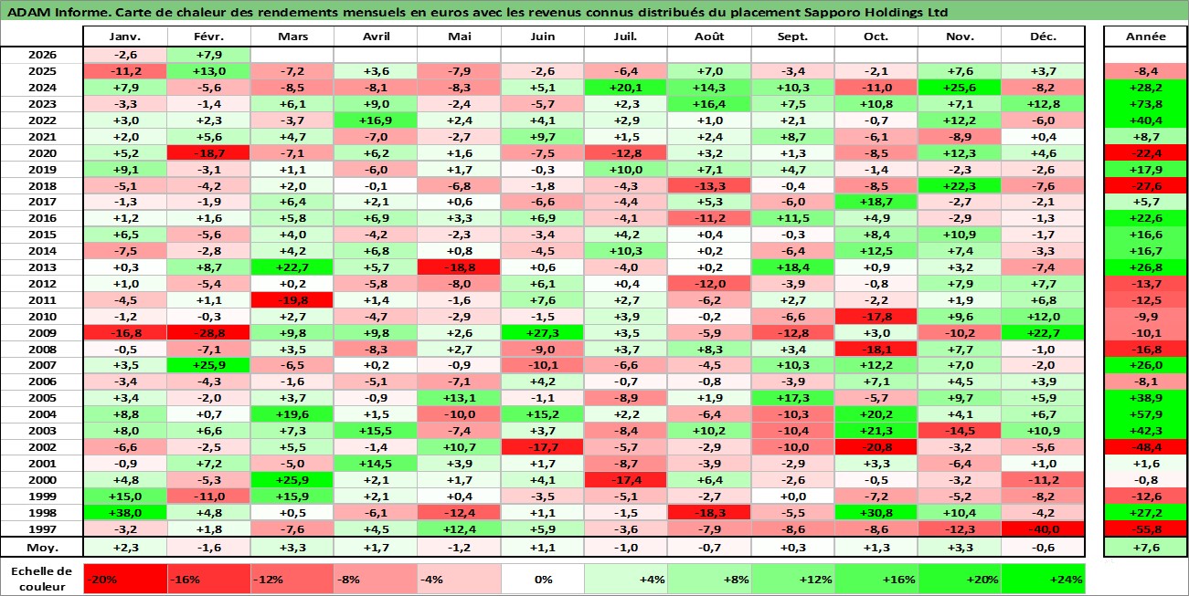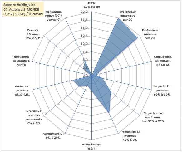 Site dédié aux investisseursPage dédiée sur site financeAnalyse des valorisations hebdomadaires de l'action Sapporo Holdings Ltd. Cet actif est cote en JPY. Les valorisations sont en contrevaleur EURO et couvrent les semaines 1997W01 a 2026W09. Les revenus de cet actif financier sont pris en compte depuis la semaine 2000W26. La note ESG de cet actif n'est pas connue.