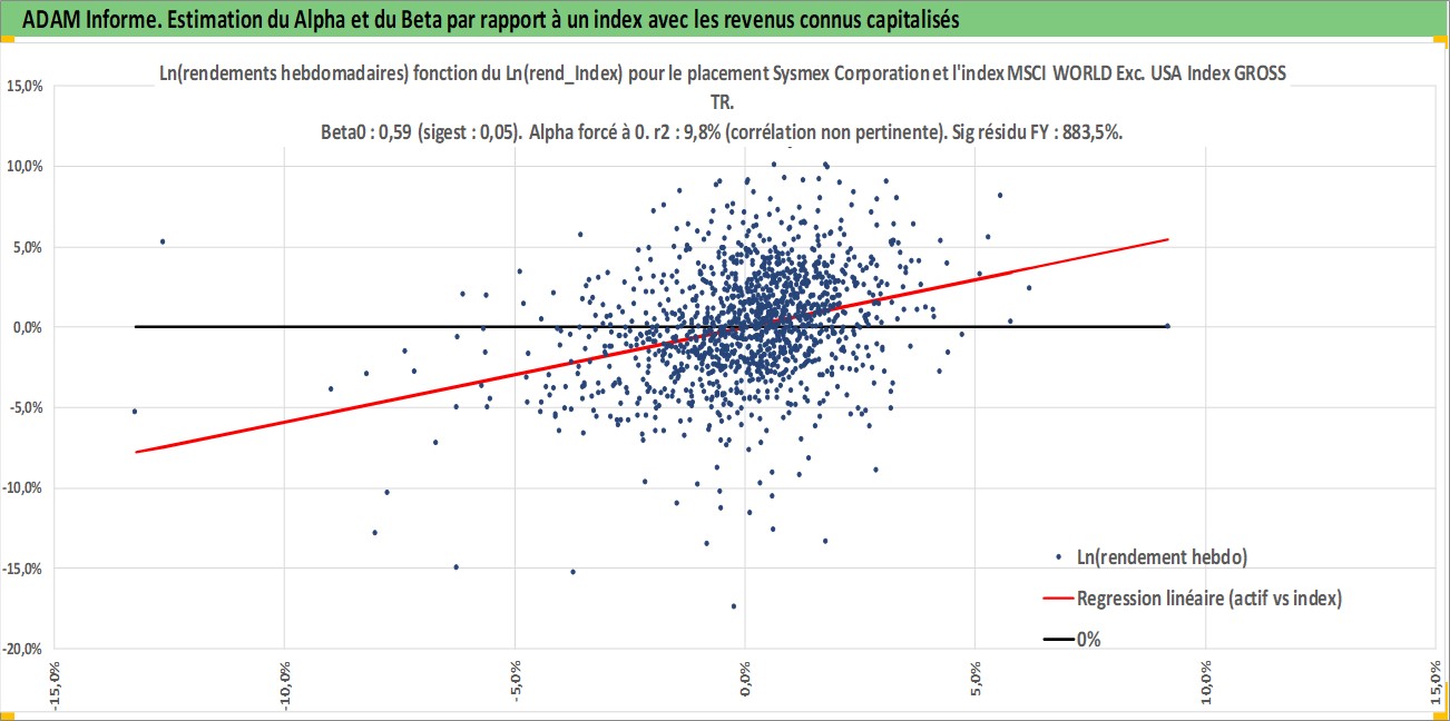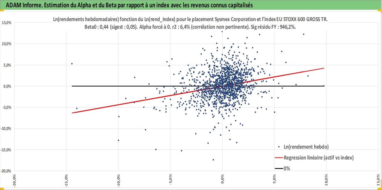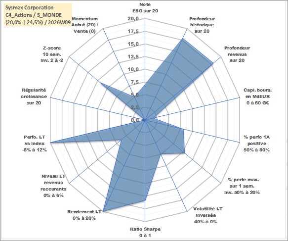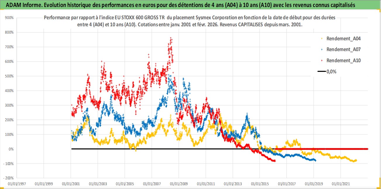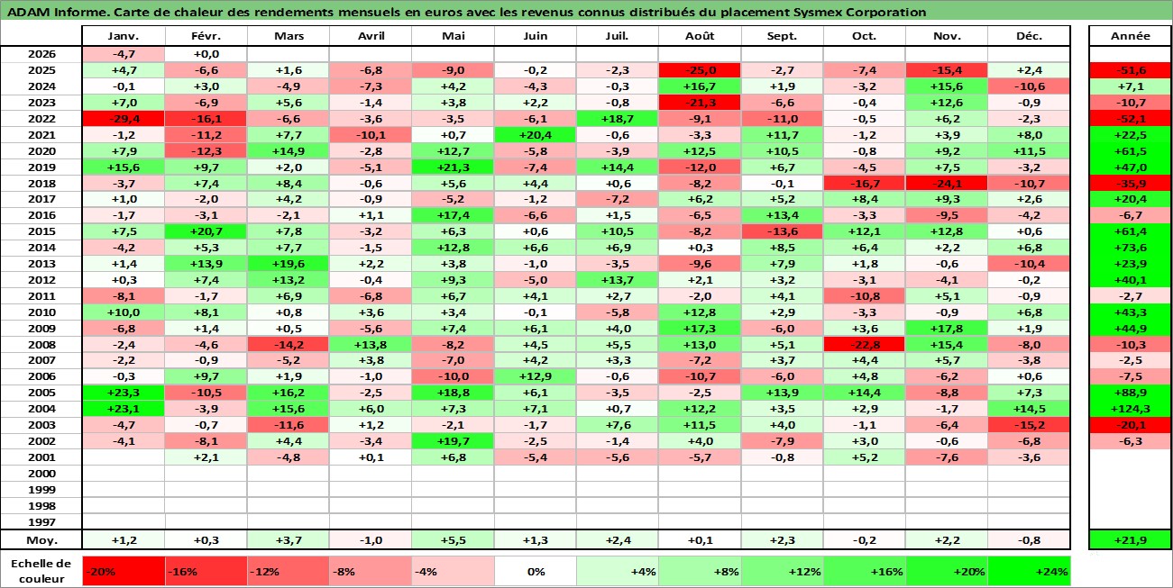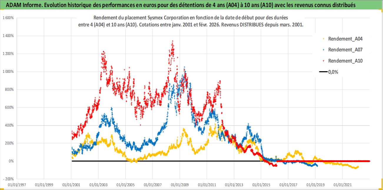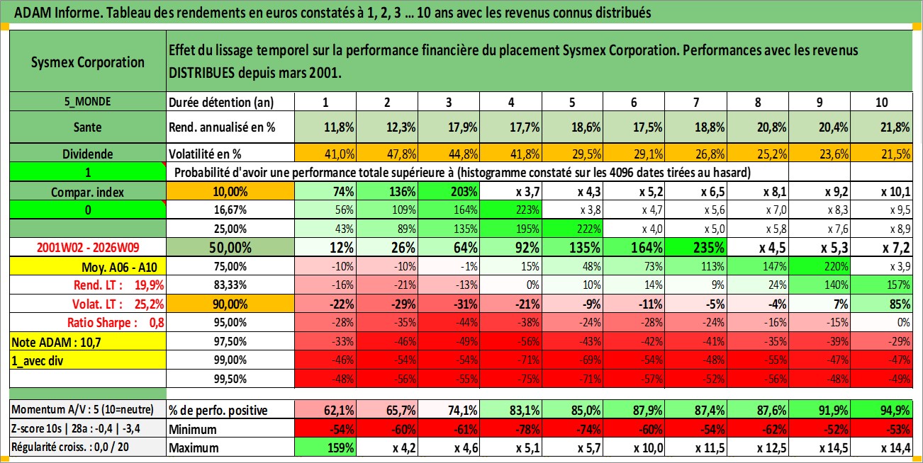 Site dédié aux investisseursPage dédiée sur site financeAnalyse des valorisations hebdomadaires de l'action Sysmex Corporation. Cet actif est cote en JPY. Les valorisations sont en contrevaleur EURO et couvrent les semaines 2001W02 a 2026W09. Les revenus de cet actif financier sont pris en compte depuis la semaine 2001W13. La note globale ESG de cet actif est estimee a 7.0 (apres rebasage entre 0 et 20).