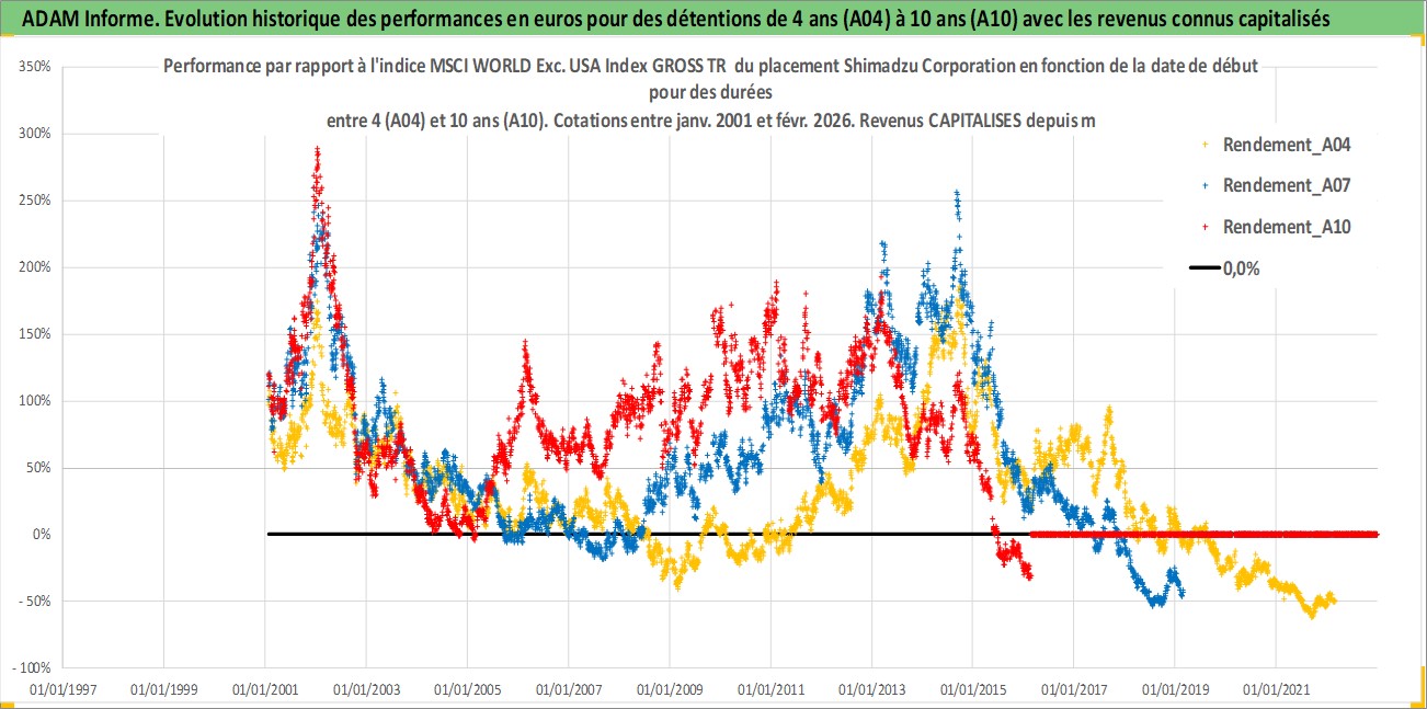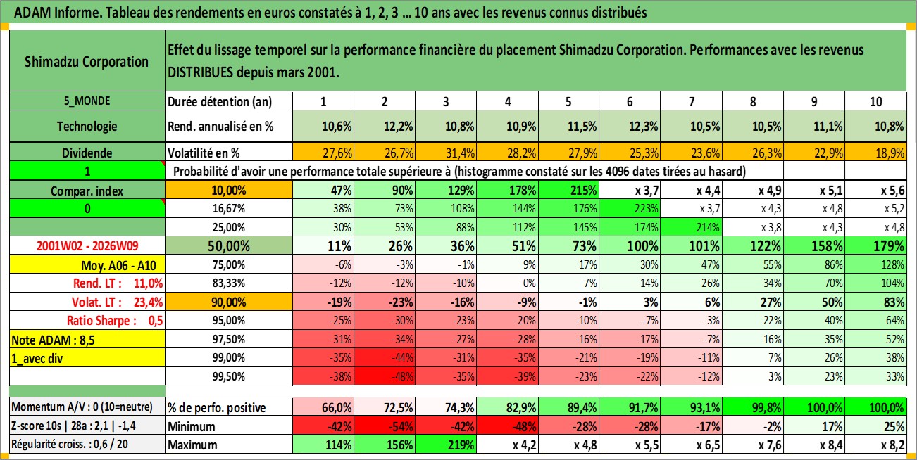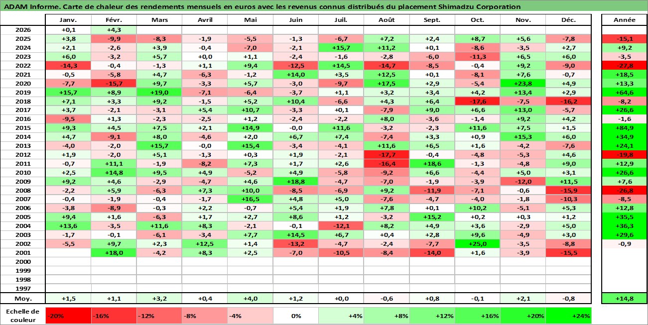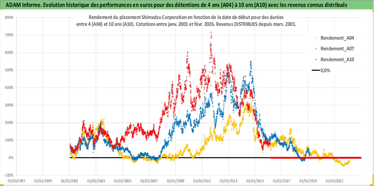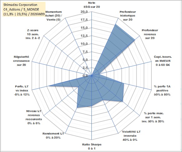 Site dédié aux investisseursPage dédiée sur site financeAnalyse des valorisations hebdomadaires de l'action Shimadzu Corporation. Cet actif est cote en JPY. Les valorisations sont en contrevaleur EURO et couvrent les semaines 2001W02 a 2026W09. Les revenus de cet actif financier sont pris en compte depuis la semaine 2001W13. La note ESG de cet actif n'est pas connue.
