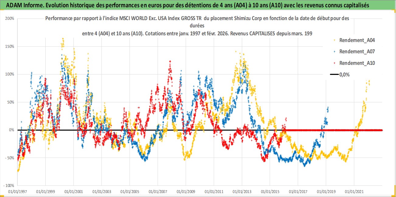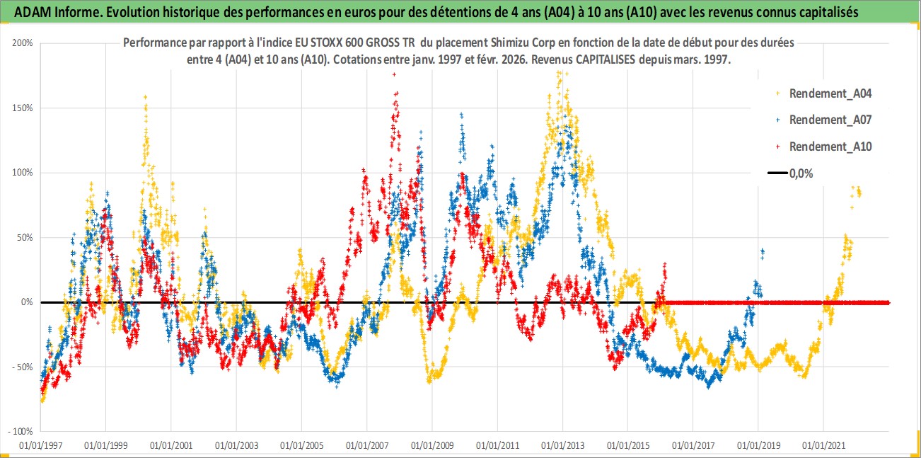 Site dédié aux investisseursPage dédiée sur site financeAnalyse des valorisations hebdomadaires de l'action Shimizu Corp. Cet actif est cote en JPY. Les valorisations sont en contrevaleur EURO et couvrent les semaines 1997W01 a 2026W09. Les revenus de cet actif financier sont pris en compte depuis la semaine 1997W13. La note globale ESG de cet actif est estimee a 4.0 (apres rebasage entre 0 et 20).
