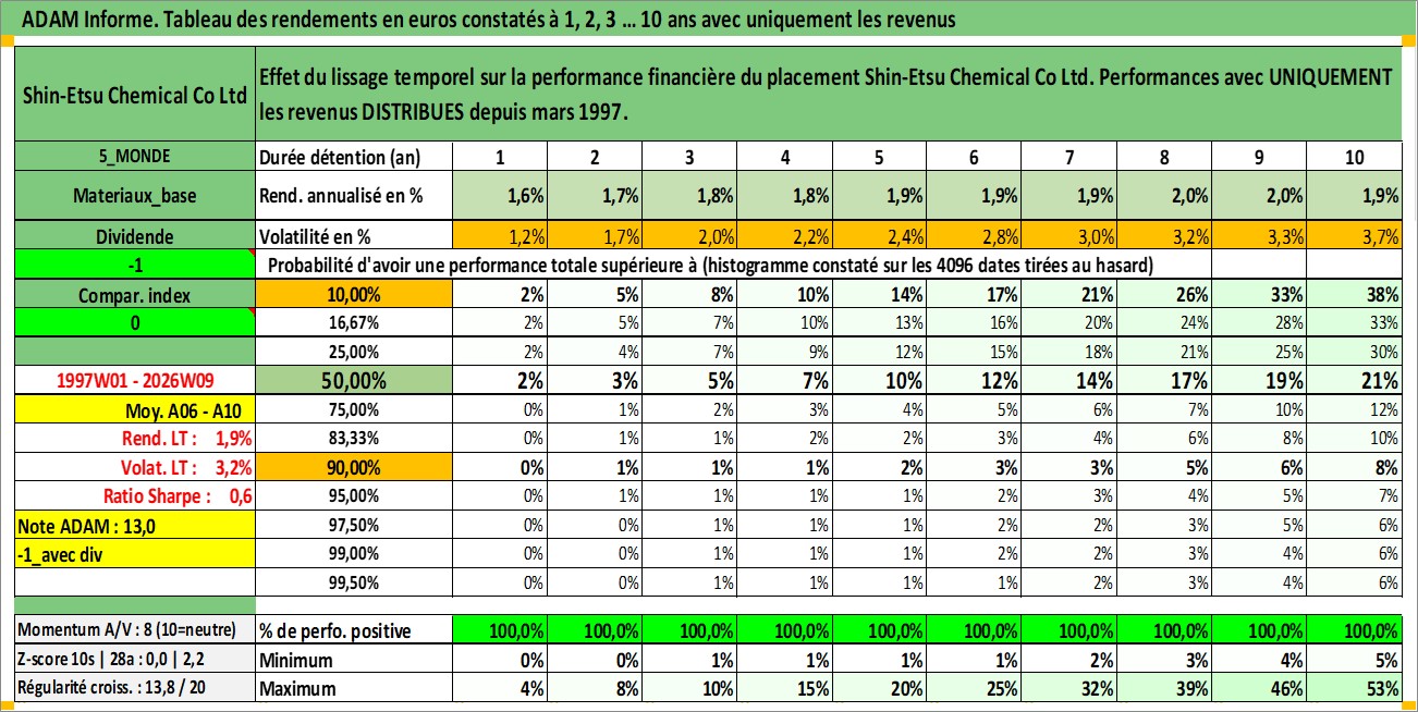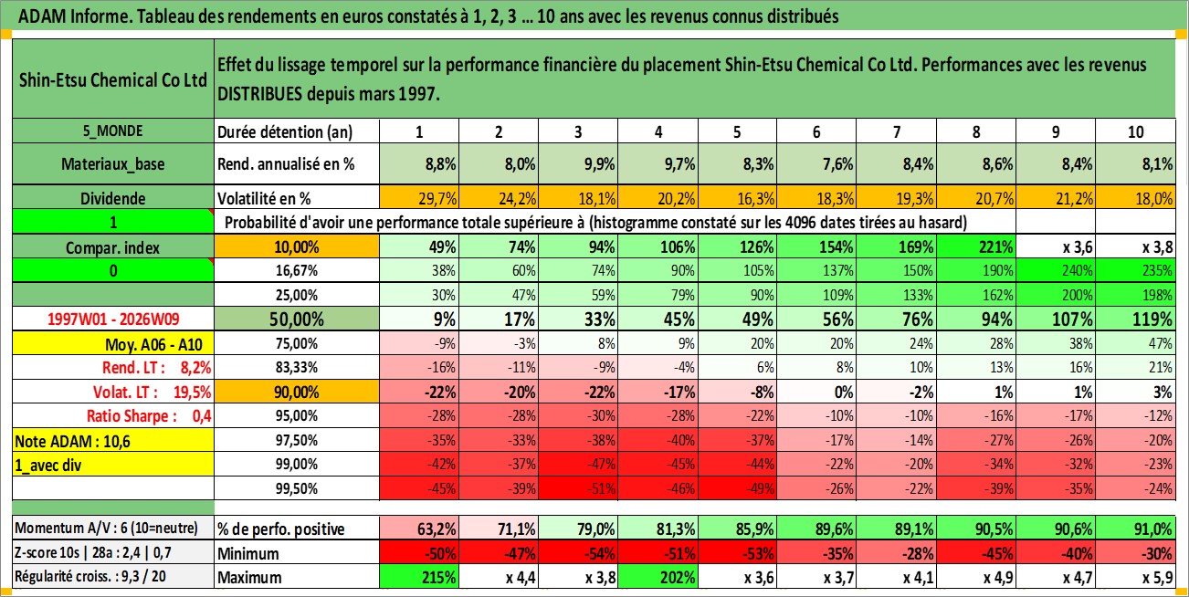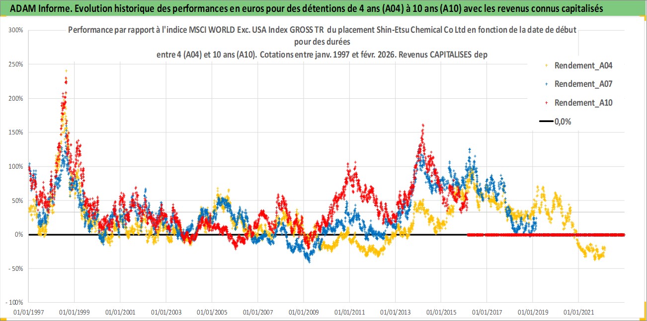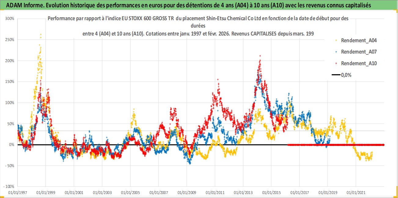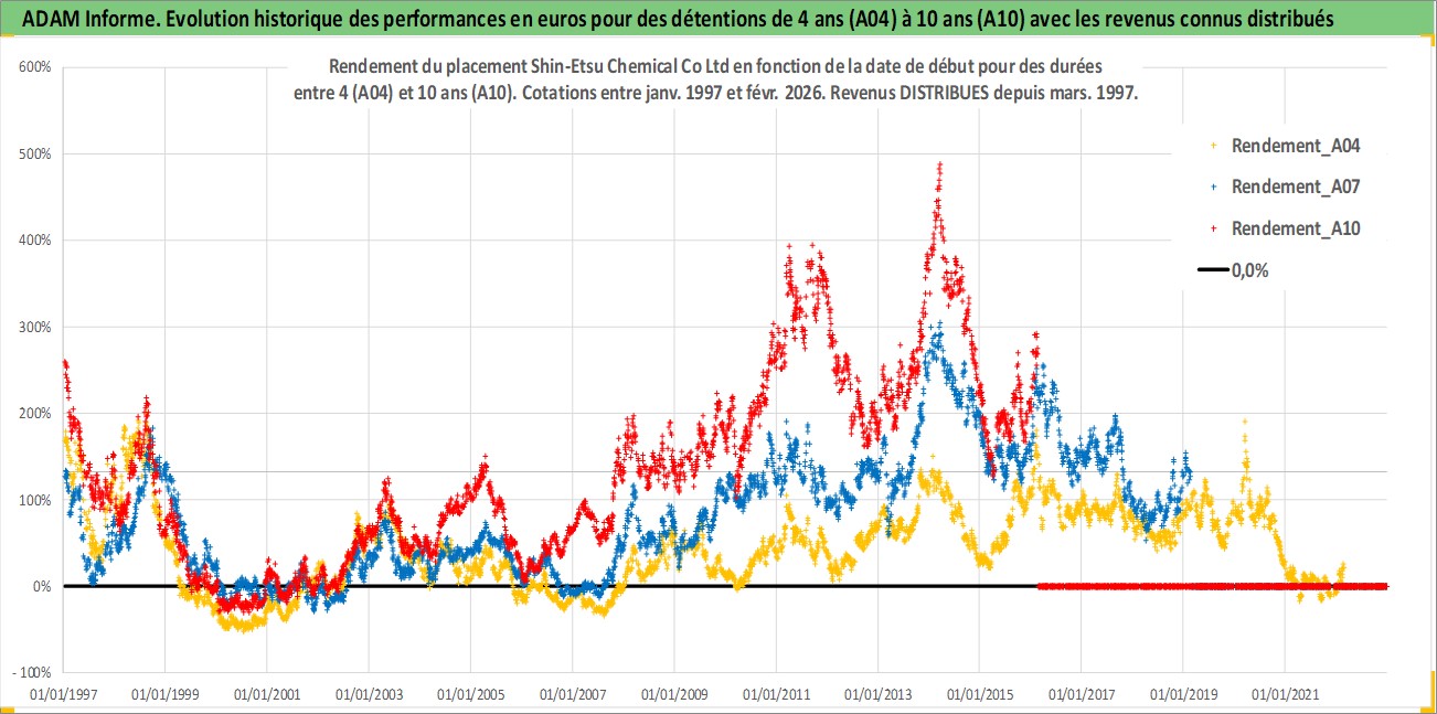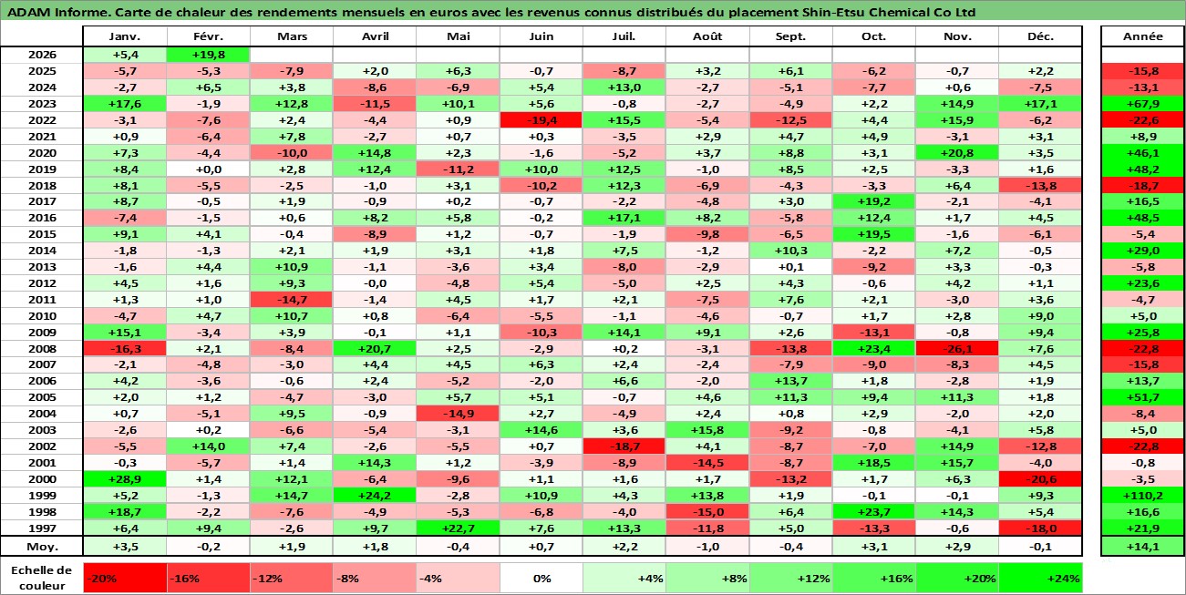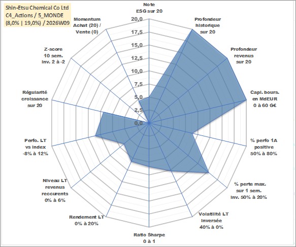 Site dédié aux investisseursPage dédiée sur site financeAnalyse des valorisations hebdomadaires de l'action Shin-Etsu Chemical Co Ltd. Cet actif est cote en JPY. Les valorisations sont en contrevaleur EURO et couvrent les semaines 1997W01 a 2026W09. Les revenus de cet actif financier sont pris en compte depuis la semaine 1997W13. La note globale ESG de cet actif est estimee a 5.0 (apres rebasage entre 0 et 20).