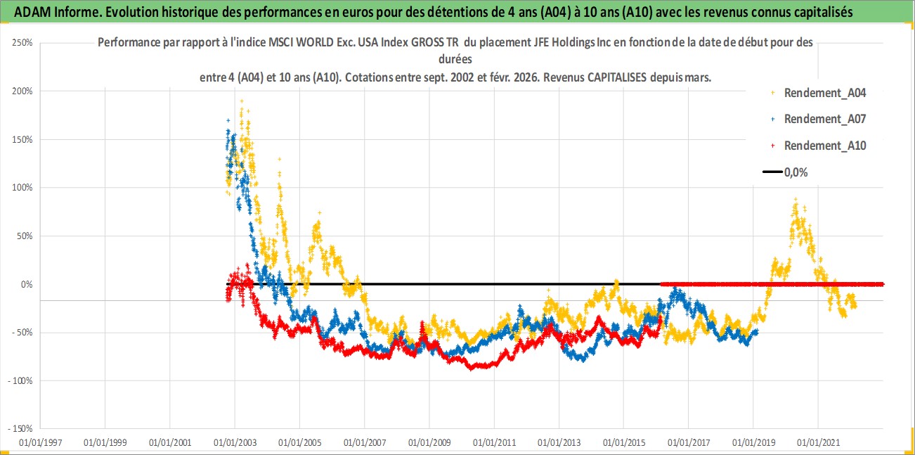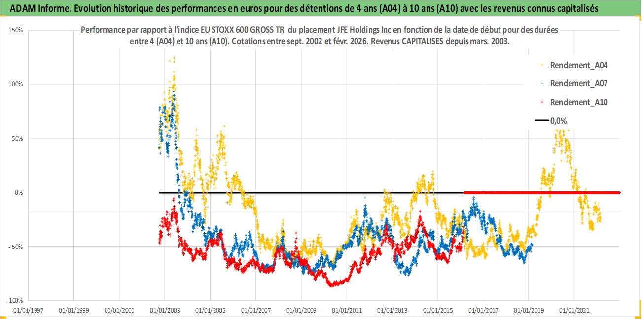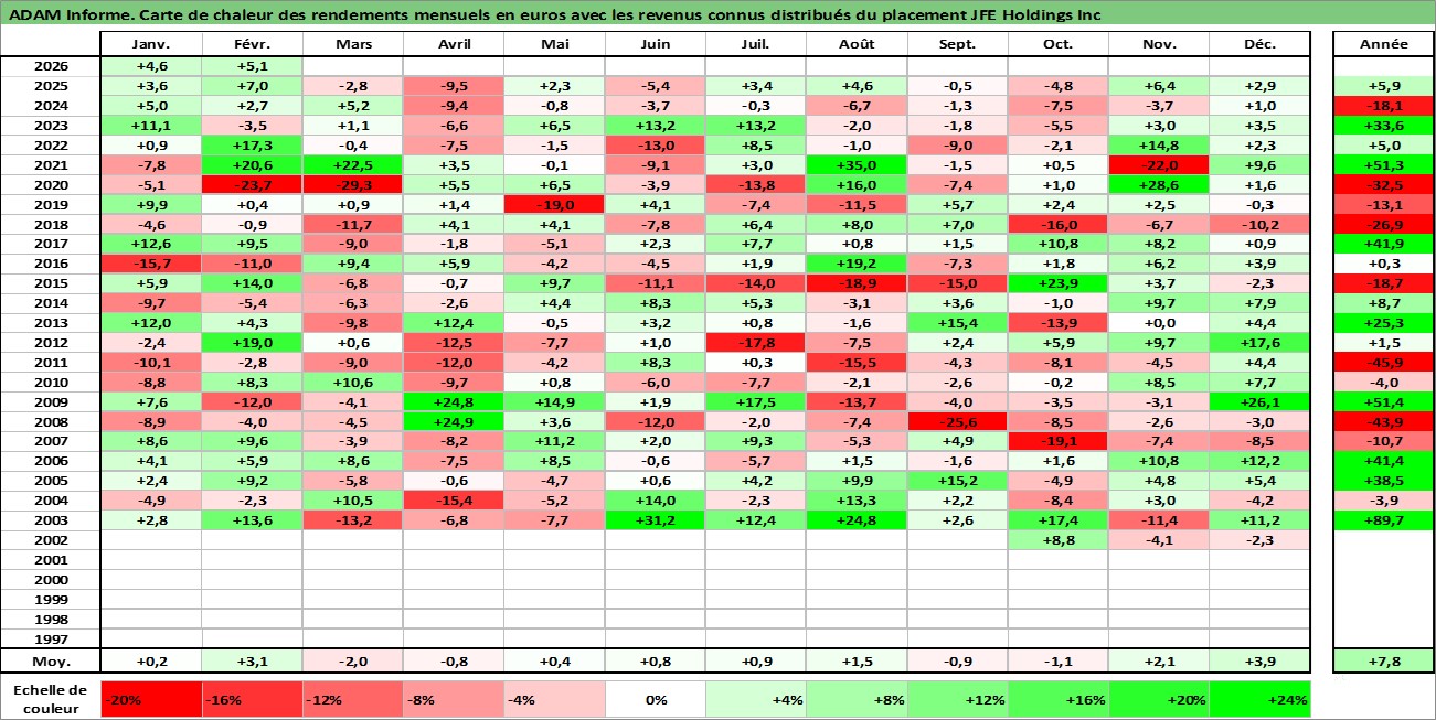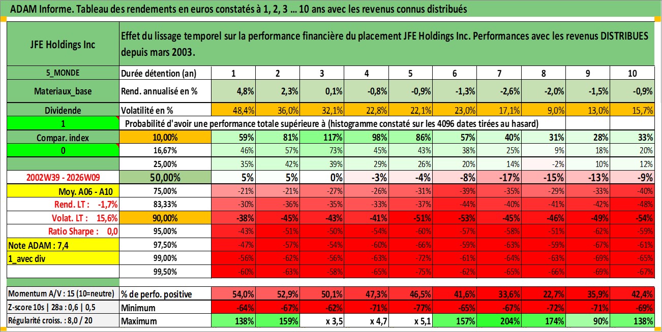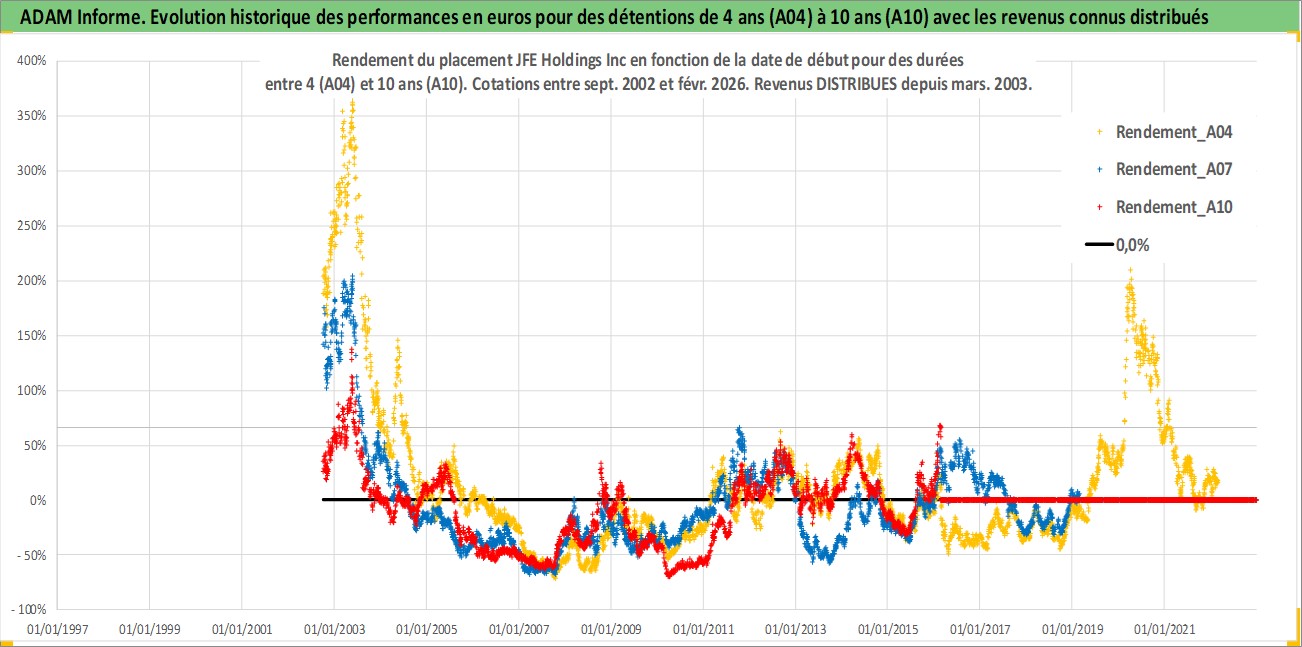 Site dédié aux investisseursPage dédiée sur site financeAnalyse des valorisations hebdomadaires de l'action JFE Holdings Inc. Cet actif est cote en JPY. Les valorisations sont en contrevaleur EURO et couvrent les semaines 2002W39 a 2026W09. Les revenus de cet actif financier sont pris en compte depuis la semaine 2003W13. La note globale ESG de cet actif est estimee a 3.0 (apres rebasage entre 0 et 20).