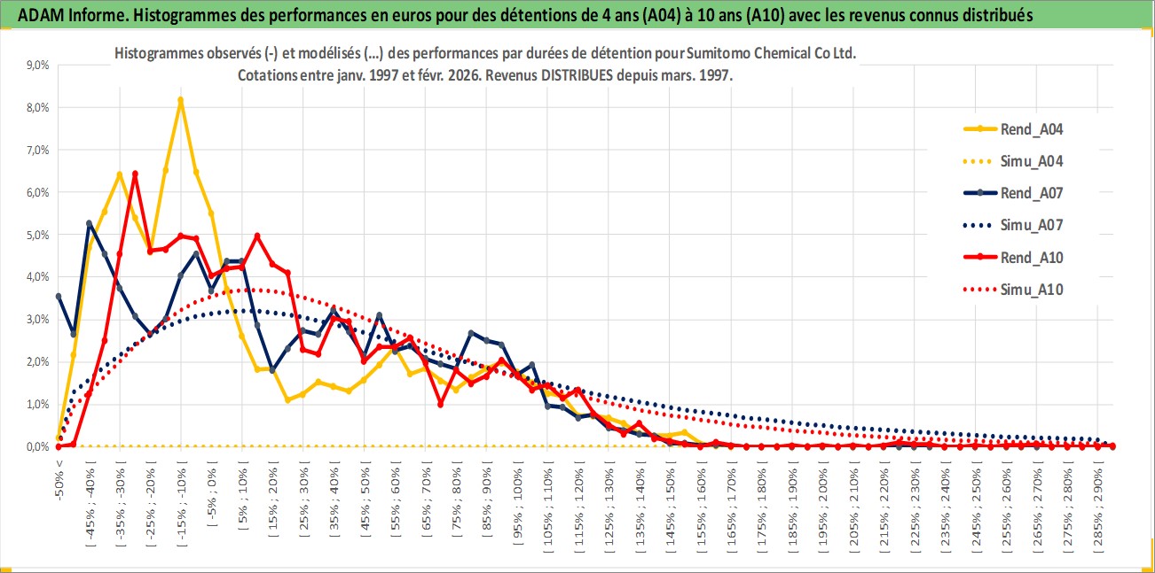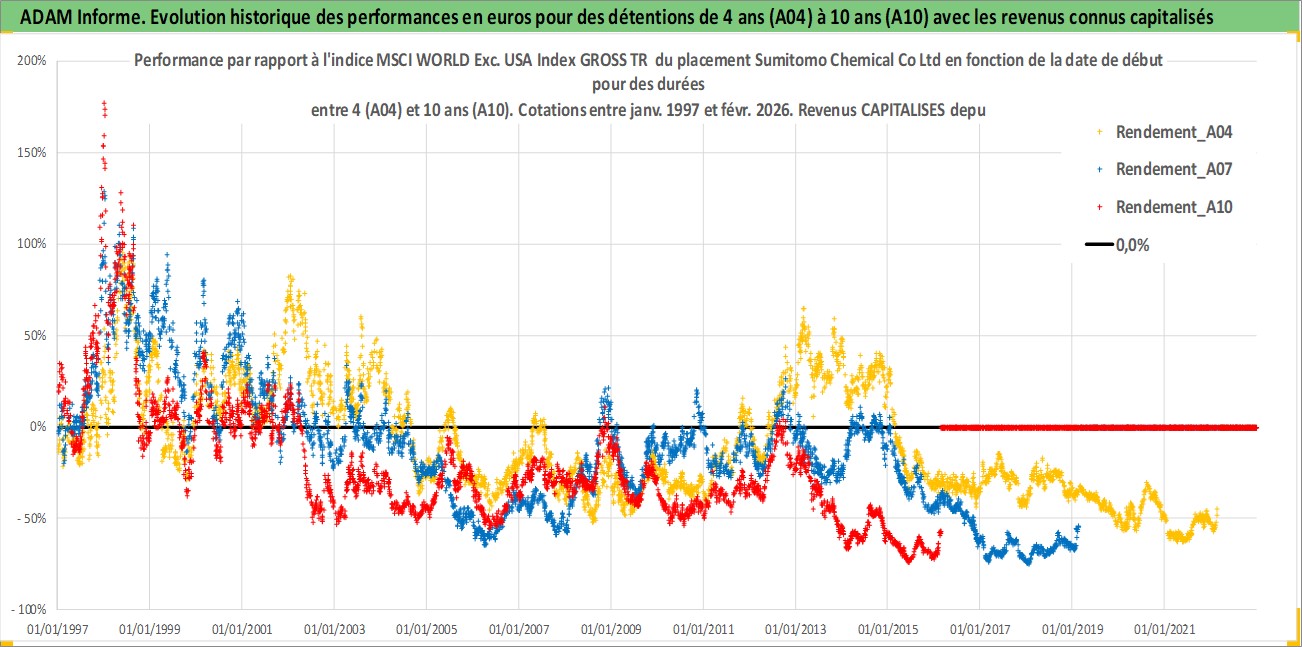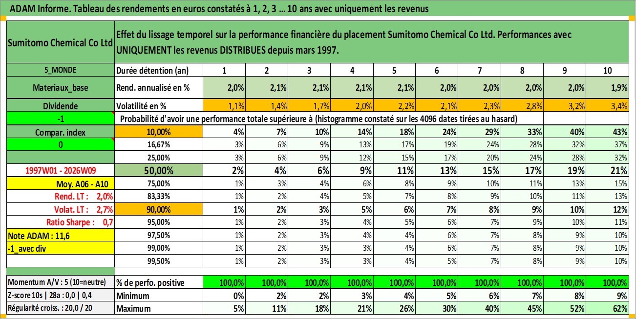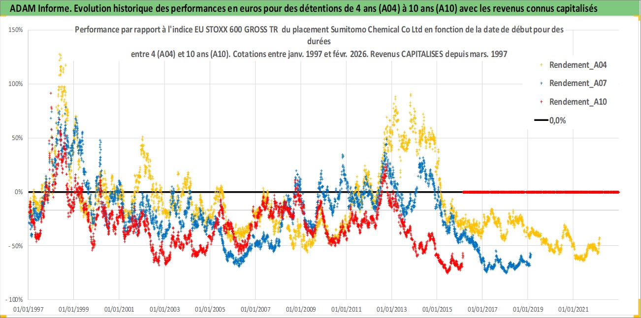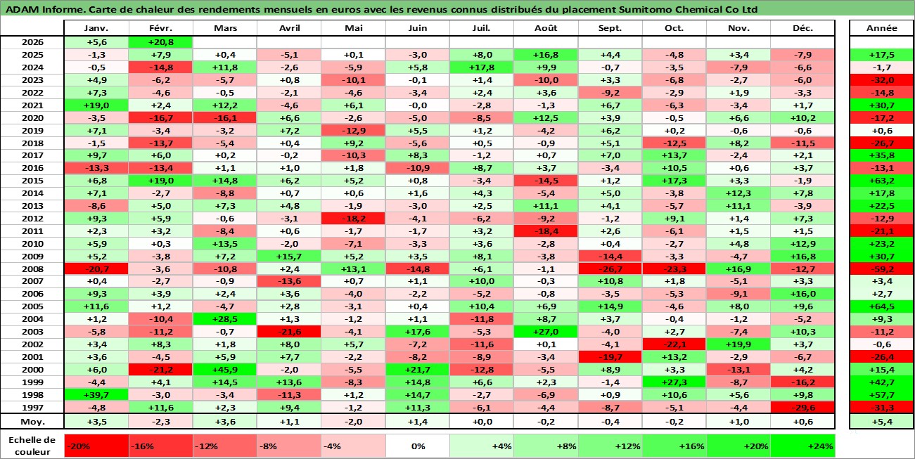 Site dédié aux investisseursPage dédiée sur site financeAnalyse des valorisations hebdomadaires de l'action Sumitomo Chemical Co Ltd. Cet actif est cote en JPY. Les valorisations sont en contrevaleur EURO et couvrent les semaines 1997W01 a 2026W09. Les revenus de cet actif financier sont pris en compte depuis la semaine 1997W13. La note globale ESG de cet actif est estimee a 4.0 (apres rebasage entre 0 et 20).