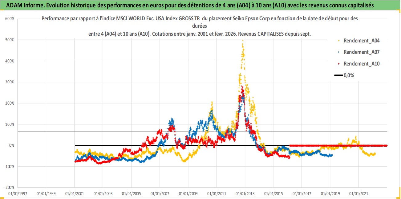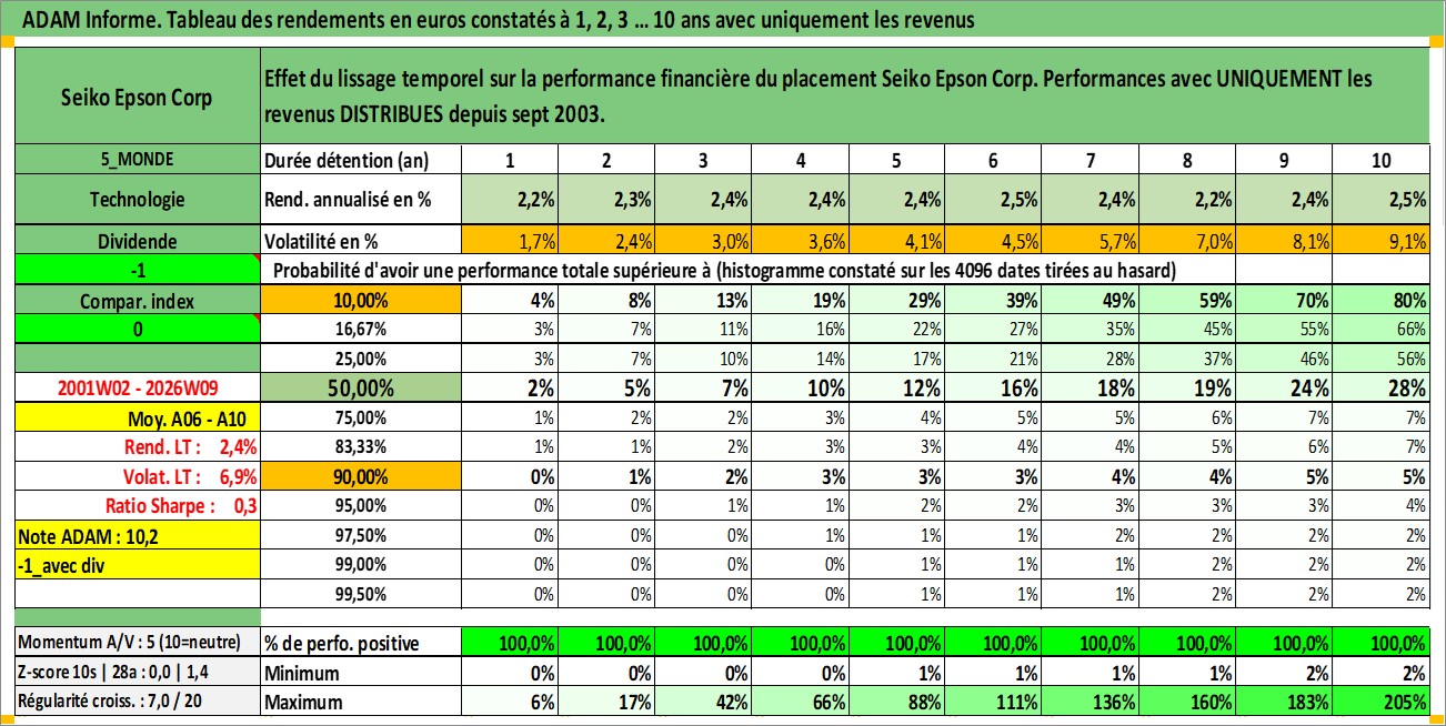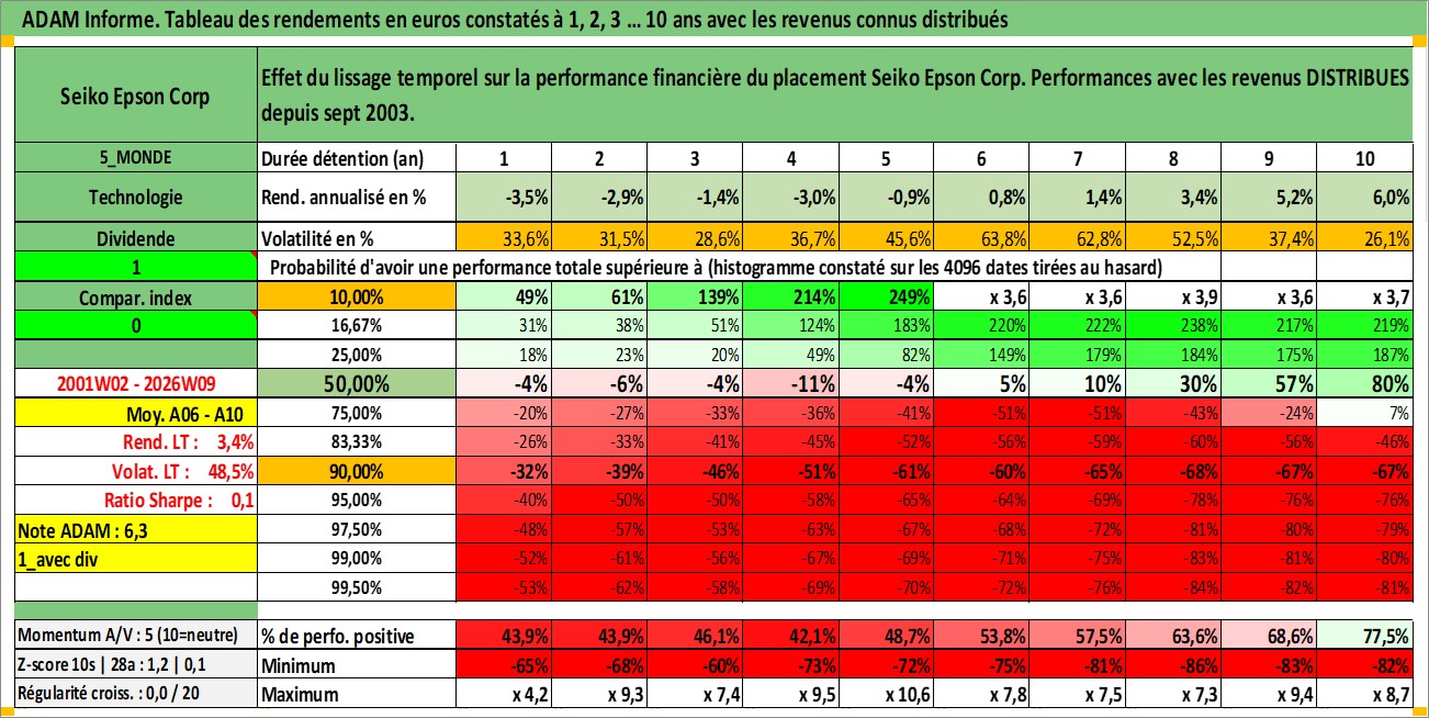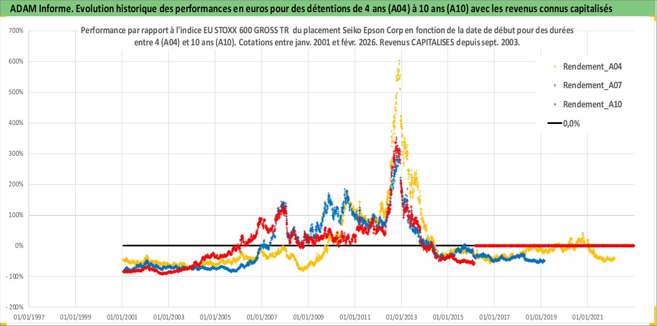 Site dédié aux investisseursPage dédiée sur site financeAnalyse des valorisations hebdomadaires de l'action Seiko Epson Corp. Cet actif est cote en JPY. Les valorisations sont en contrevaleur EURO et couvrent les semaines 2001W02 a 2026W09. Les revenus de cet actif financier sont pris en compte depuis la semaine 2003W39. La note globale ESG de cet actif est estimee a 14.0 (apres rebasage entre 0 et 20).