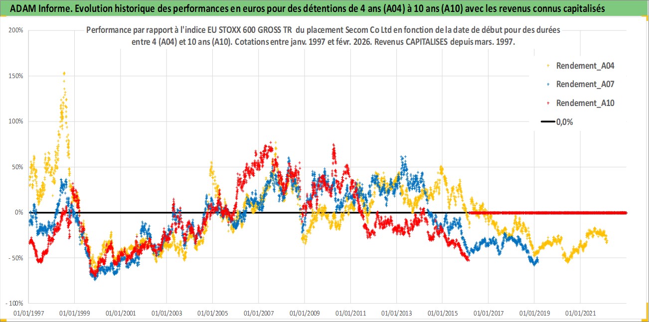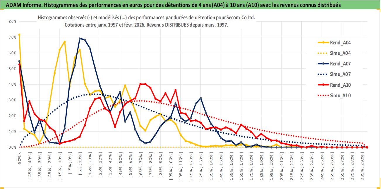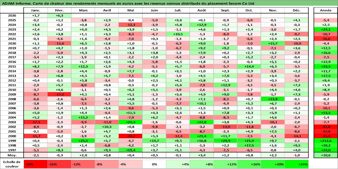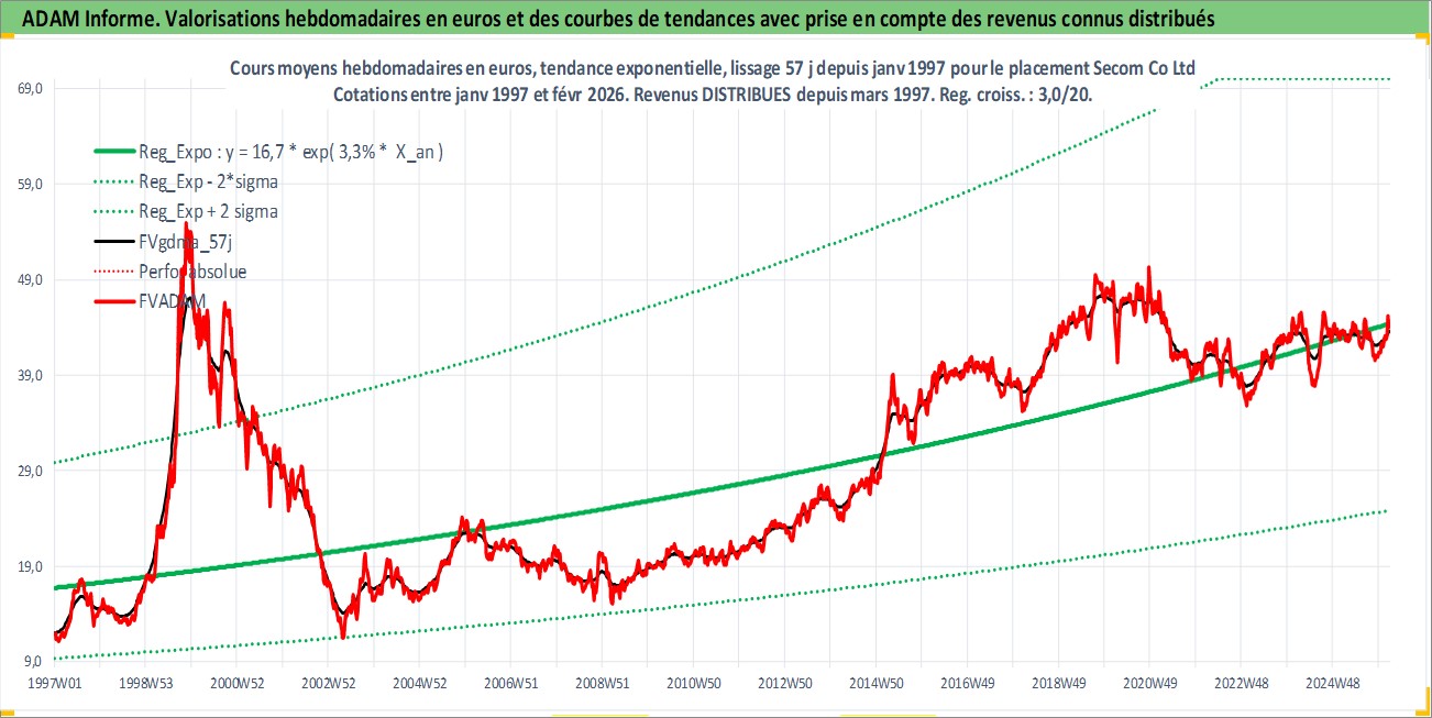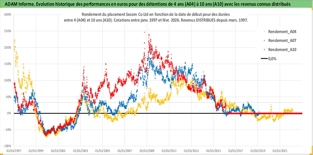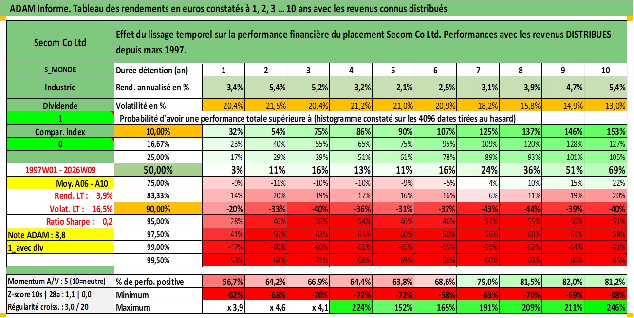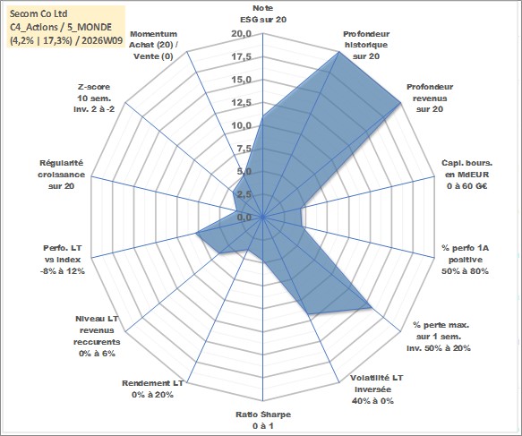 Site dédié aux investisseursPage dédiée sur site financeAnalyse des valorisations hebdomadaires de l'action Secom Co Ltd. Cet actif est cote en JPY. Les valorisations sont en contrevaleur EURO et couvrent les semaines 1997W01 a 2026W09. Les revenus de cet actif financier sont pris en compte depuis la semaine 1997W13. La note globale ESG de cet actif est estimee a 11.0 (apres rebasage entre 0 et 20).