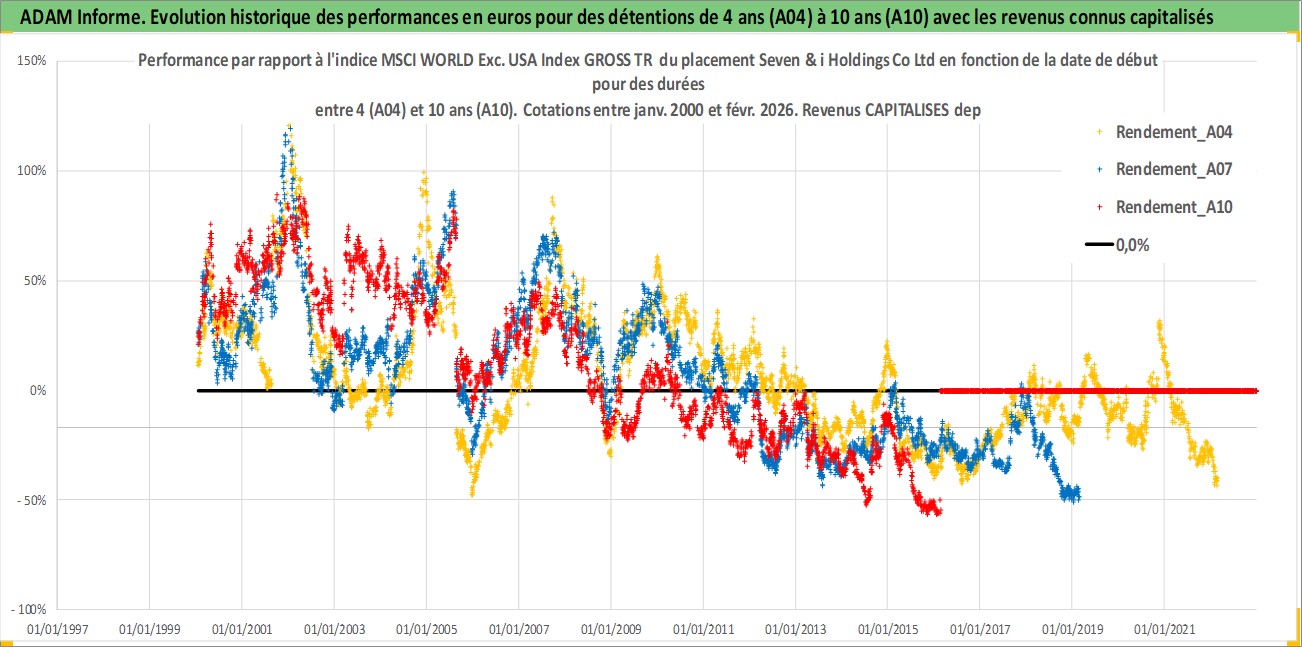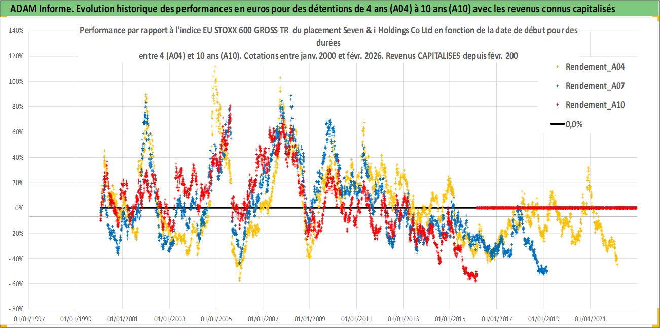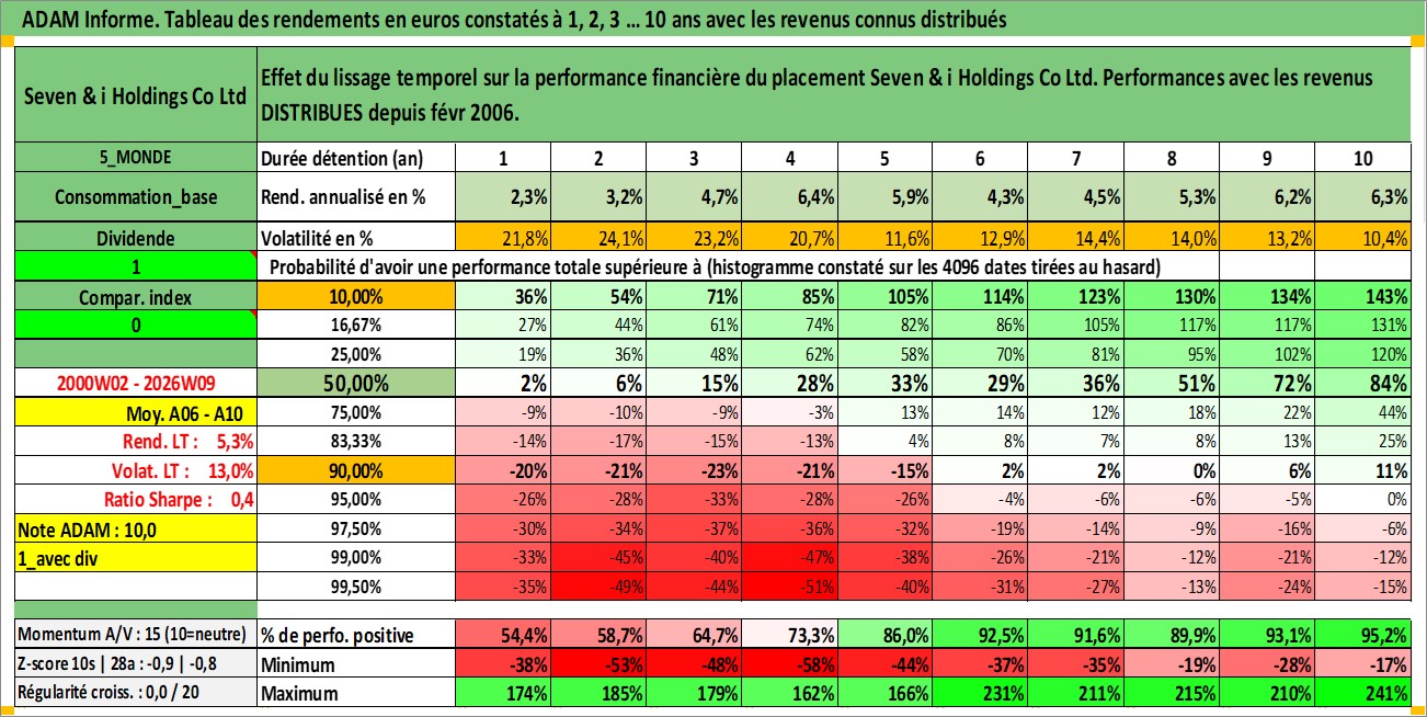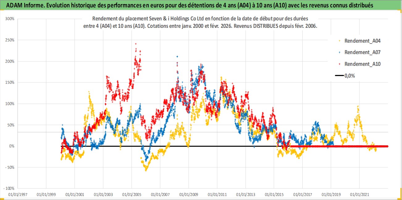 Site dédié aux investisseursPage dédiée sur site financeAnalyse des valorisations hebdomadaires de l'action Seven & i Holdings Co Ltd. Cet actif est cote en JPY. Les valorisations sont en contrevaleur EURO et couvrent les semaines 2000W02 a 2026W09. Les revenus de cet actif financier sont pris en compte depuis la semaine 2006W08. La note globale ESG de cet actif est estimee a 10.0 (apres rebasage entre 0 et 20).