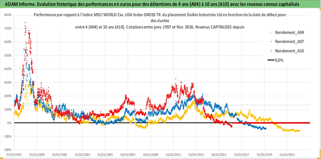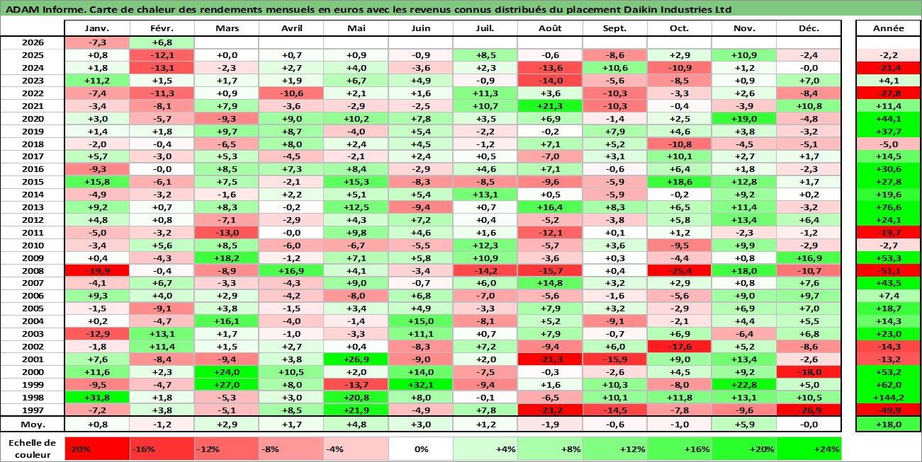 Site dédié aux investisseursPage dédiée sur site financeAnalyse des valorisations hebdomadaires de l'action Daikin Industries Ltd. Cet actif est cote en JPY. Les valorisations sont en contrevaleur EURO et couvrent les semaines 1997W01 a 2026W09. Les revenus de cet actif financier sont pris en compte depuis la semaine 1997W13. La note globale ESG de cet actif est estimee a 9.0 (apres rebasage entre 0 et 20).