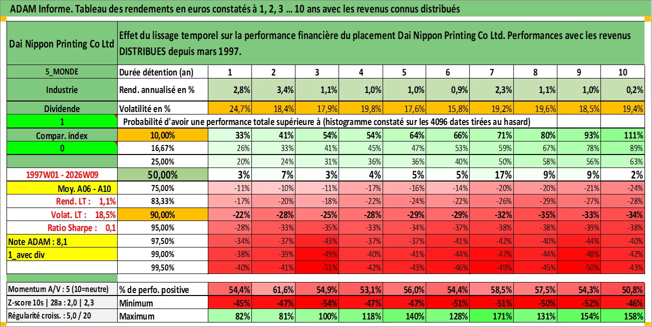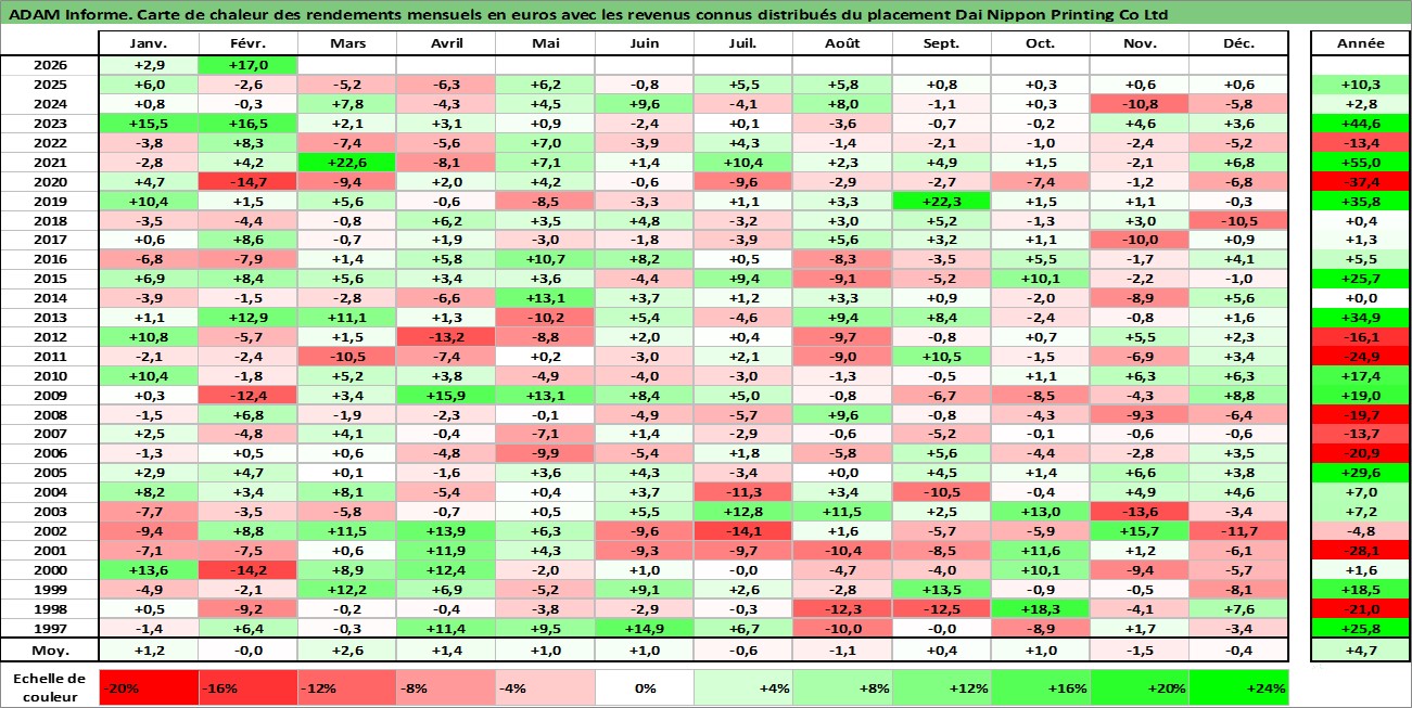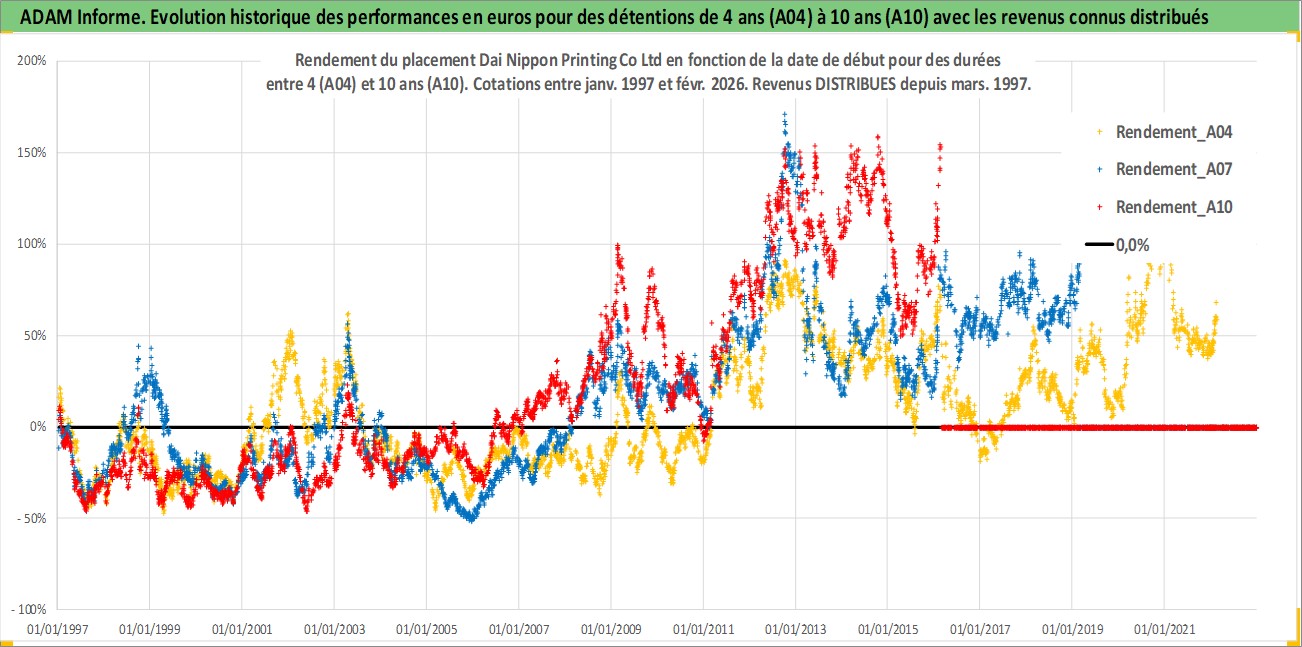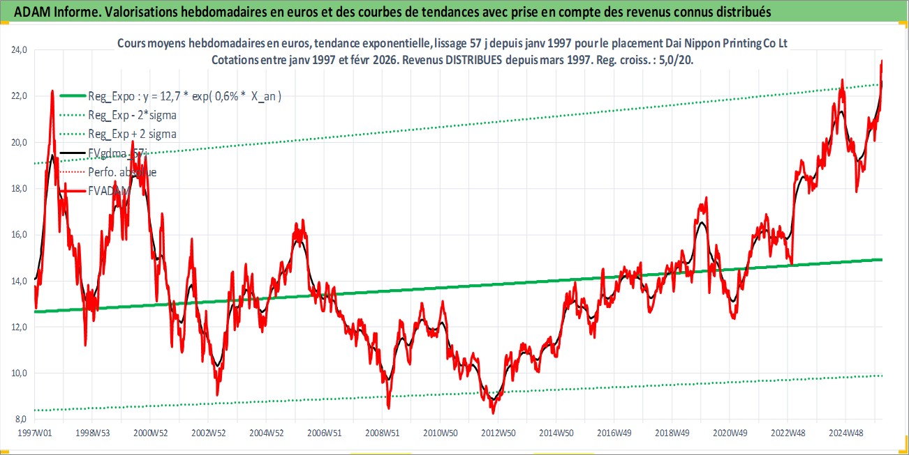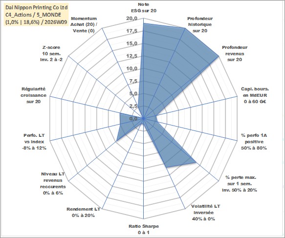 Site dédié aux investisseursPage dédiée sur site financeAnalyse des valorisations hebdomadaires de l'action Dai Nippon Printing Co Ltd. Cet actif est cote en JPY. Les valorisations sont en contrevaleur EURO et couvrent les semaines 1997W01 a 2026W09. Les revenus de cet actif financier sont pris en compte depuis la semaine 1997W13. La note globale ESG de cet actif est estimee a 19.0 (apres rebasage entre 0 et 20).