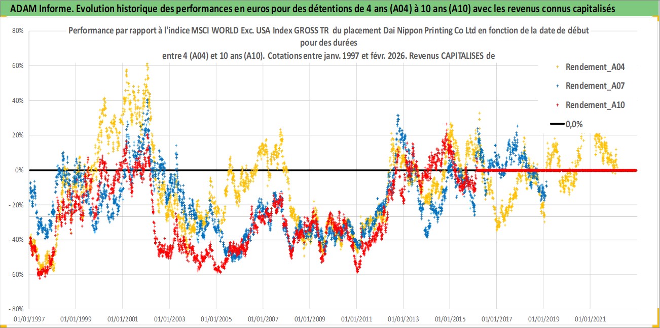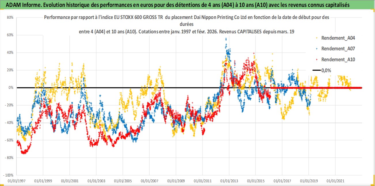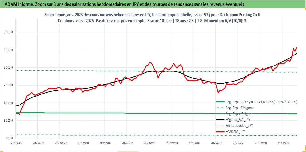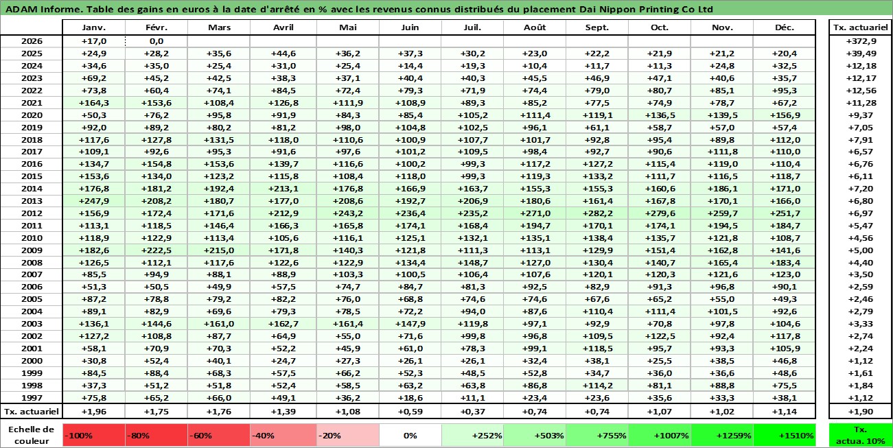 Site dédié aux investisseursPage dédiée sur site financeAnalyse des valorisations hebdomadaires de l'action Dai Nippon Printing Co Ltd. Cet actif est cote en JPY. Les valorisations sont en contrevaleur EURO et couvrent les semaines 1997W01 a 2026W09. Les revenus de cet actif financier sont pris en compte depuis la semaine 1997W13. La note globale ESG de cet actif est estimee a 19.0 (apres rebasage entre 0 et 20).