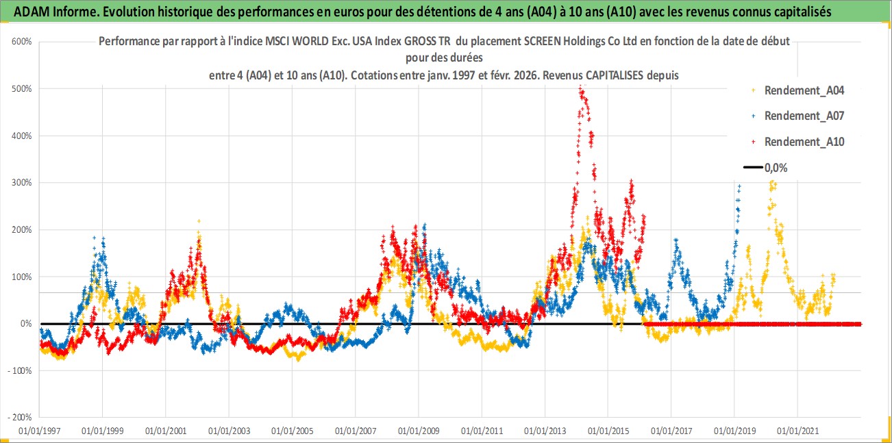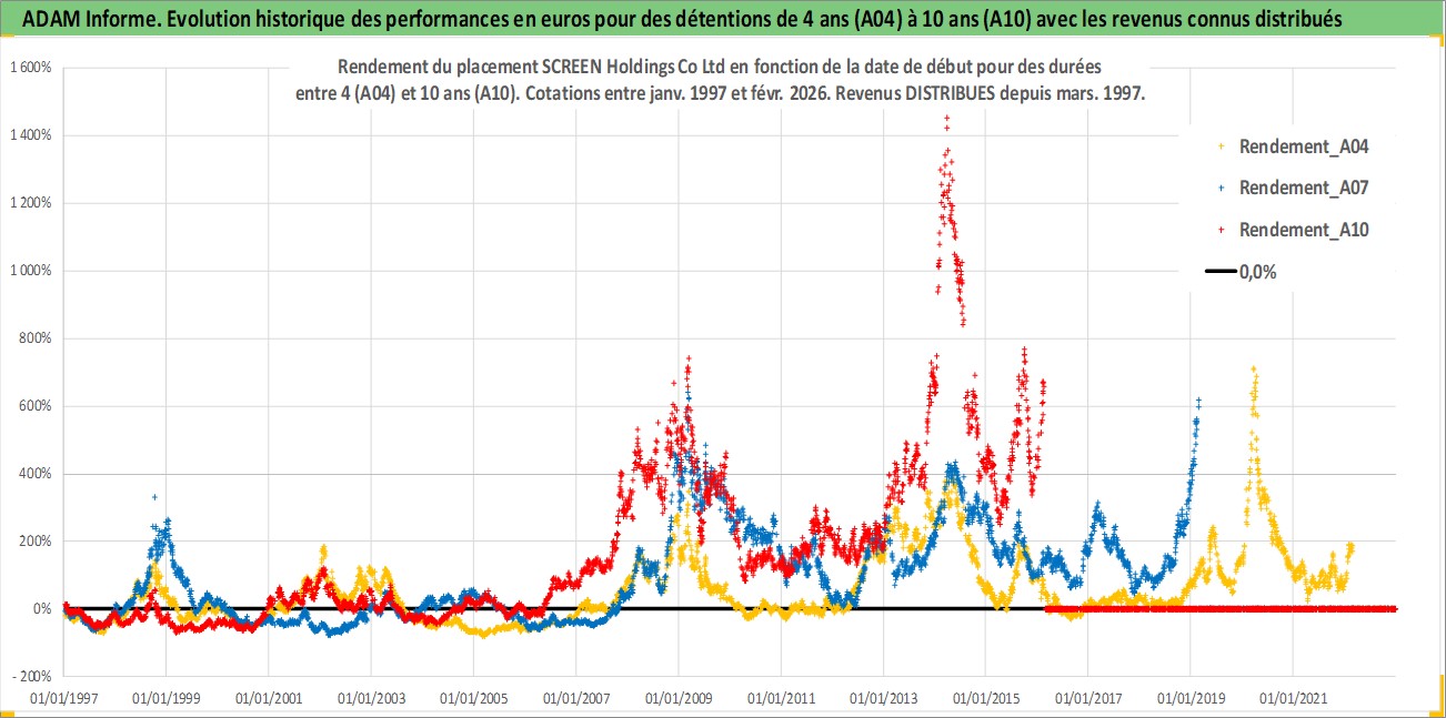 Site dédié aux investisseursPage dédiée sur site financeAnalyse des valorisations hebdomadaires de l'action SCREEN Holdings Co Ltd. Cet actif est cote en JPY. Les valorisations sont en contrevaleur EURO et couvrent les semaines 1997W01 a 2026W09. Les revenus de cet actif financier sont pris en compte depuis la semaine 1997W13. La note ESG de cet actif n'est pas connue.