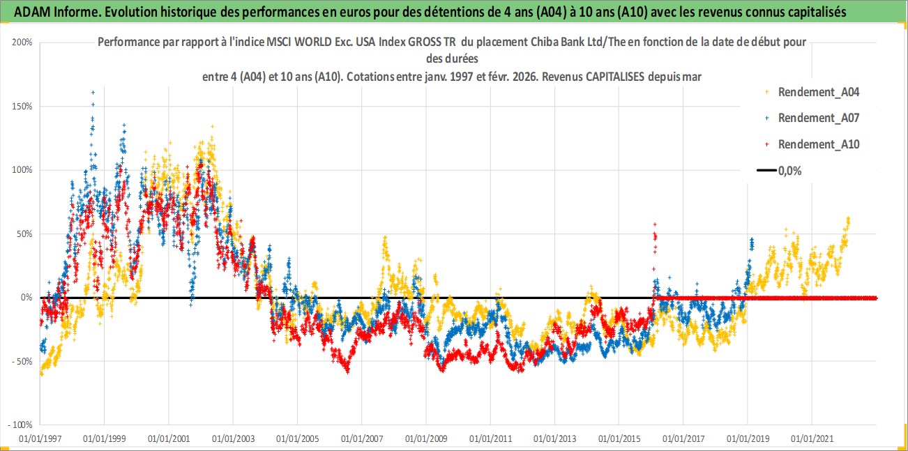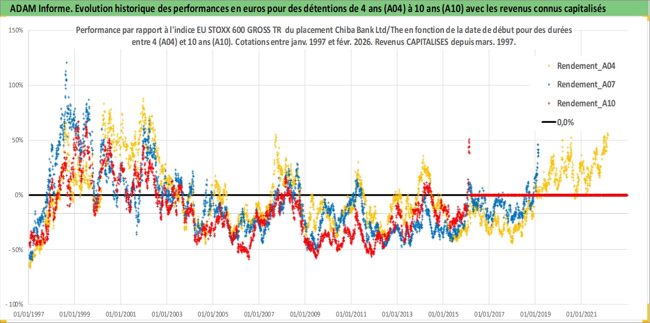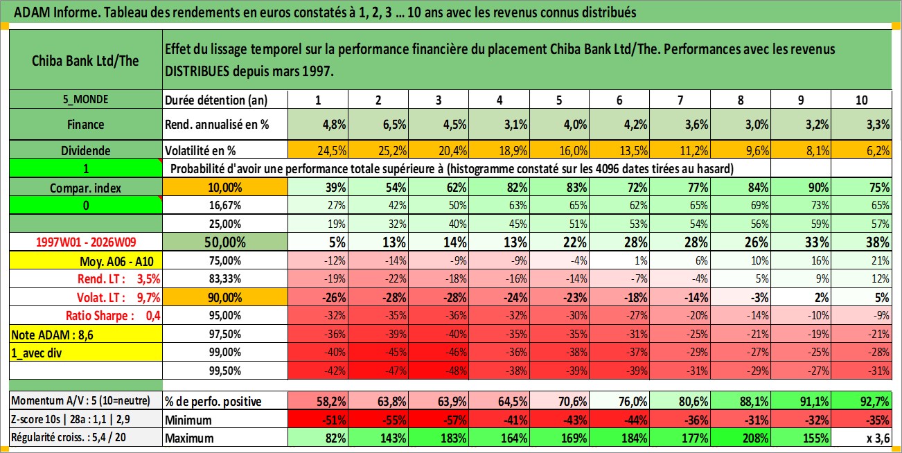 Site dédié aux investisseursPage dédiée sur site financeAnalyse des valorisations hebdomadaires de l'action Chiba Bank Ltd/The. Cet actif est cote en JPY. Les valorisations sont en contrevaleur EURO et couvrent les semaines 1997W01 a 2026W09. Les revenus de cet actif financier sont pris en compte depuis la semaine 1997W13. La note globale ESG de cet actif est estimee a 8.0 (apres rebasage entre 0 et 20).