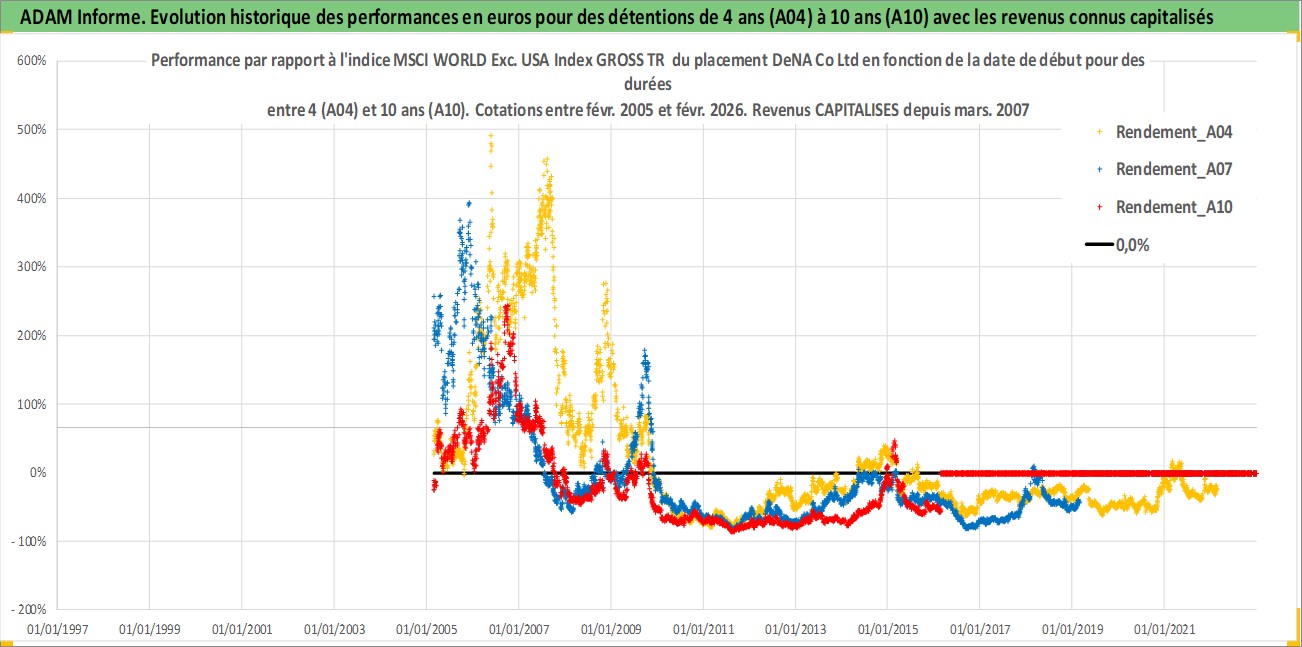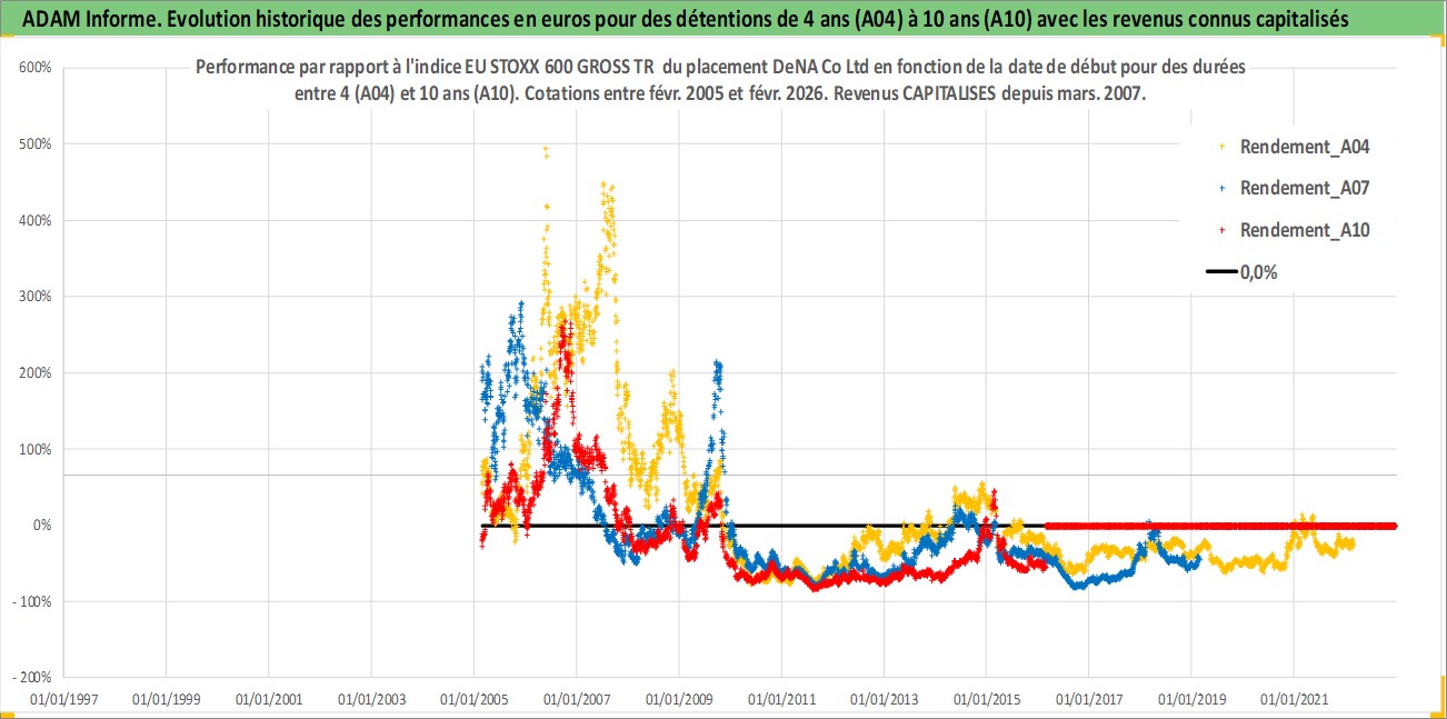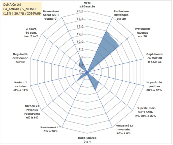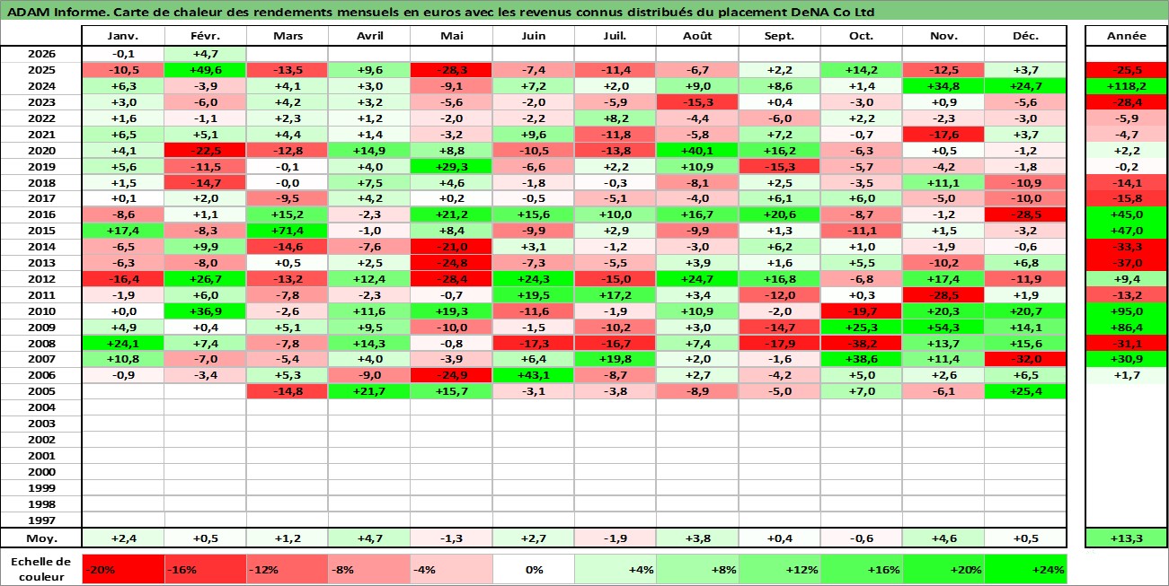 Site dédié aux investisseursPage dédiée sur site financeAnalyse des valorisations hebdomadaires de l'action DeNA Co Ltd. Cet actif est cote en JPY. Les valorisations sont en contrevaleur EURO et couvrent les semaines 2005W07 a 2026W09. Les revenus de cet actif financier sont pris en compte depuis la semaine 2007W13. La note ESG de cet actif n'est pas connue.
