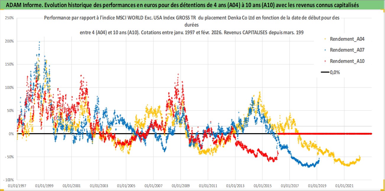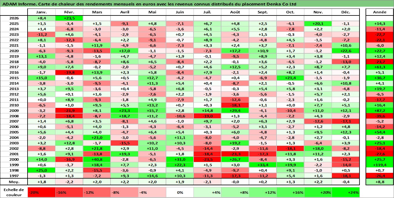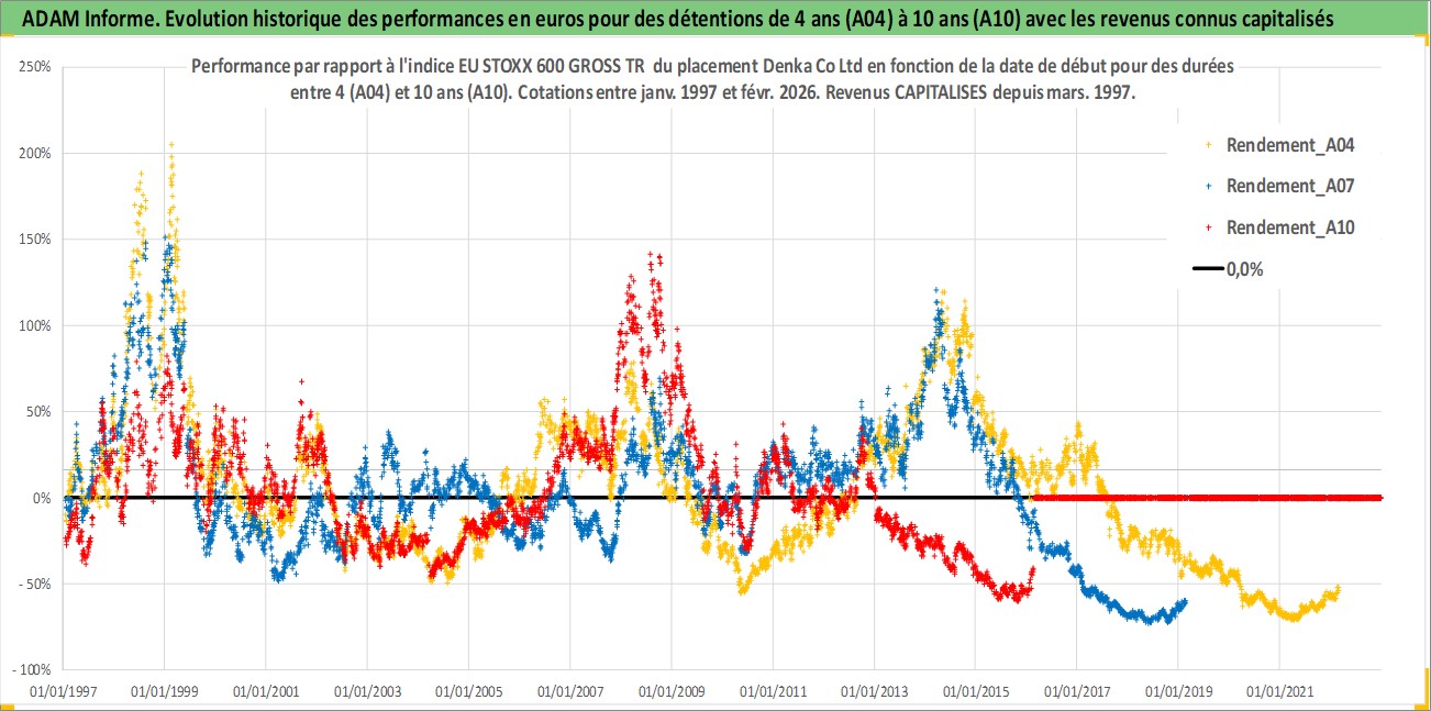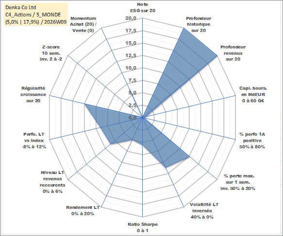 Site dédié aux investisseursPage dédiée sur site financeAnalyse des valorisations hebdomadaires de l'action Denka Co Ltd. Cet actif est cote en JPY. Les valorisations sont en contrevaleur EURO et couvrent les semaines 1997W01 a 2026W09. Les revenus de cet actif financier sont pris en compte depuis la semaine 1997W13. La note ESG de cet actif n'est pas connue.