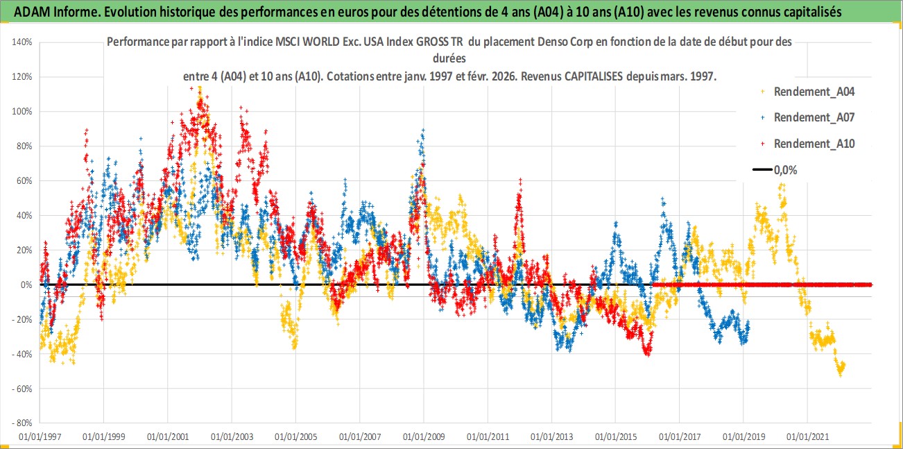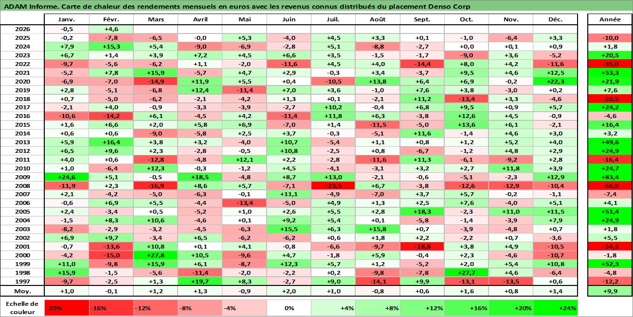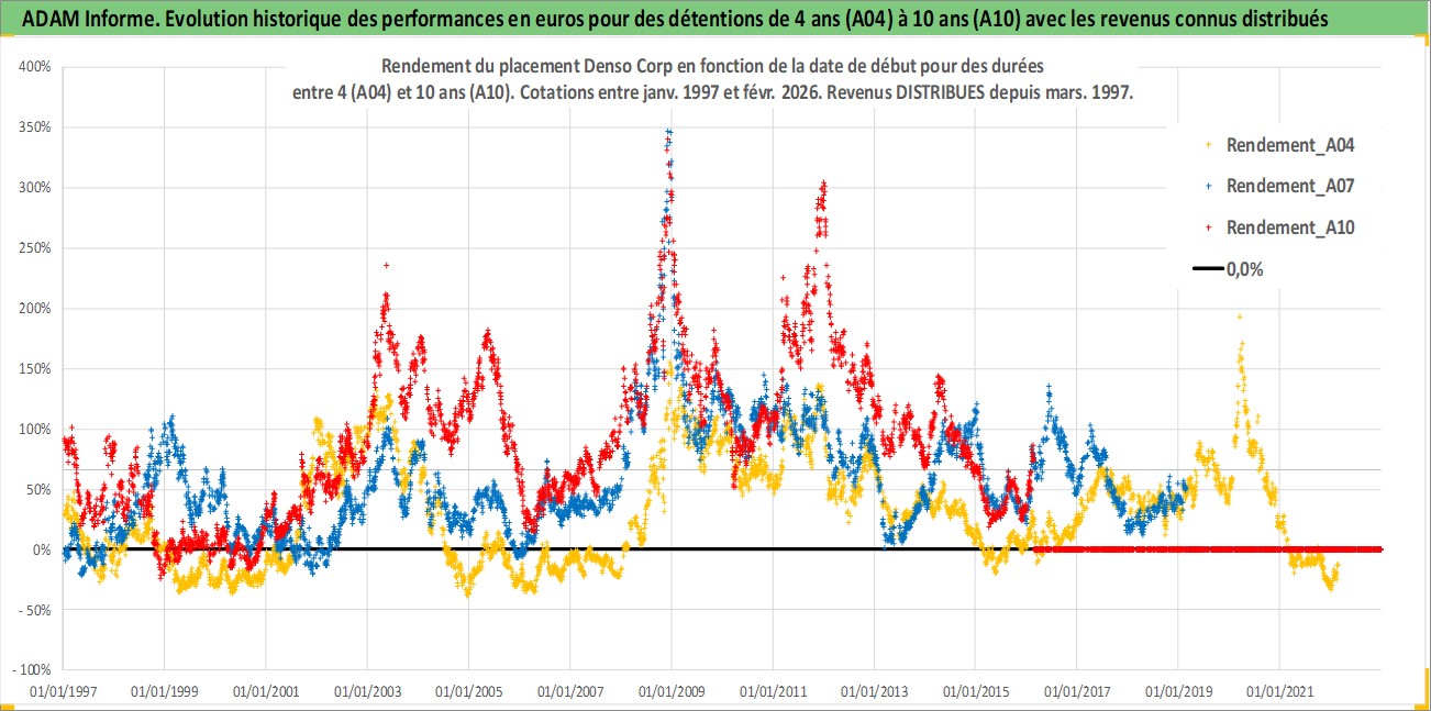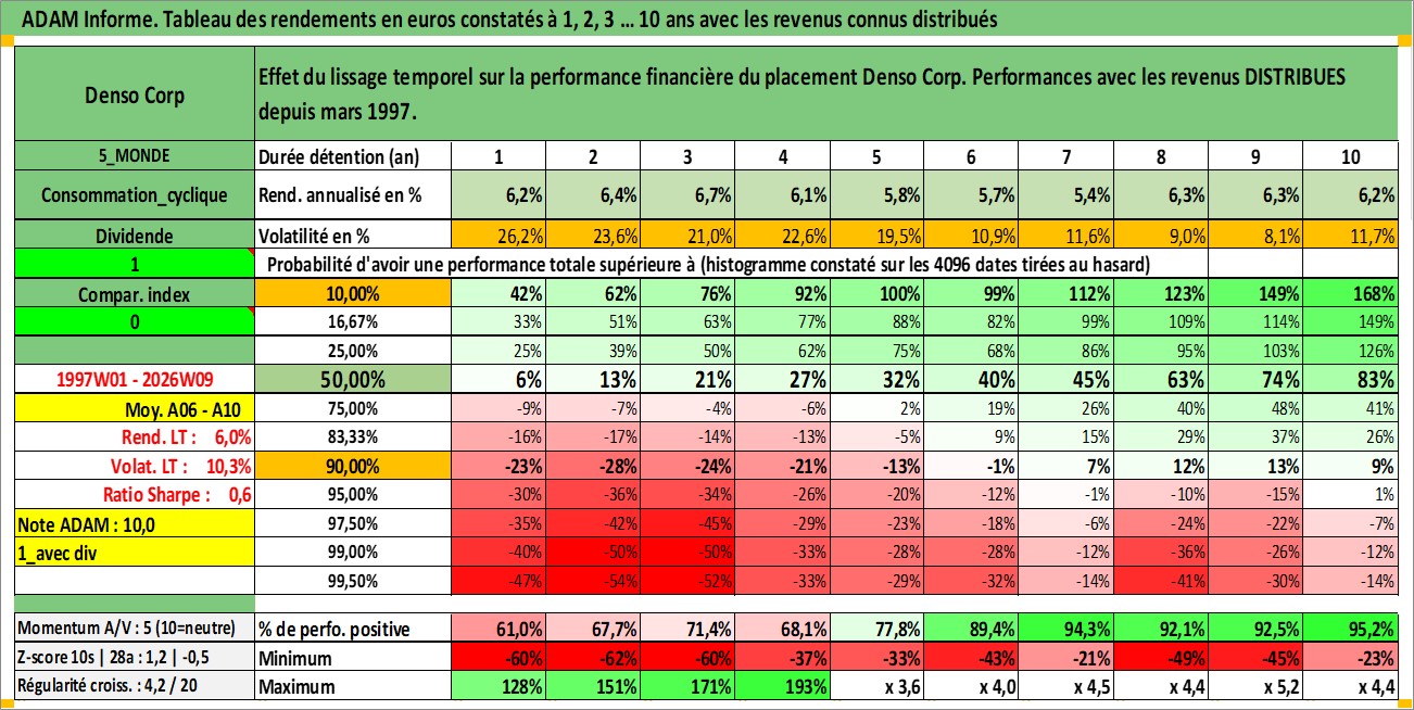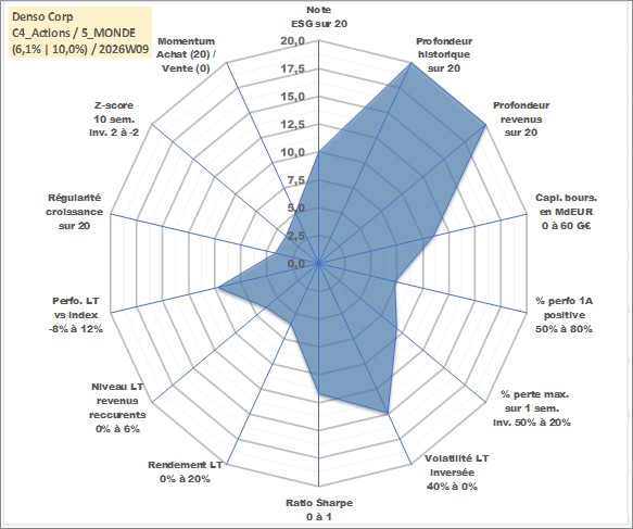 Site dédié aux investisseursPage dédiée sur site financeAnalyse des valorisations hebdomadaires de l'action Denso Corp. Cet actif est cote en JPY. Les valorisations sont en contrevaleur EURO et couvrent les semaines 1997W01 a 2026W09. Les revenus de cet actif financier sont pris en compte depuis la semaine 1997W13. La note globale ESG de cet actif est estimee a 10.0 (apres rebasage entre 0 et 20).