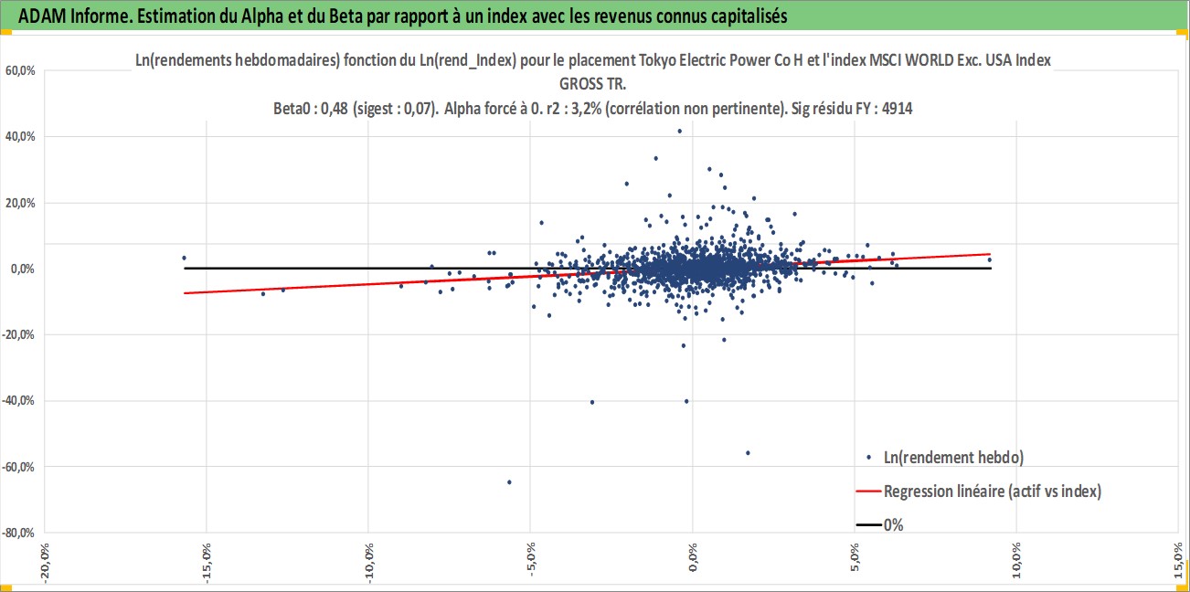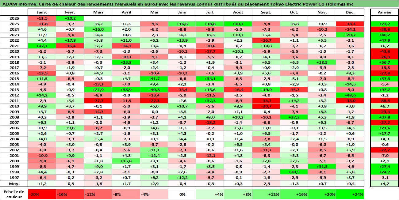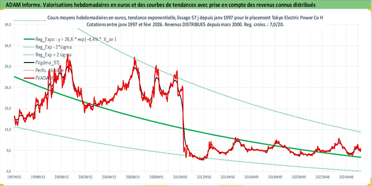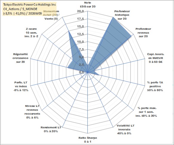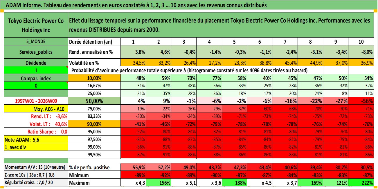 Site dédié aux investisseursPage dédiée sur site financeAnalyse des valorisations hebdomadaires de l'action Tokyo Electric Power Co Holdings Inc. Cet actif est cote en JPY. Les valorisations sont en contrevaleur EURO et couvrent les semaines 1997W01 a 2026W09. Les revenus de cet actif financier sont pris en compte depuis la semaine 2000W13. La note globale ESG de cet actif est estimee a 2.0 (apres rebasage entre 0 et 20).
