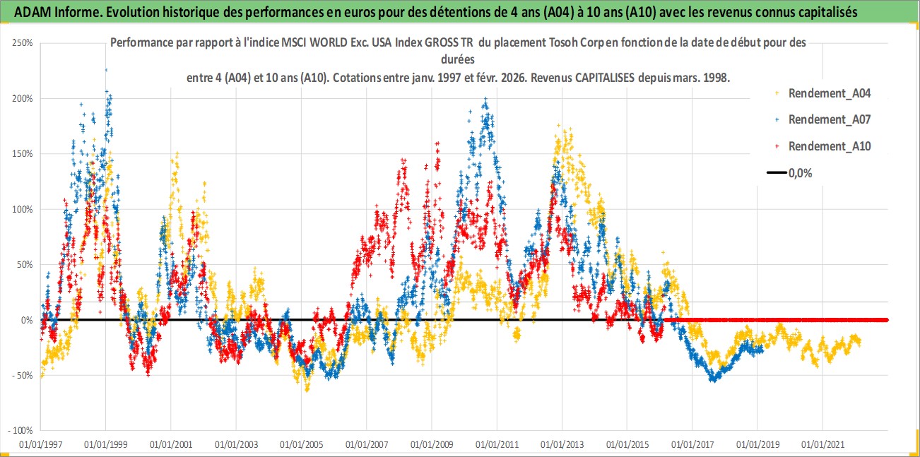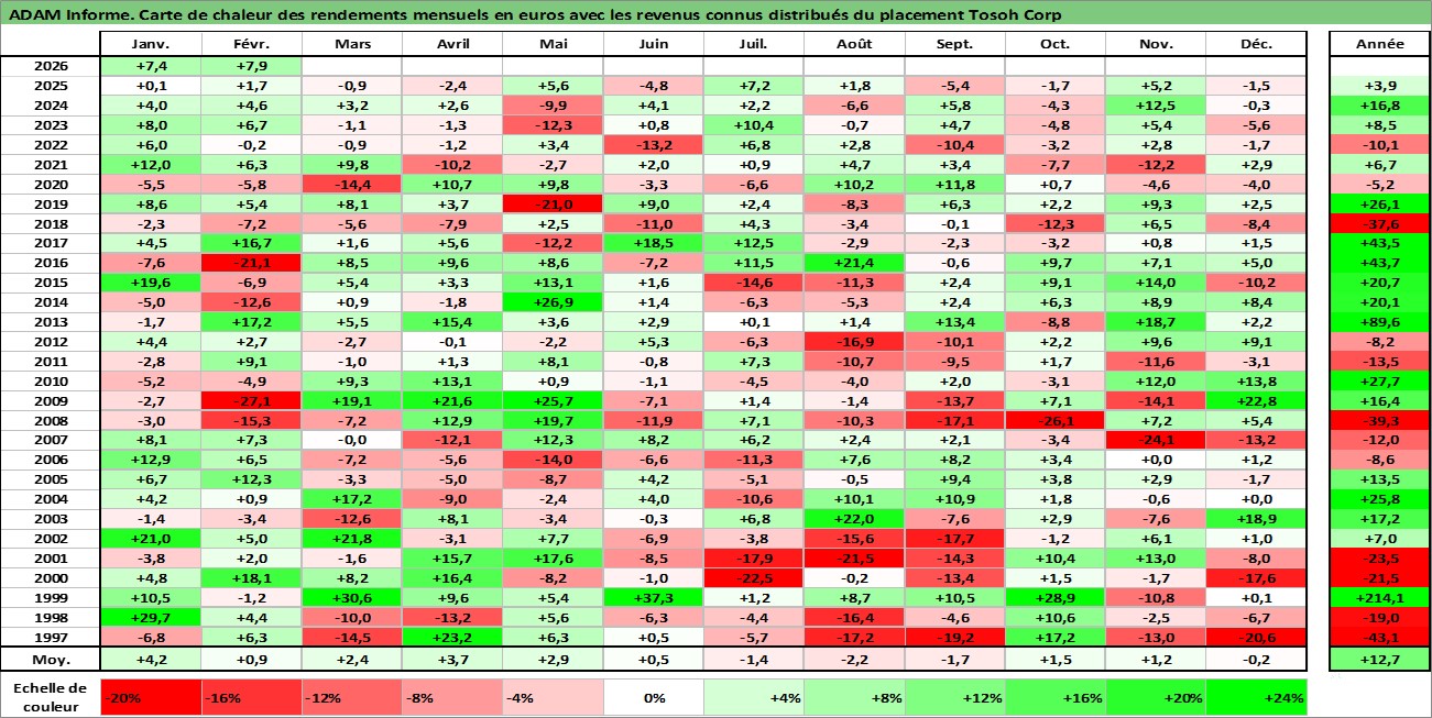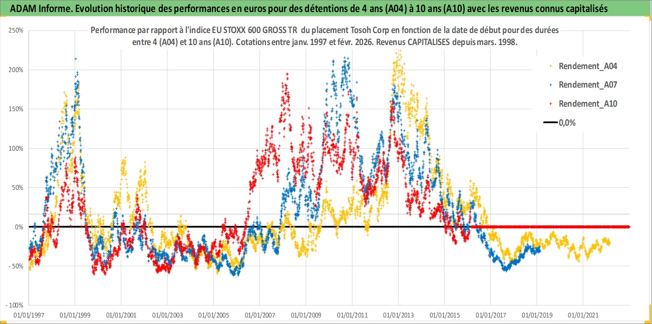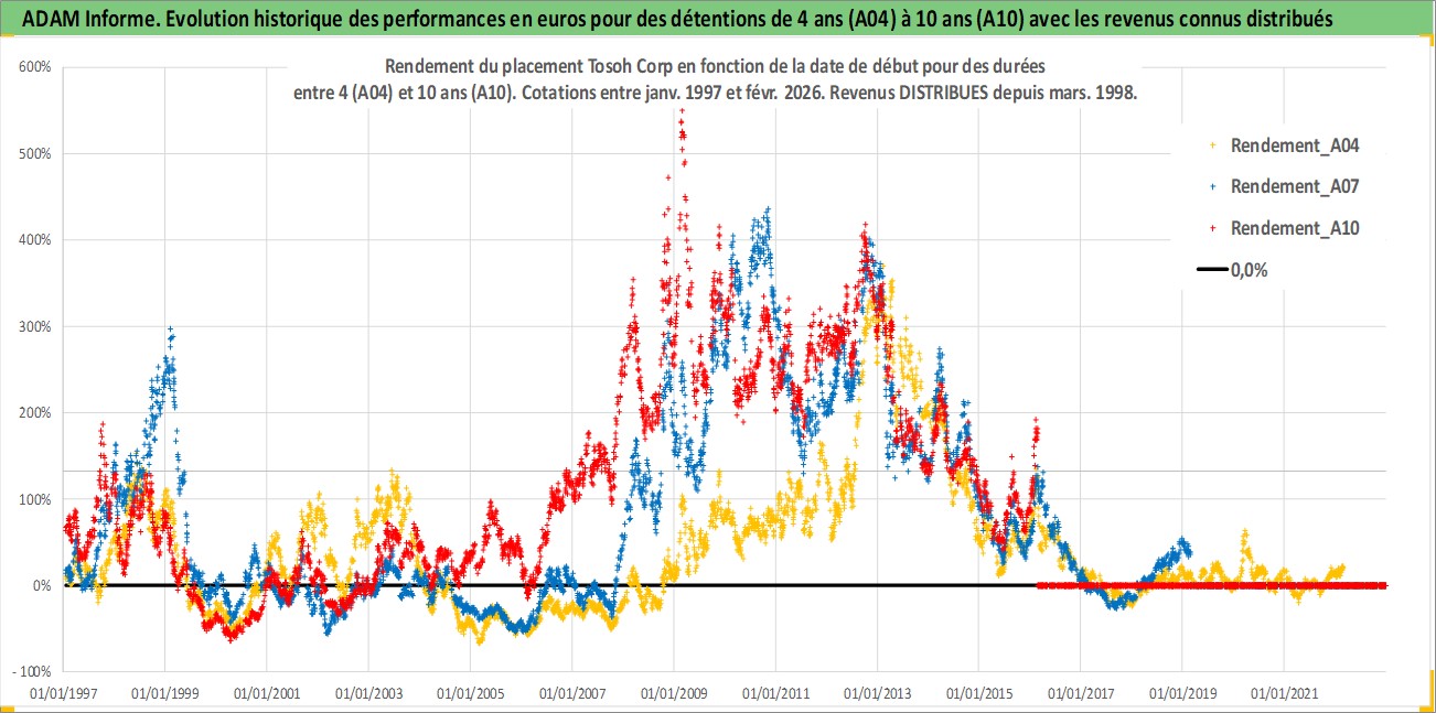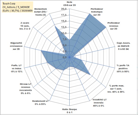 Site dédié aux investisseursPage dédiée sur site financeAnalyse des valorisations hebdomadaires de l'action Tosoh Corp. Cet actif est cote en JPY. Les valorisations sont en contrevaleur EURO et couvrent les semaines 1997W01 a 2026W09. Les revenus de cet actif financier sont pris en compte depuis la semaine 1998W13. La note globale ESG de cet actif est estimee a 7.0 (apres rebasage entre 0 et 20).