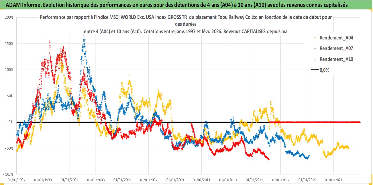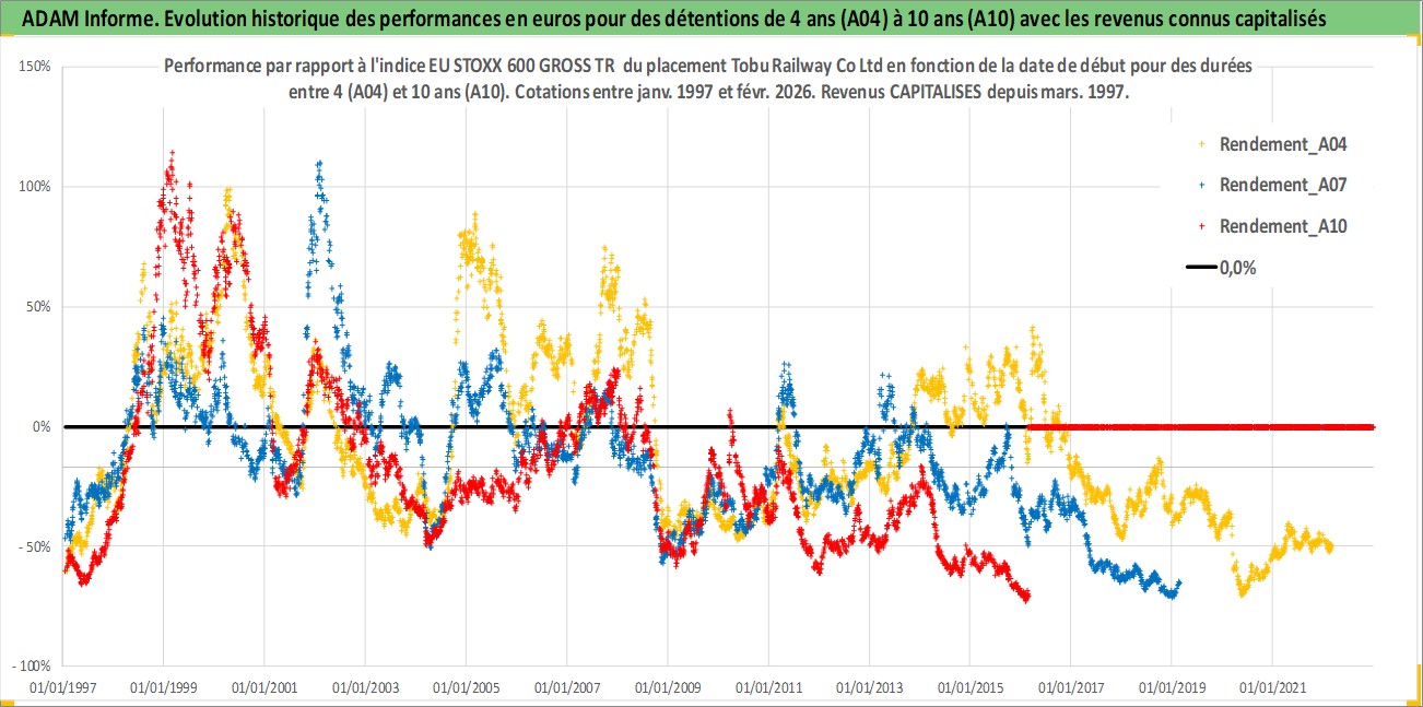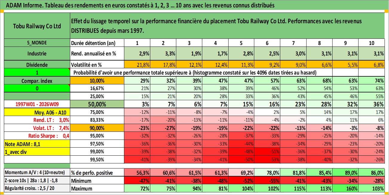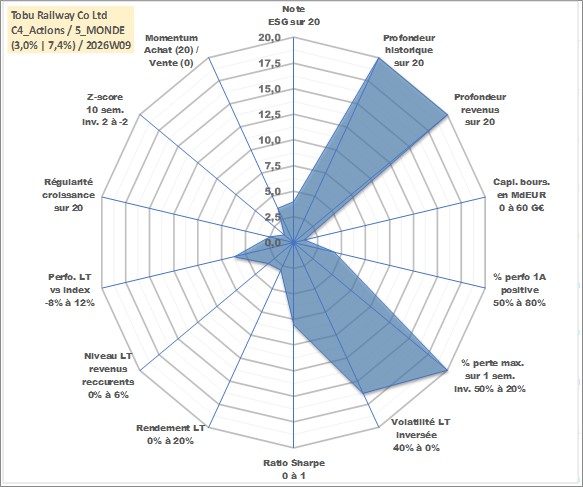 Site dédié aux investisseursPage dédiée sur site financeAnalyse des valorisations hebdomadaires de l'action Tobu Railway Co Ltd. Cet actif est cote en JPY. Les valorisations sont en contrevaleur EURO et couvrent les semaines 1997W01 a 2026W09. Les revenus de cet actif financier sont pris en compte depuis la semaine 1997W13. La note globale ESG de cet actif est estimee a 4.0 (apres rebasage entre 0 et 20).