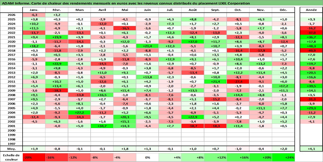 Site dédié aux investisseursPage dédiée sur site financeAnalyse des valorisations hebdomadaires de l'action LIXIL Corporation. Cet actif est cote en JPY. Les valorisations sont en contrevaleur EURO et couvrent les semaines 2001W02 a 2026W09. Les revenus de cet actif financier sont pris en compte depuis la semaine 2001W13. La note globale ESG de cet actif est estimee a 12.0 (apres rebasage entre 0 et 20).