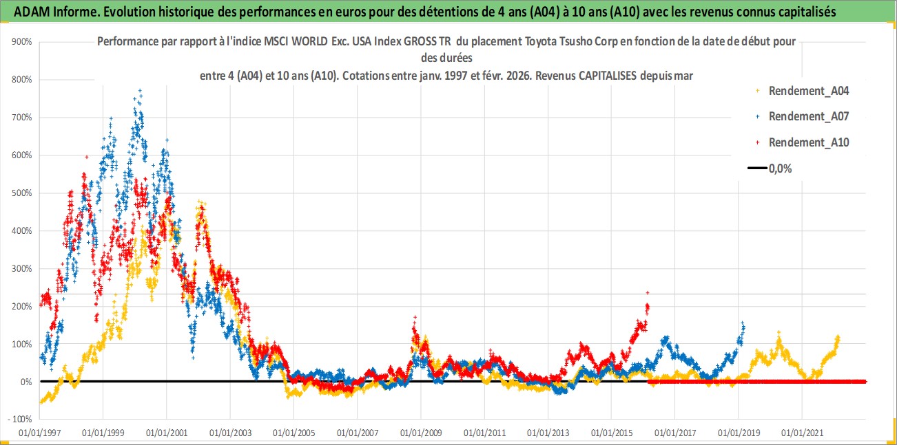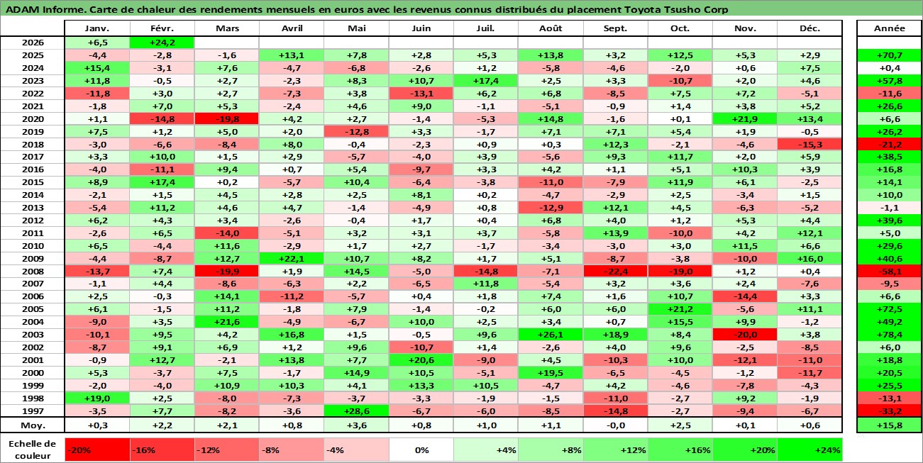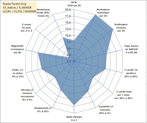 Site dédié aux investisseursPage dédiée sur site financeAnalyse des valorisations hebdomadaires de l'action Toyota Tsusho Corp. Cet actif est cote en JPY. Les valorisations sont en contrevaleur EURO et couvrent les semaines 1997W01 a 2026W09. Les revenus de cet actif financier sont pris en compte depuis la semaine 1997W13. La note globale ESG de cet actif est estimee a 8.0 (apres rebasage entre 0 et 20).