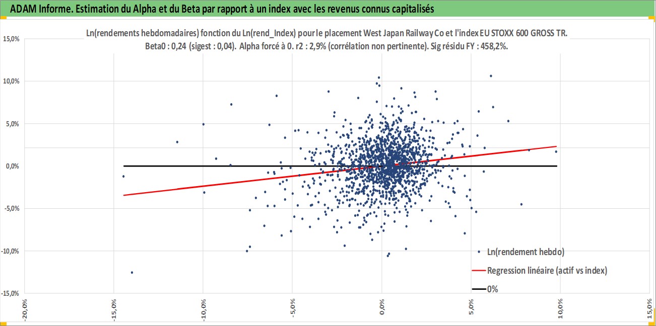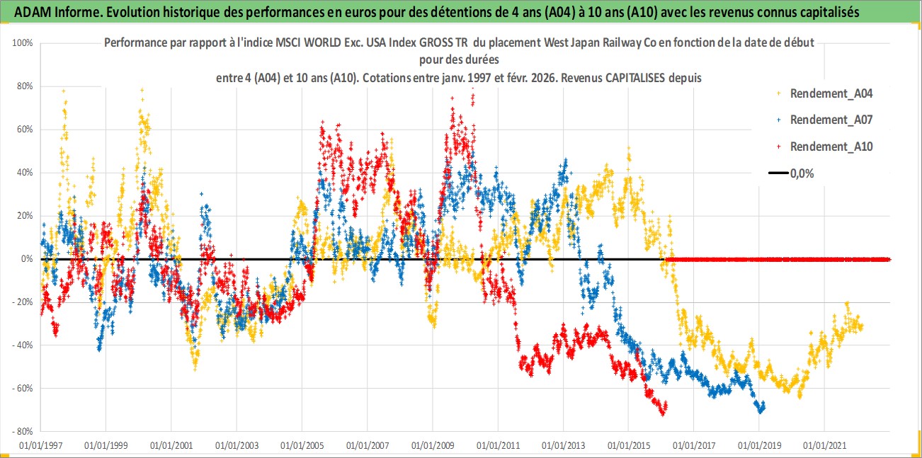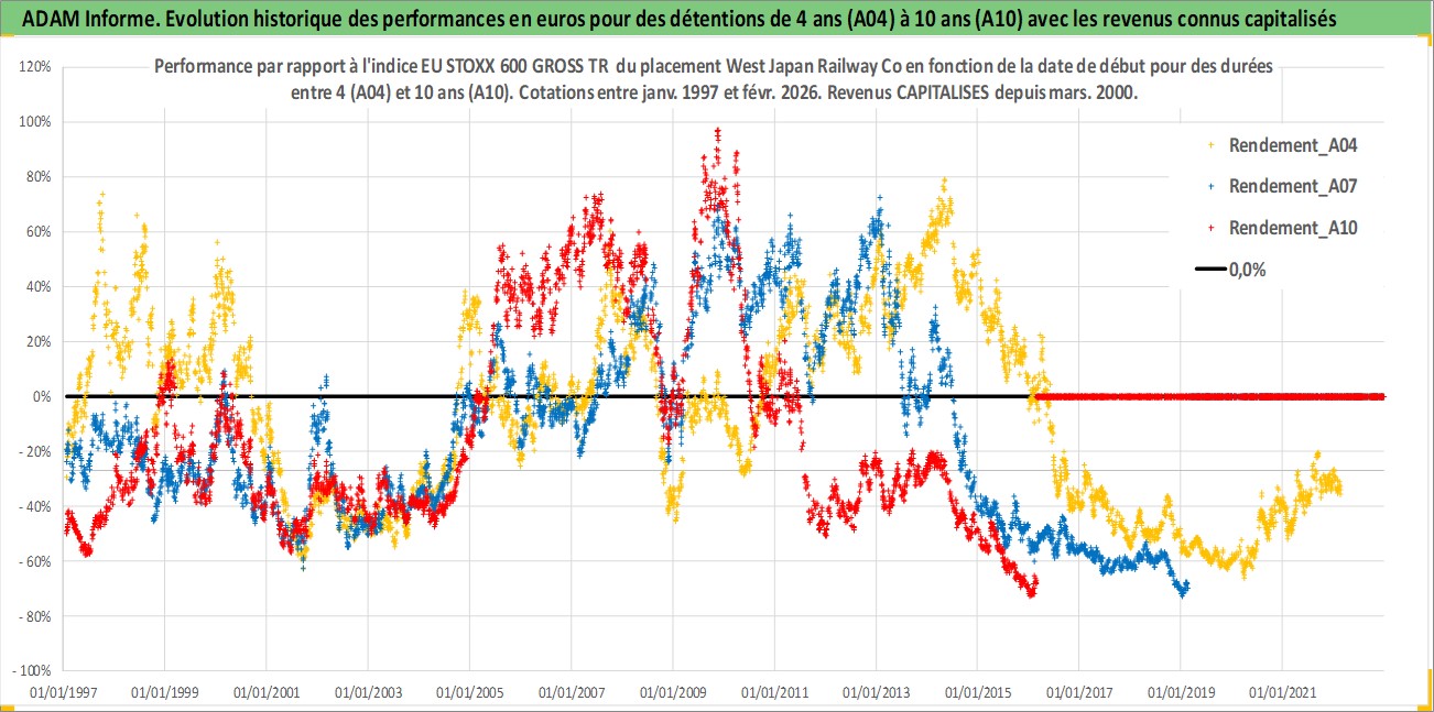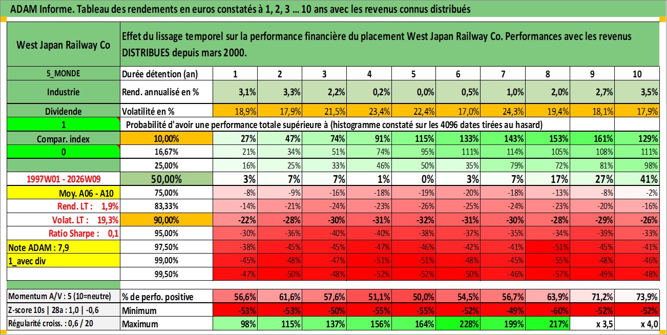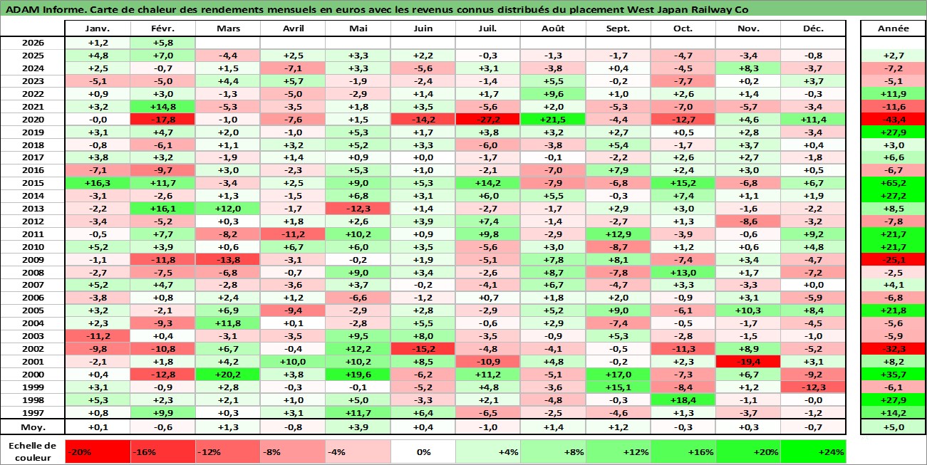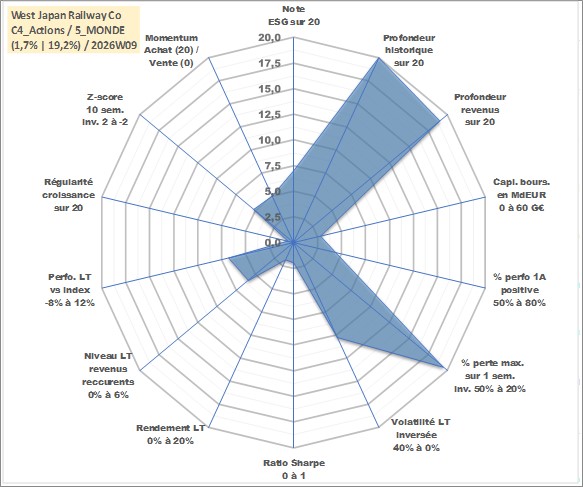 Site dédié aux investisseursPage dédiée sur site financeAnalyse des valorisations hebdomadaires de l'action West Japan Railway Co. Cet actif est cote en JPY. Les valorisations sont en contrevaleur EURO et couvrent les semaines 1997W01 a 2026W09. Les revenus de cet actif financier sont pris en compte depuis la semaine 2000W13. La note globale ESG de cet actif est estimee a 7.0 (apres rebasage entre 0 et 20).