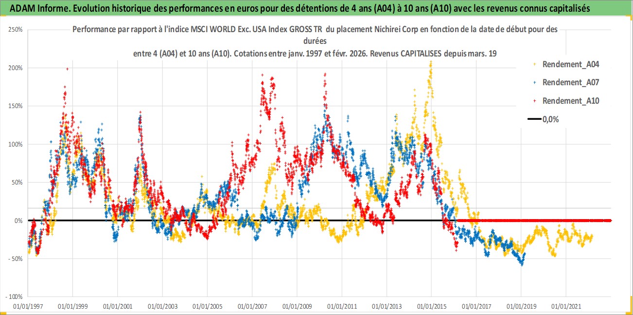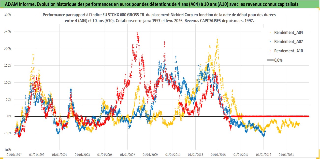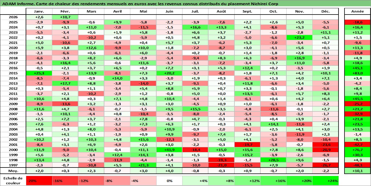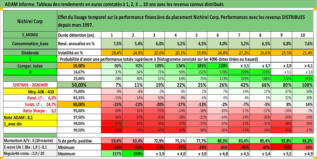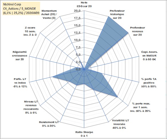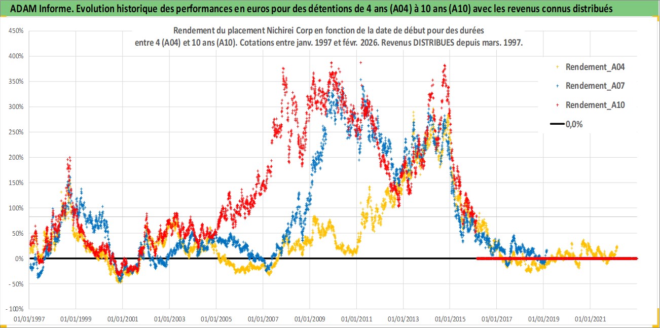 Site dédié aux investisseursPage dédiée sur site financeAnalyse des valorisations hebdomadaires de l'action Nichirei Corp. Cet actif est cote en JPY. Les valorisations sont en contrevaleur EURO et couvrent les semaines 1997W01 a 2026W09. Les revenus de cet actif financier sont pris en compte depuis la semaine 1997W13. La note ESG de cet actif n'est pas connue.
