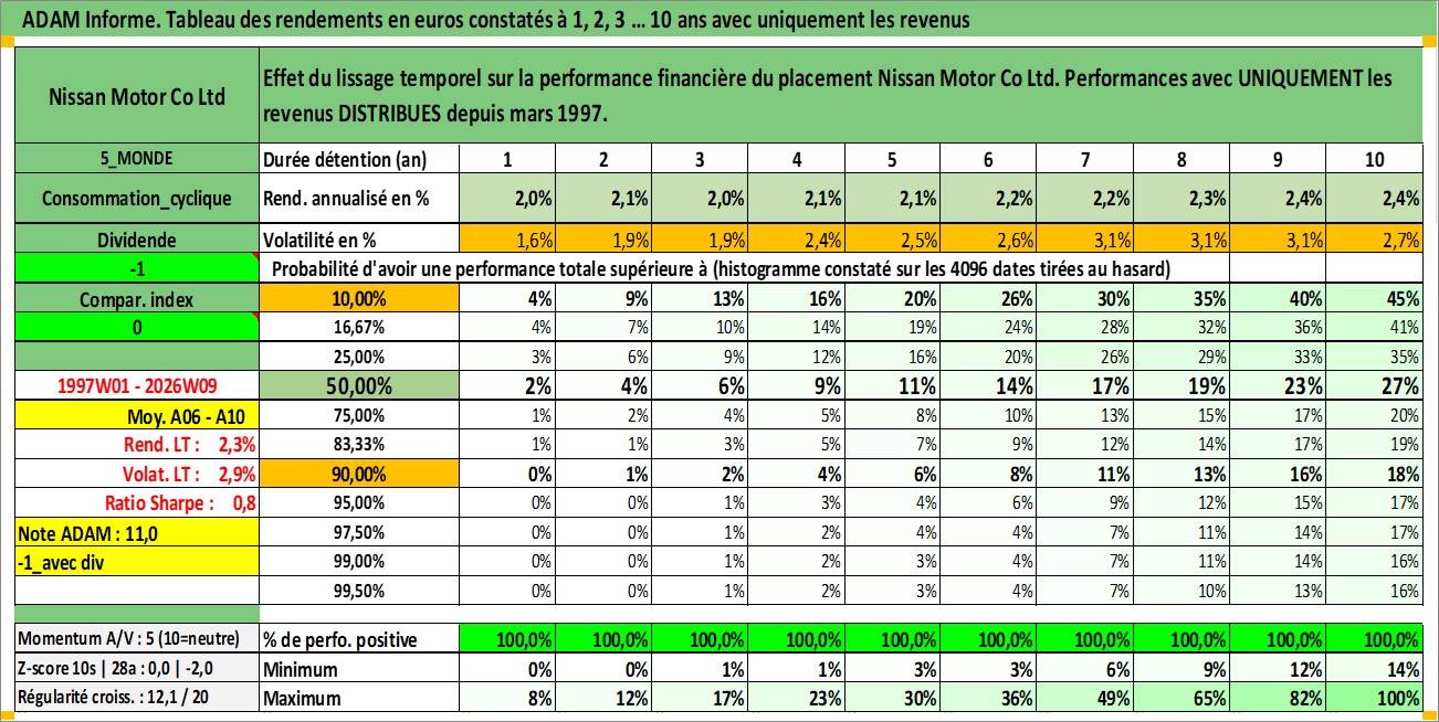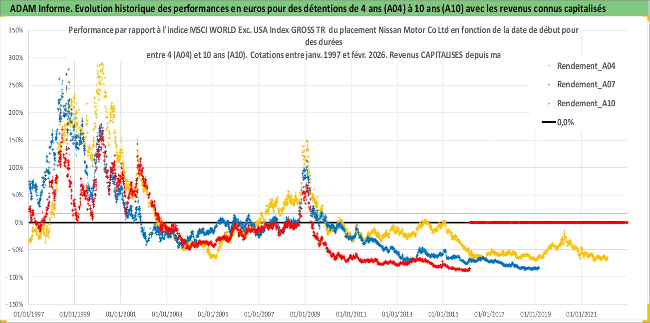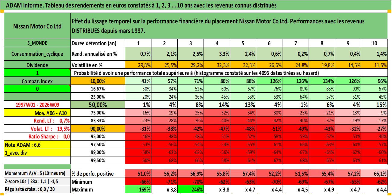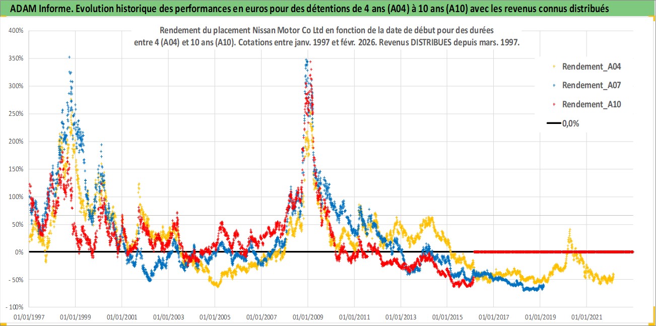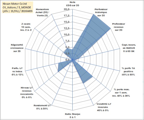 Site dédié aux investisseursPage dédiée sur site financeAnalyse des valorisations hebdomadaires de l'action Nissan Motor Co Ltd. Cet actif est cote en JPY. Les valorisations sont en contrevaleur EURO et couvrent les semaines 1997W01 a 2026W09. Les revenus de cet actif financier sont pris en compte depuis la semaine 1997W13. La note globale ESG de cet actif est estimee a 4.0 (apres rebasage entre 0 et 20).