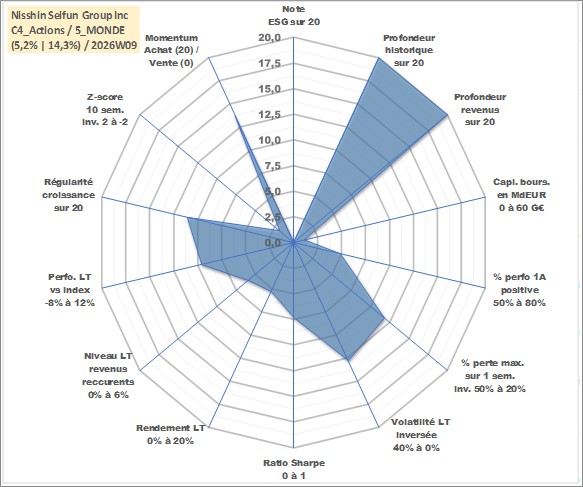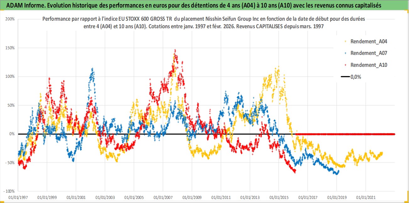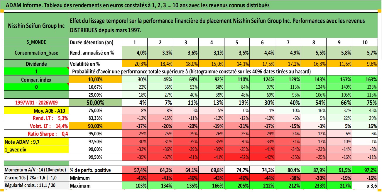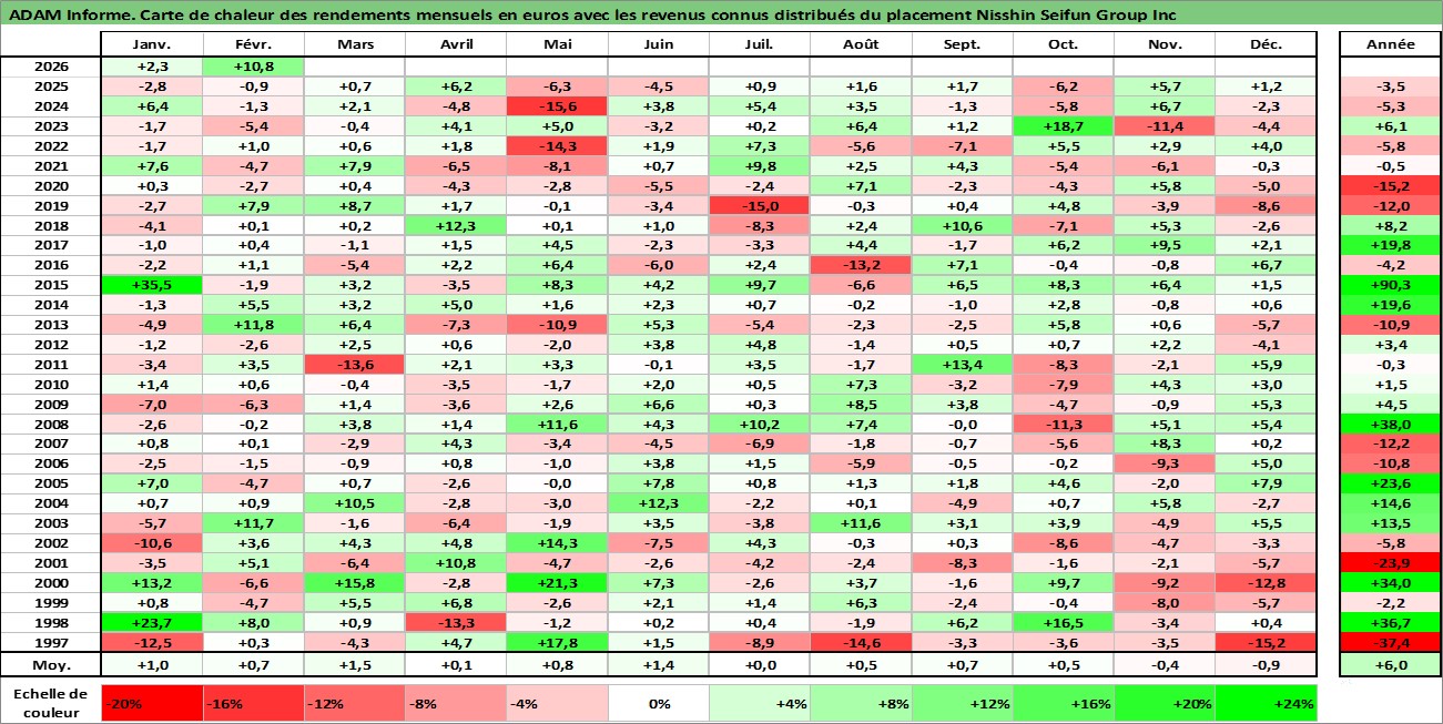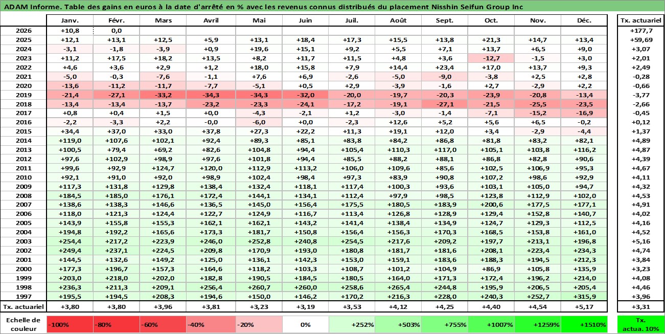 Site dédié aux investisseursPage dédiée sur site financeAnalyse des valorisations hebdomadaires de l'action Nisshin Seifun Group Inc. Cet actif est cote en JPY. Les valorisations sont en contrevaleur EURO et couvrent les semaines 1997W01 a 2026W09. Les revenus de cet actif financier sont pris en compte depuis la semaine 1997W13. La note ESG de cet actif n'est pas connue.