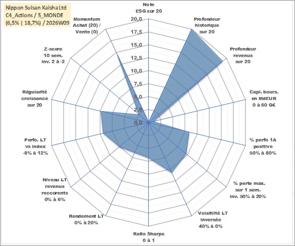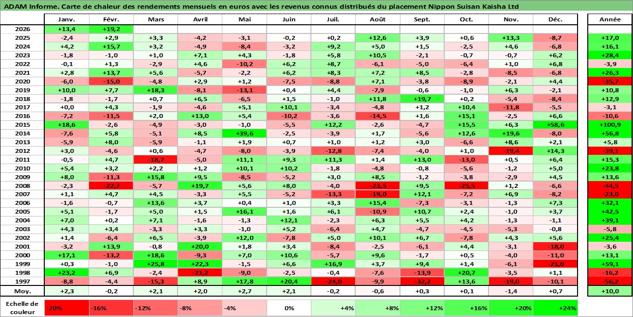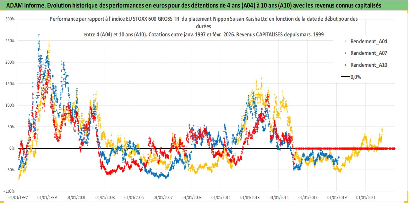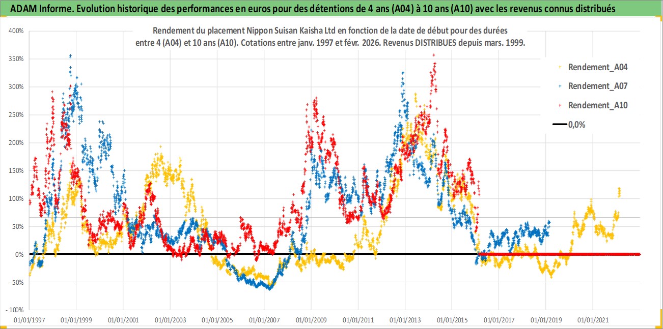 Site dédié aux investisseursPage dédiée sur site financeAnalyse des valorisations hebdomadaires de l'action Nippon Suisan Kaisha Ltd. Cet actif est cote en JPY. Les valorisations sont en contrevaleur EURO et couvrent les semaines 1997W01 a 2026W09. Les revenus de cet actif financier sont pris en compte depuis la semaine 1999W12. La note ESG de cet actif n'est pas connue.