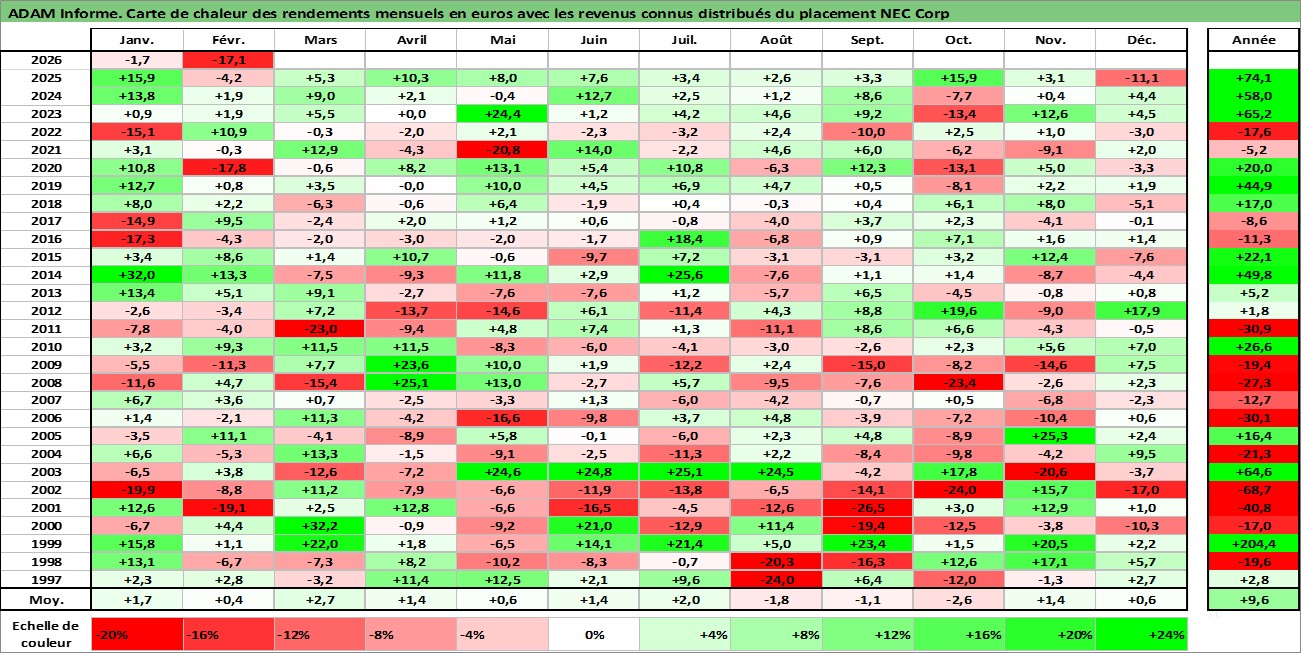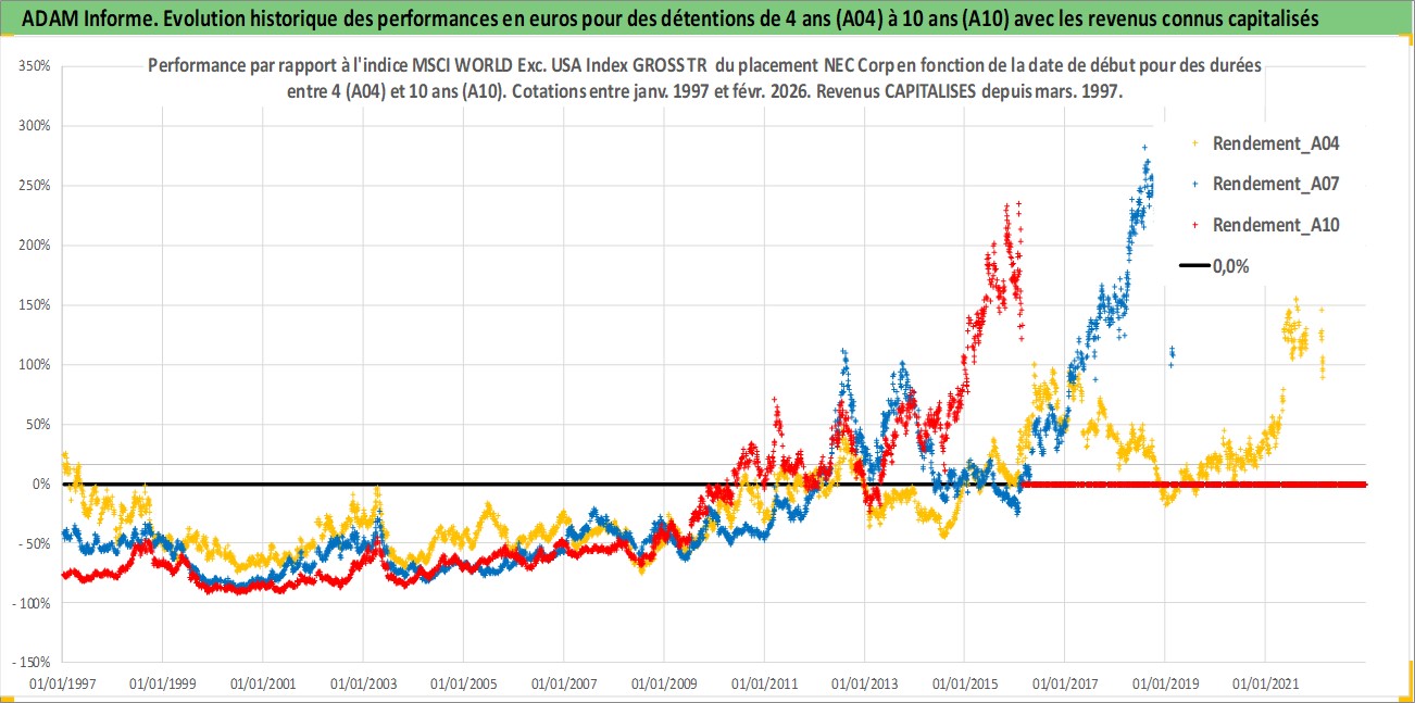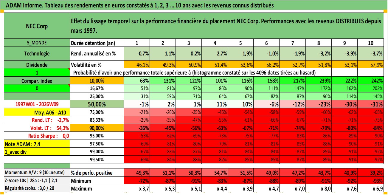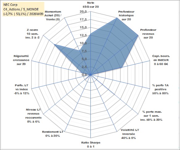 Site dédié aux investisseursPage dédiée sur site financeAnalyse des valorisations hebdomadaires de l'action NEC Corp. Cet actif est cote en JPY. Les valorisations sont en contrevaleur EURO et couvrent les semaines 1997W01 a 2026W09. Les revenus de cet actif financier sont pris en compte depuis la semaine 1997W13. La note globale ESG de cet actif est estimee a 13.0 (apres rebasage entre 0 et 20).