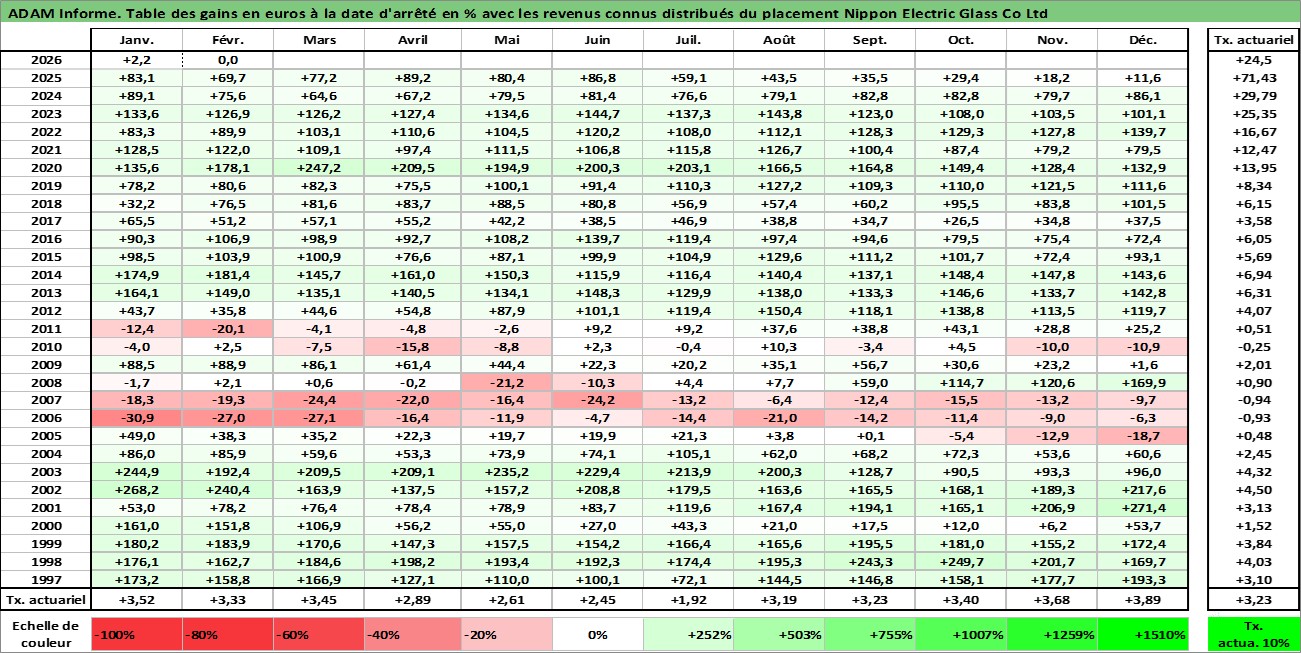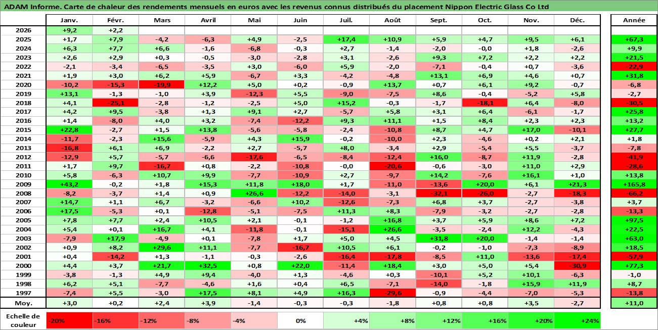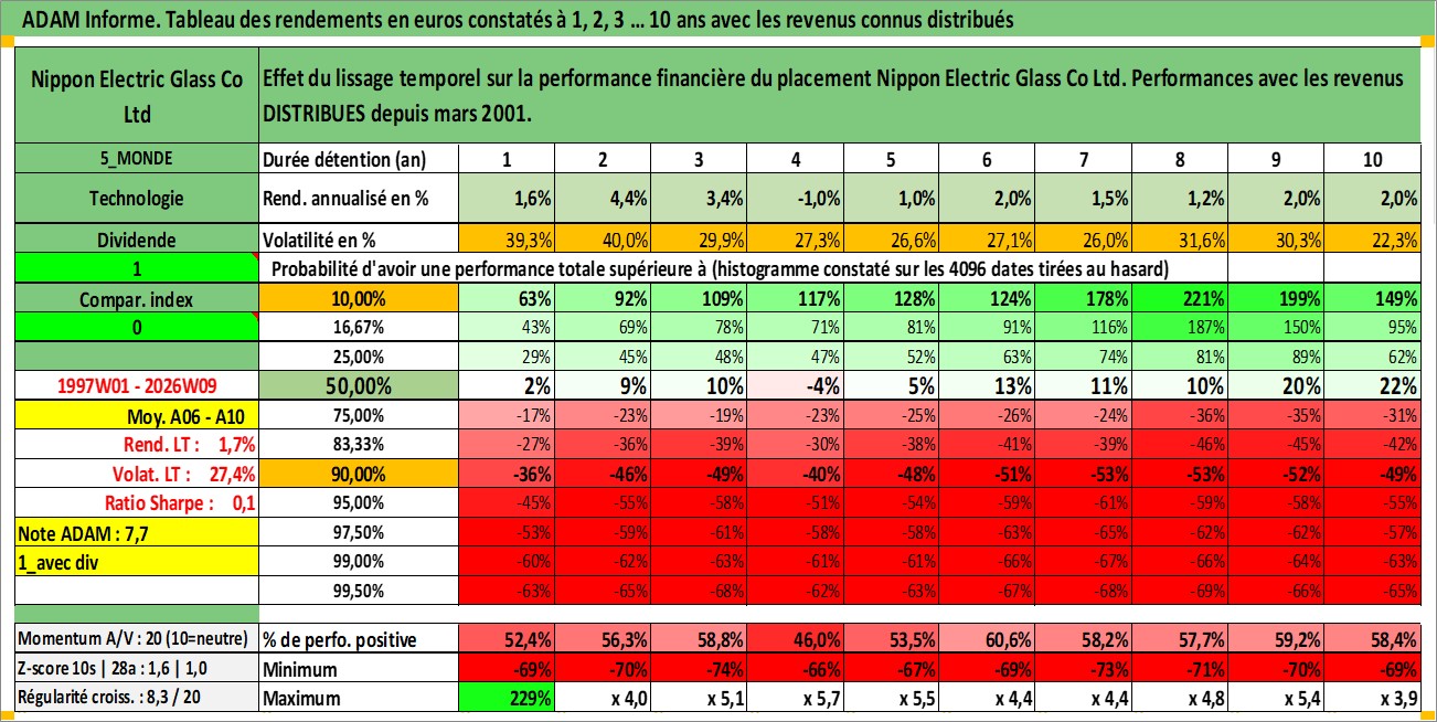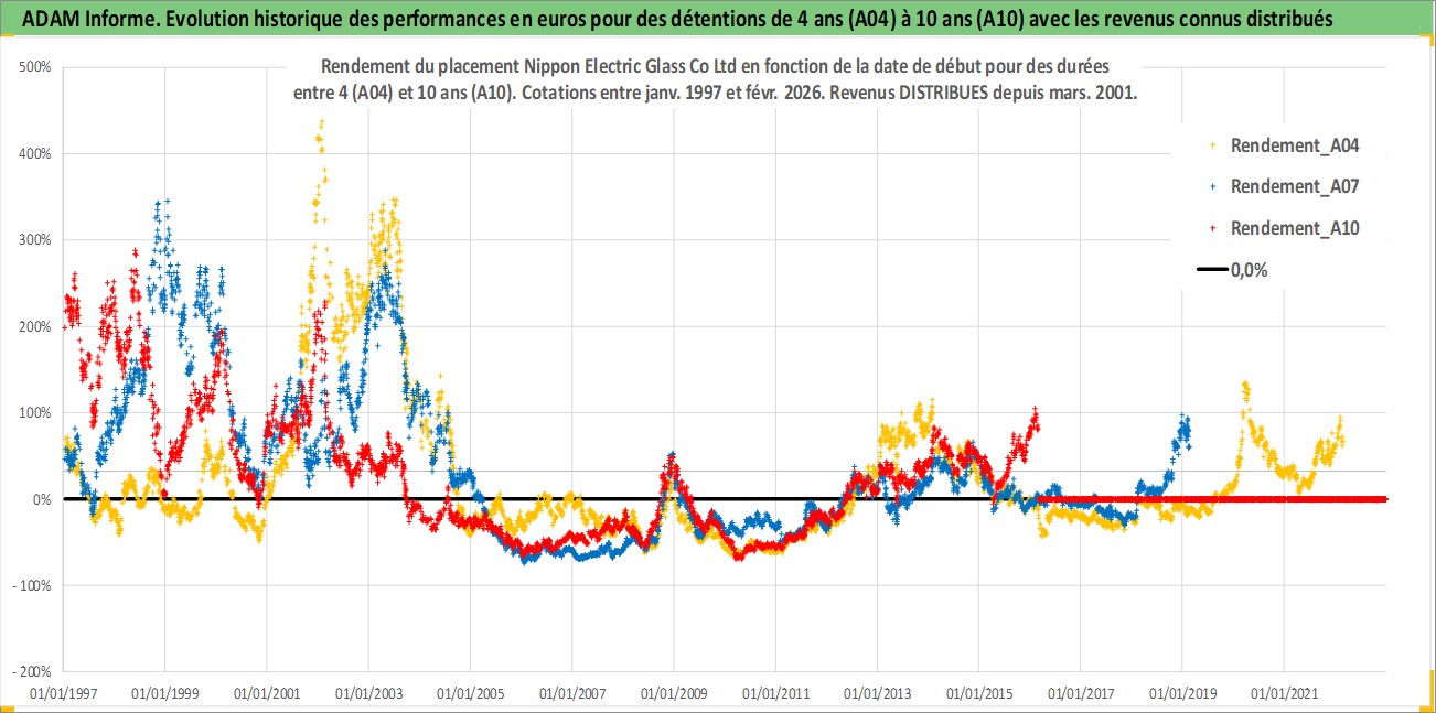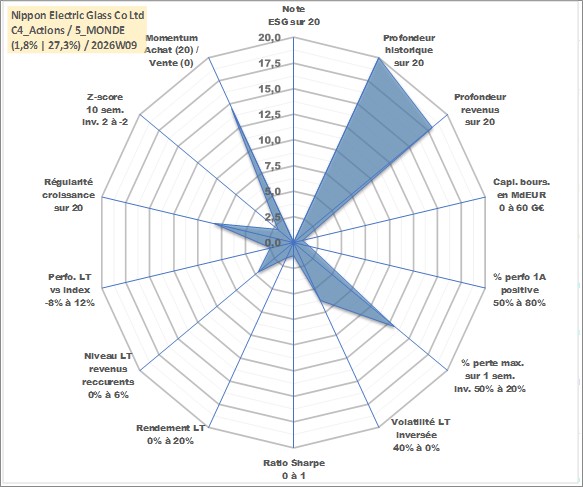 Site dédié aux investisseursPage dédiée sur site financeAnalyse des valorisations hebdomadaires de l'action Nippon Electric Glass Co Ltd. Cet actif est cote en JPY. Les valorisations sont en contrevaleur EURO et couvrent les semaines 1997W01 a 2026W09. Les revenus de cet actif financier sont pris en compte depuis la semaine 2001W13. La note ESG de cet actif n'est pas connue.