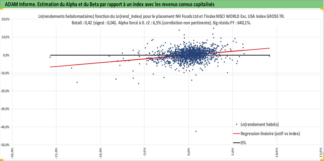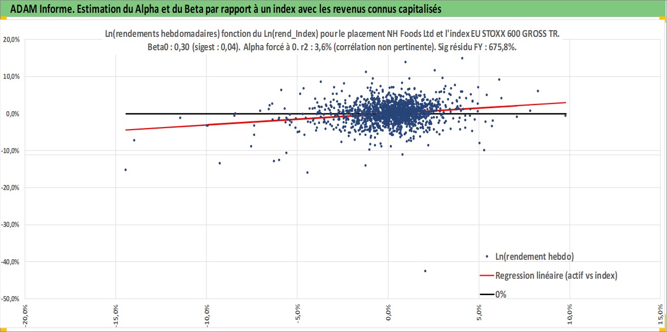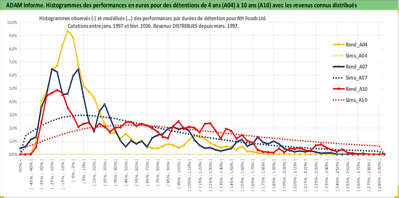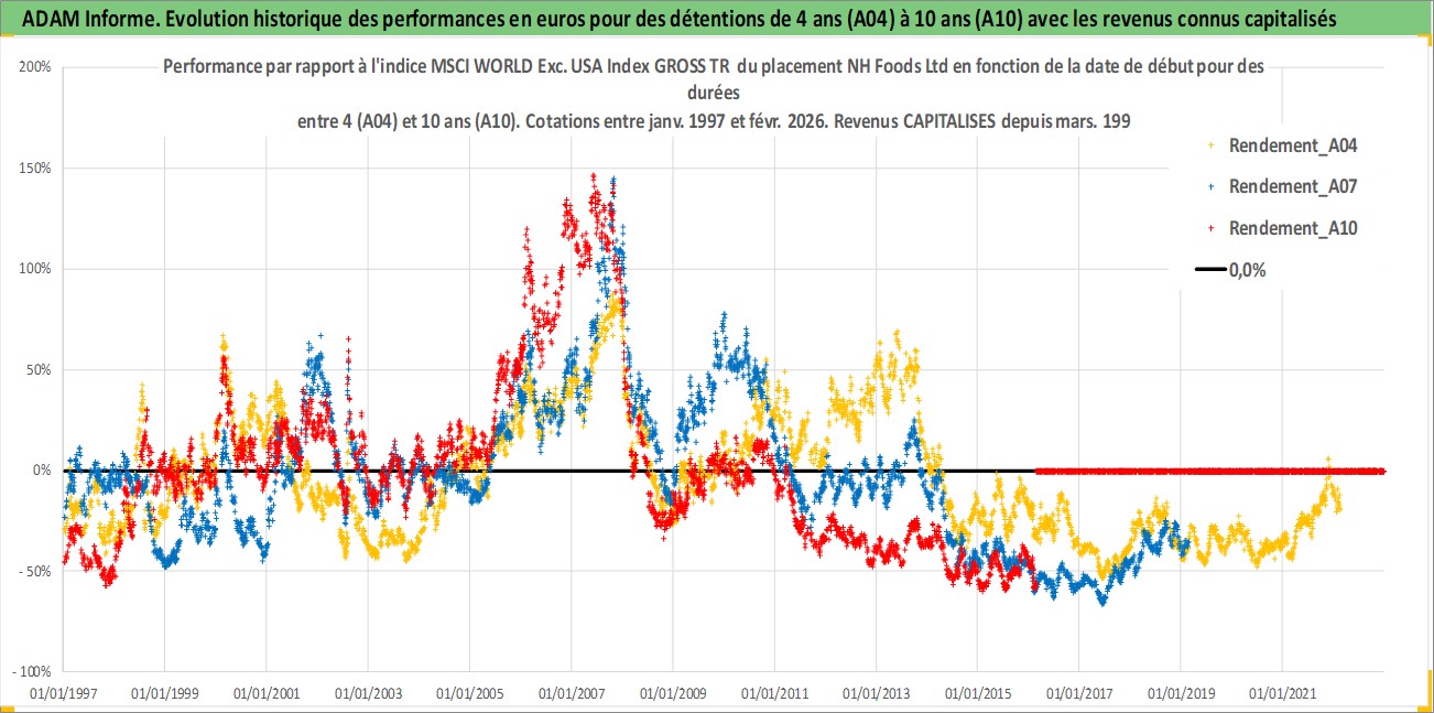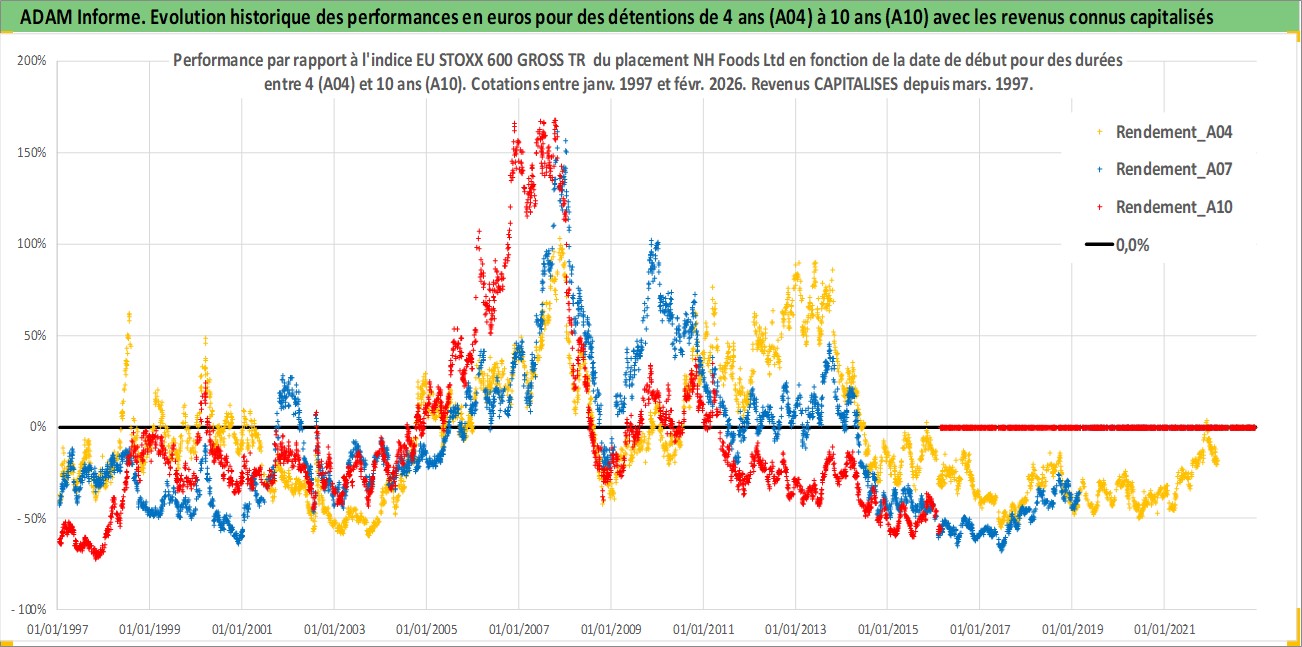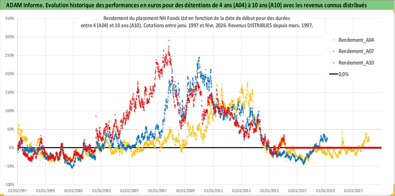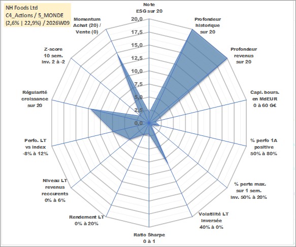 Site dédié aux investisseursPage dédiée sur site financeAnalyse des valorisations hebdomadaires de l'action NH Foods Ltd. Cet actif est cote en JPY. Les valorisations sont en contrevaleur EURO et couvrent les semaines 1997W01 a 2026W09. Les revenus de cet actif financier sont pris en compte depuis la semaine 1997W13. La note globale ESG de cet actif est estimee a 2.0 (apres rebasage entre 0 et 20).