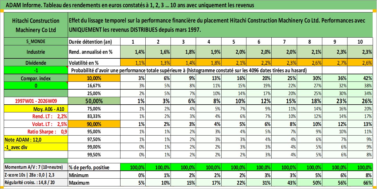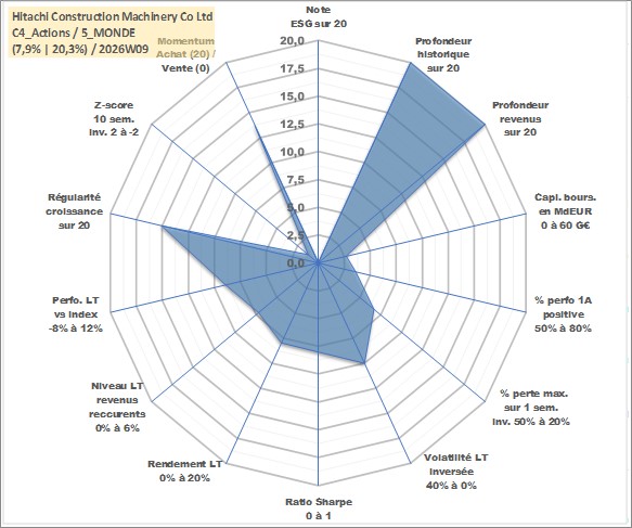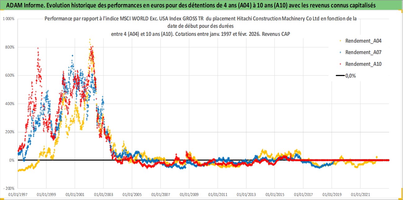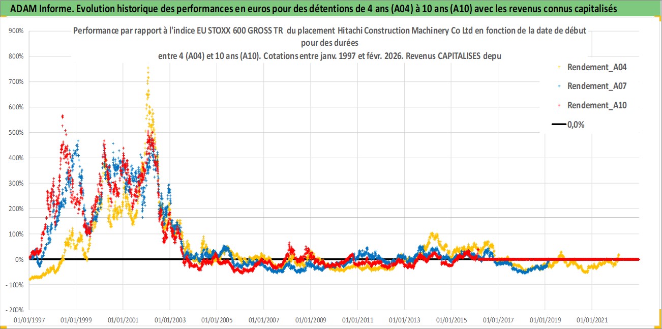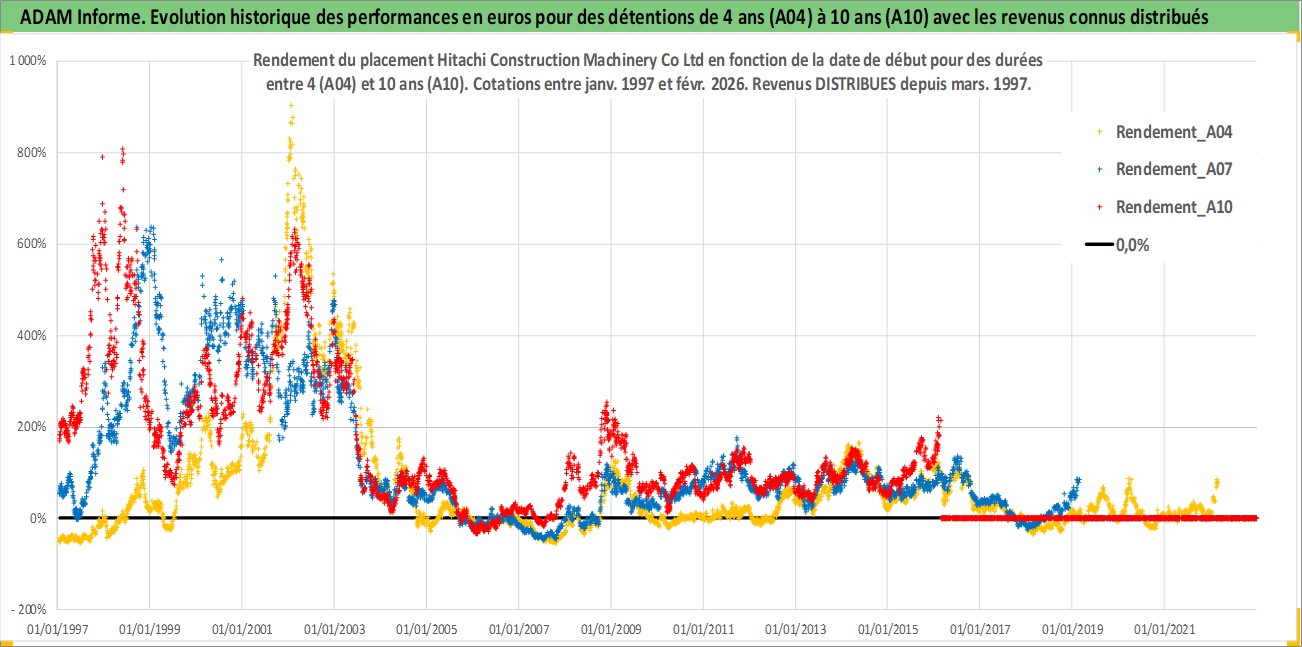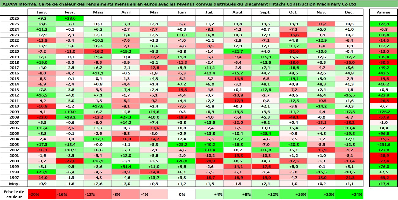 Site dédié aux investisseursPage dédiée sur site financeAnalyse des valorisations hebdomadaires de l'action Hitachi Construction Machinery Co Ltd. Cet actif est cote en JPY. Les valorisations sont en contrevaleur EURO et couvrent les semaines 1997W01 a 2026W09. Les revenus de cet actif financier sont pris en compte depuis la semaine 1997W13. La note ESG de cet actif n'est pas connue.