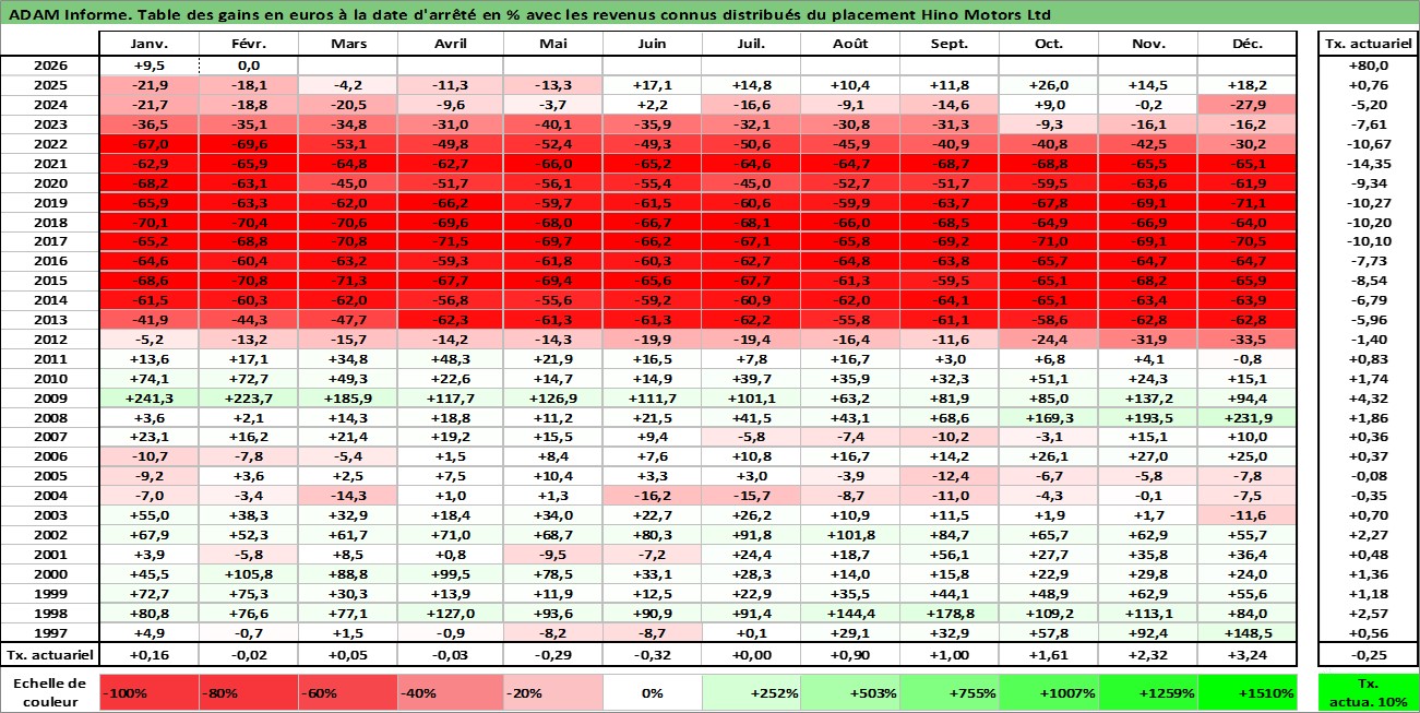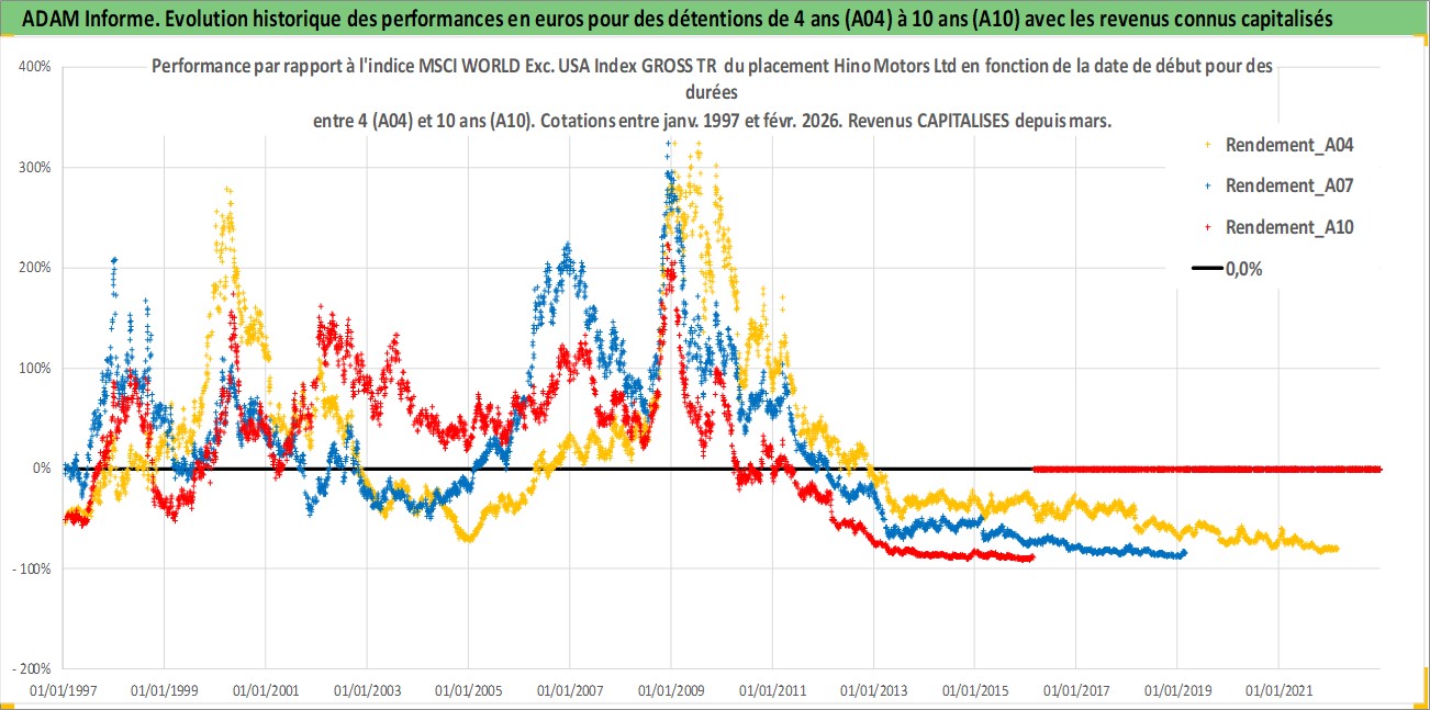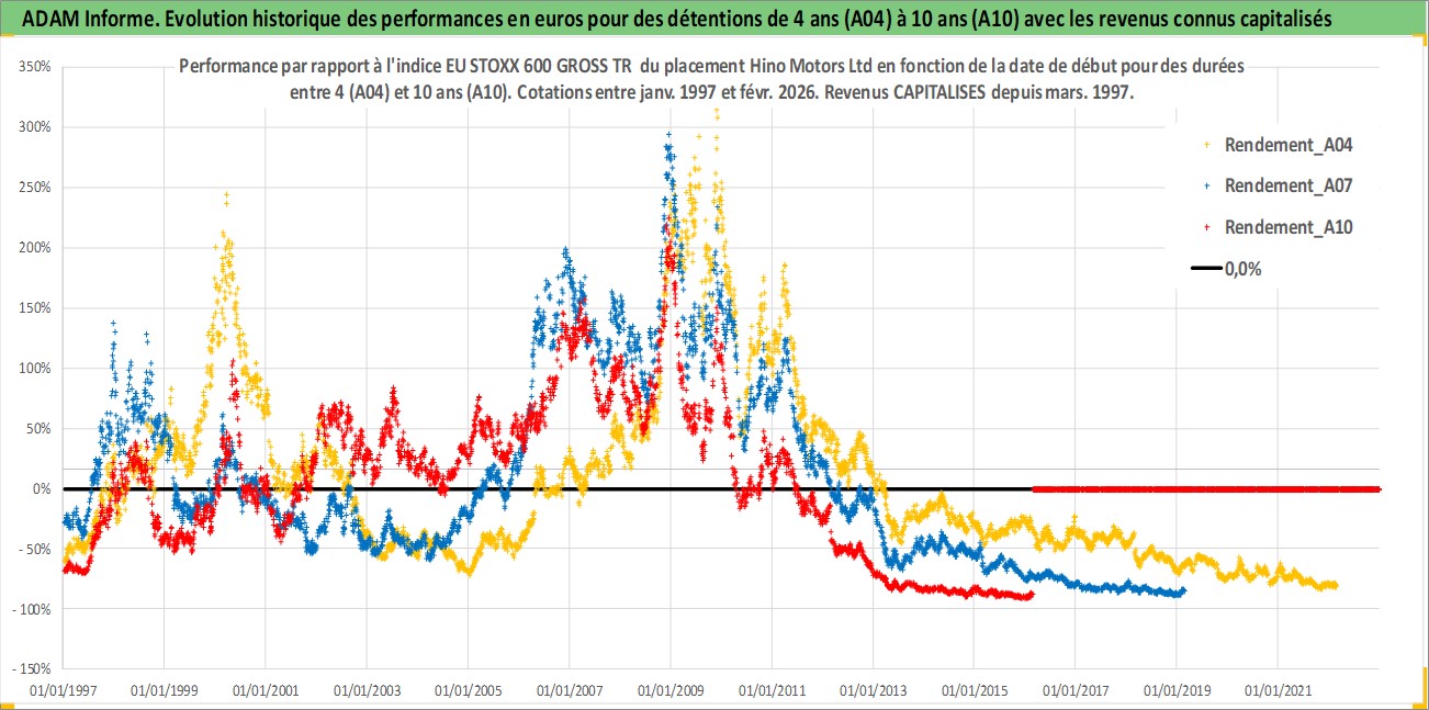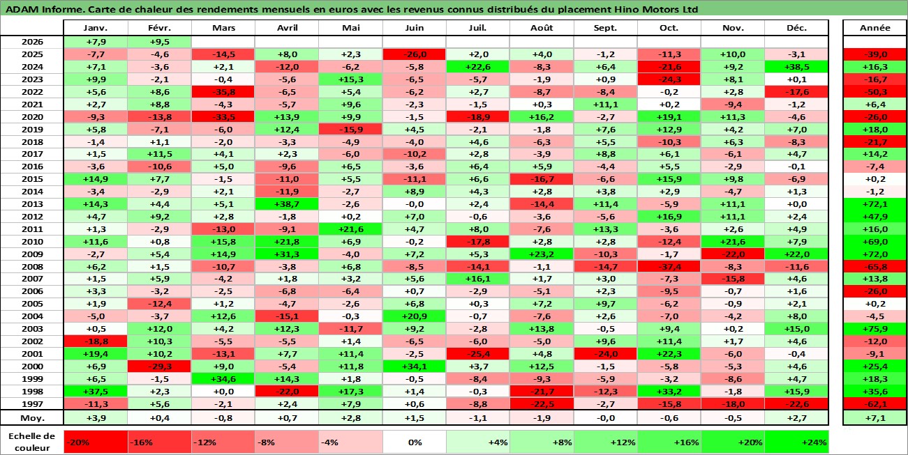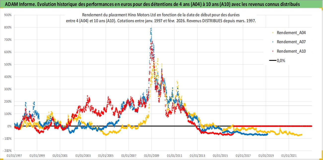 Site dédié aux investisseursPage dédiée sur site financeAnalyse des valorisations hebdomadaires de l'action Hino Motors Ltd. Cet actif est cote en JPY. Les valorisations sont en contrevaleur EURO et couvrent les semaines 1997W01 a 2026W09. Les revenus de cet actif financier sont pris en compte depuis la semaine 1997W13. La note globale ESG de cet actif est estimee a 4.0 (apres rebasage entre 0 et 20).